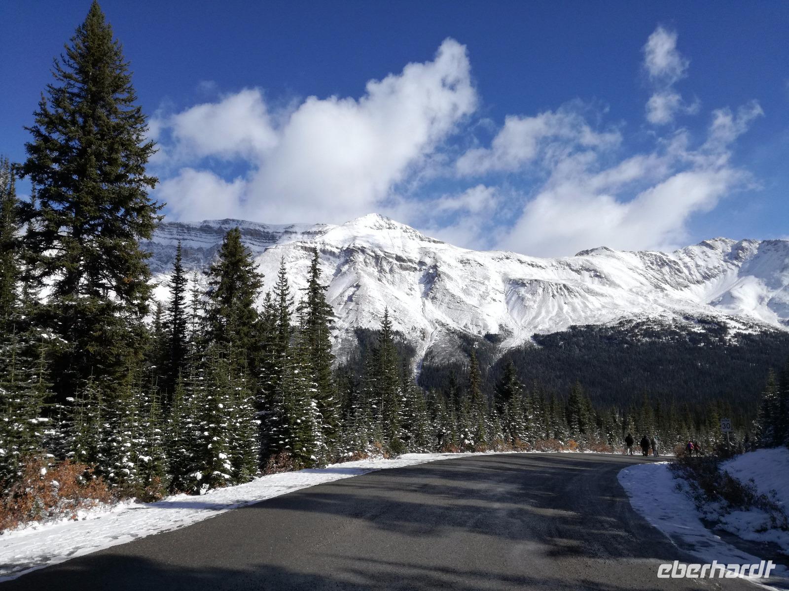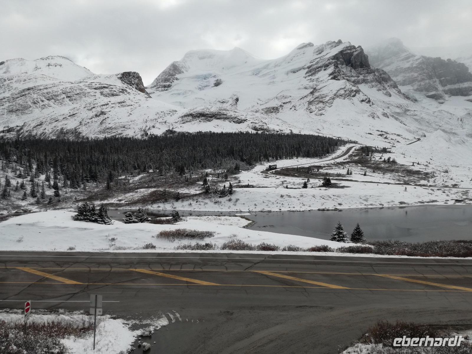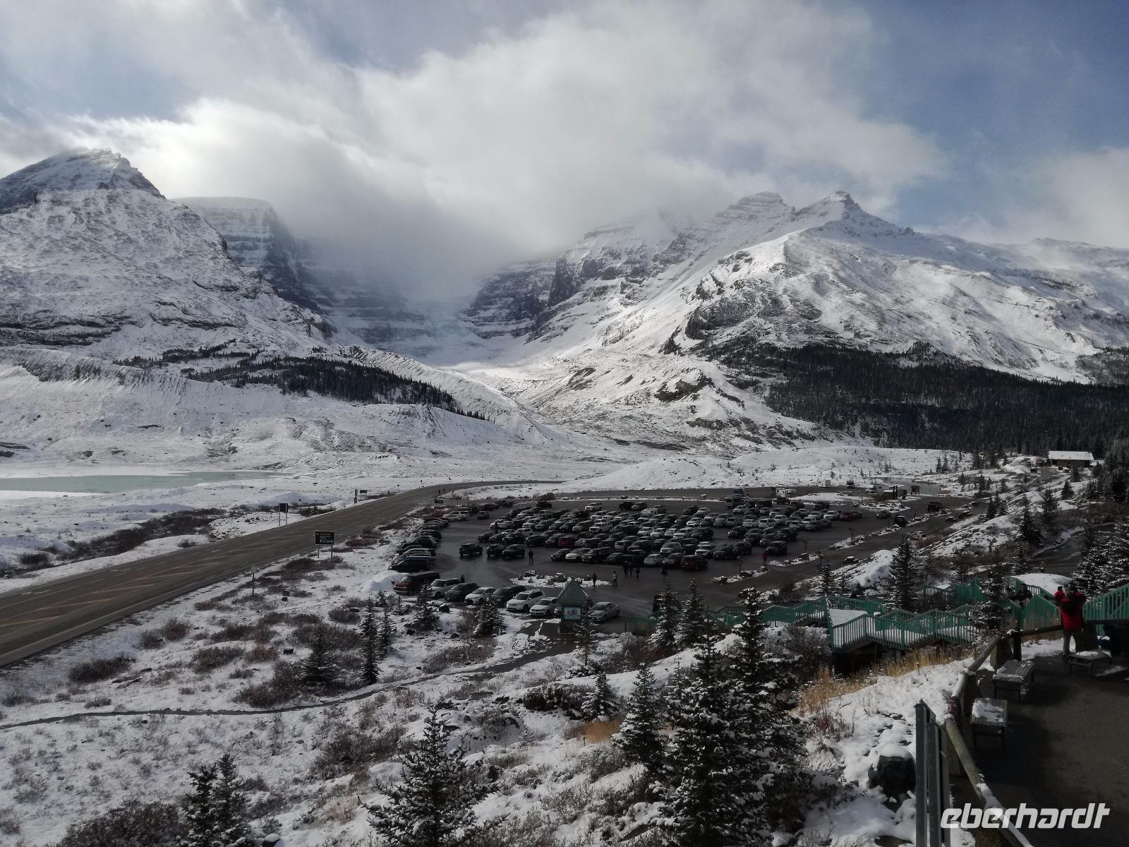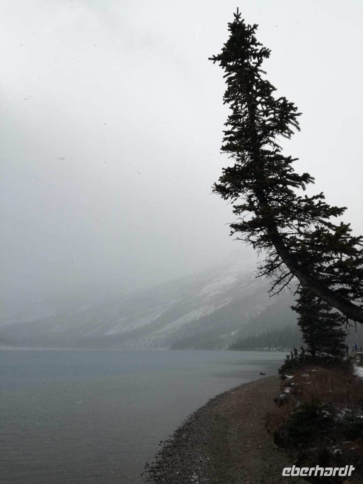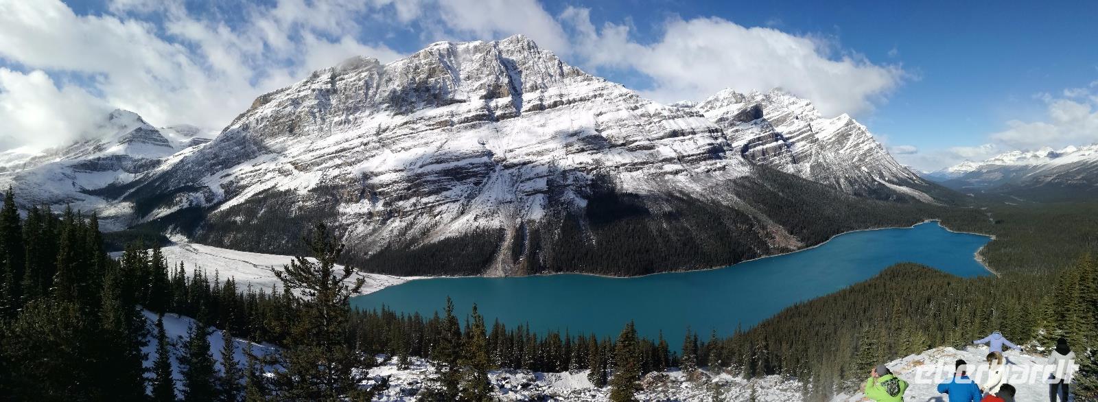 Noch beeindruckt vom Vortag brachen wir mit gepackten Koffer auf in Richtung Lake Louise. Der bezaubernde See lag leider noch etwas im Nebel, aber wir wärmten uns zunächst einmal im Fairmont Chateau Lake Louise bei einem Kaffee auf. Der See wurde nach der Tochter von Königin Victoria, Prinzessin Louise Caroline Alberta benannt. Das Chateau wurde ursprünglich 1890 als kleines Chalet erbaut und nach einem Feuer 1924 als elegantes Hotel wieder aufgebaut. Nach einer kurzen Zeit zeigte sich auch die Sonne und der Lake Louise erstrahlt in einem wundervollen türkisblau. Der Lake Louis erhält seiner Farbe durch Steinmehl, das vom Gletscherwasser in den See gespült wird und es somit in der kraftvollen Farbe erscheinen lässt. Weiter ging unsere Route über den Icefield Parkway zum Bow Lake. Hier wurde der Nebel wieder etwas dichter und es begann zu schneien. Die Schönheit des Sees minderte dies aber nicht. Im Gegenteil. Die Schneebedeckte Landschaft ließ den See in einem saftigen Blau leuchten. Nach einem kurzen Aufenthalt ging es weiter zum Lake Peyto. Für mich persönlich der schönste Fotostopp der Reise. Doch zunächst musste die Gruppe eine Eisbahn überwinden. Aber die Mühe wurde belohnt. Der Ausblick auf den See war atemberaubend. Die auffälligen Türkise Farbe strahlte in Front des schneebedeckten Berge. Dieser einmalige Blick auf den See ließ uns alle innehalten. Nachdem wir genügend Bilder geschossen und den Ausblick genossen hatten, ging es wieder in Richtung Bus. Nach einer Mittagspause ging es weiter auf dem Highway 93, auch Icefield Parkway genannt. Ein weiterer Stopp erfolgte am Sunwapta Pass. Auf über 2.000 Meter Höhe wurde uns erstmal die Weite des Landes und Höhe des Highways und des Passes bewusst. Gleichzeitig bildet der Sunwapta Pass auch die Grenze zwischen Banff und Jasper Nationalpark. Nach nur wenigen weiteren Kilometern erreichten wir auch das Besucherzentrum des Athabasca-Gletschers. Hier hatten wir etwas Zeit zur freien Verfügung. Manche schauten einen sehr interessanten Film über den Gletscher, manche bauten einen kleinen Schneemann und manchen genoss die Faszination des Gletschers bei einem Kaffee auf der Terrasse. Gegen Nachmittag ging es weiter durch den Jasper Nationalpark. Unsere heutige Übernachtung war in Bungalow umgeben von Natur. Nach den wir die Unterkünfte bezogen haben, machten wir noch einen Spaziergang zu den Sunwapta Wasserfällen. Abends ließen wir den aufregenden Tag bei einem gemeinsamen Abendessen ausklingen.