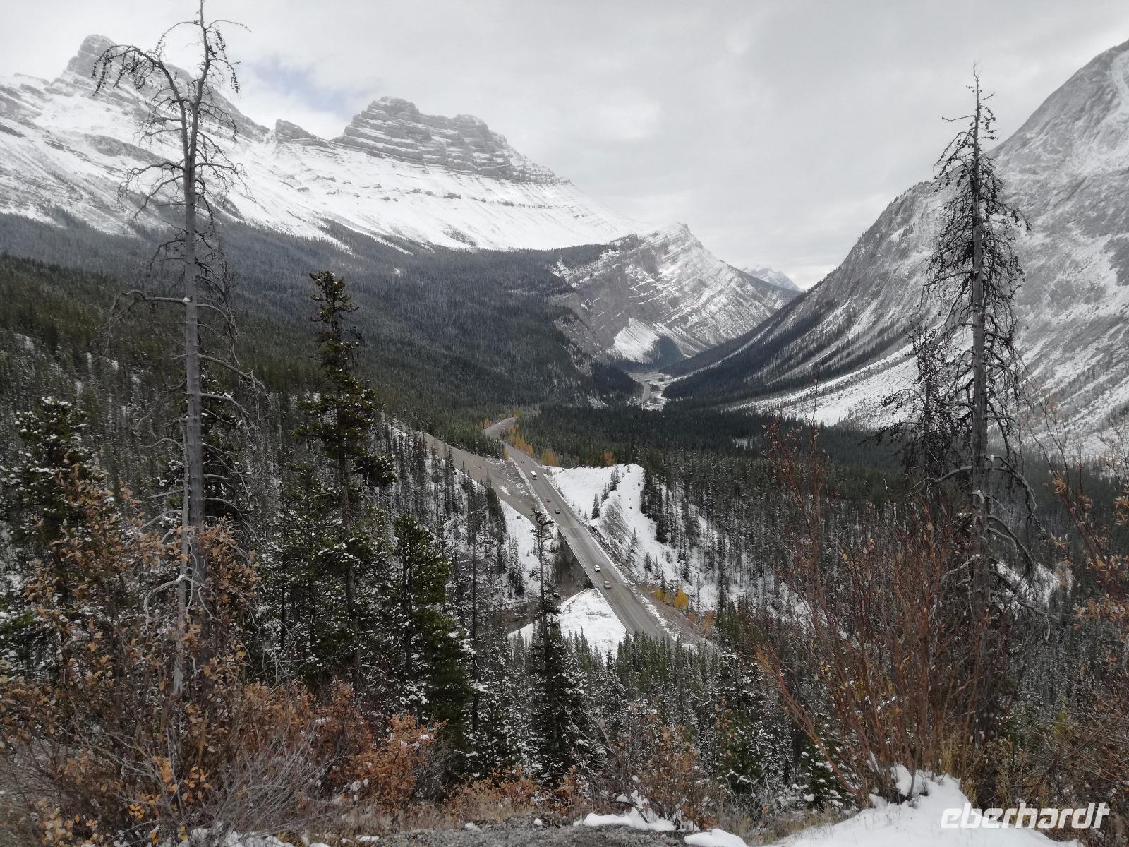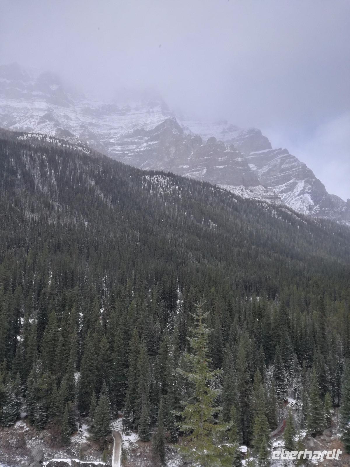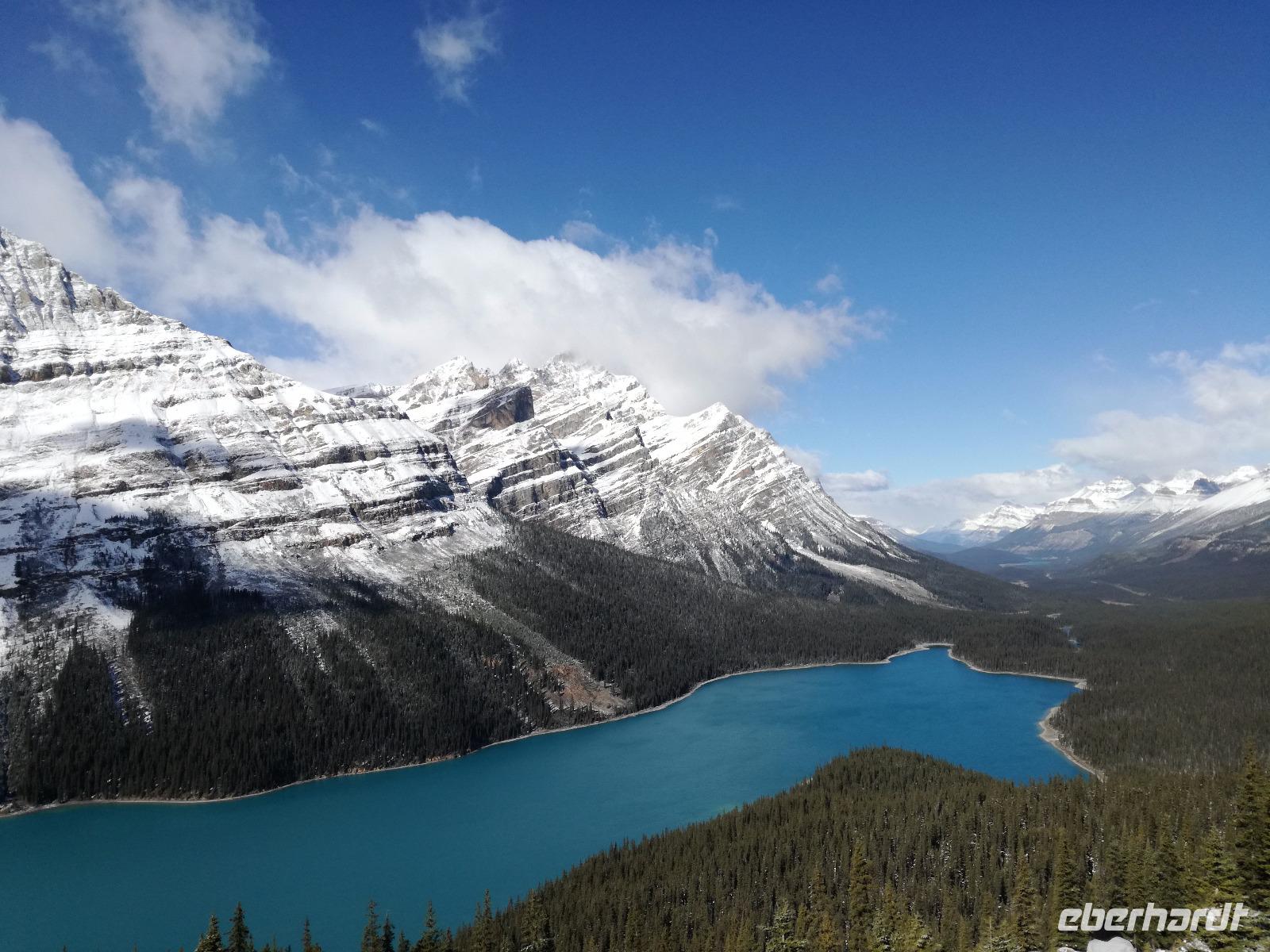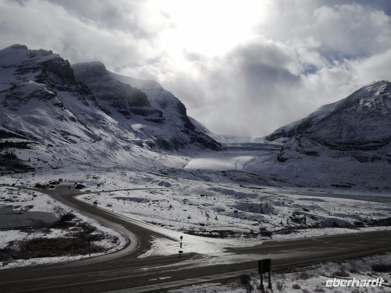 Noch beeindruckt vom Vortag brachen wir mit gepackten Koffer auf in Richtung Lake Louise. Der bezaubernde See lag leider noch etwas im Nebel, aber wir wärmten uns zunächst einmal im Fairmont Chateau Lake Louise bei einem Kaffee auf. Der See wurde nach der Tochter von Königin Victoria, Prinzessin Louise Caroline Alberta benannt. Das Chateau wurde ursprünglich 1890 als kleines Chalet erbaut und nach einem Feuer 1924 als elegantes Hotel wieder aufgebaut. Nach einer kurzen Zeit zeigte sich auch die Sonne und der Lake Louise erstrahlt in einem wundervollen türkisblau. Der Lake Louis erhält seiner Farbe durch Steinmehl, das vom Gletscherwasser in den See gespült wird und es somit in der kraftvollen Farbe erscheinen lässt. Weiter ging unsere Route über den Icefield Parkway zum Bow Lake. Hier wurde der Nebel wieder etwas dichter und es begann zu schneien. Die Schönheit des Sees minderte dies aber nicht. Im Gegenteil. Die Schneebedeckte Landschaft ließ den See in einem saftigen Blau leuchten. Nach einem kurzen Aufenthalt ging es weiter zum Lake Peyto. Für mich persönlich der schönste Fotostopp der Reise. Doch zunächst musste die Gruppe eine Eisbahn überwinden. Aber die Mühe wurde belohnt. Der Ausblick auf den See war atemberaubend. Die auffälligen Türkise Farbe strahlte in Front des schneebedeckten Berge. Dieser einmalige Blick auf den See ließ uns alle innehalten. Nachdem wir genügend Bilder geschossen und den Ausblick genossen hatten, ging es wieder in Richtung Bus. Nach einer Mittagspause ging es weiter auf dem Highway 93, auch Icefield Parkway genannt. Ein weiterer Stopp erfolgte am Sunwapta Pass. Auf über 2.000 Meter Höhe wurde uns erstmal die Weite des Landes und Höhe des Highways und des Passes bewusst. Gleichzeitig bildet der Sunwapta Pass auch die Grenze zwischen Banff und Jasper Nationalpark. Nach nur wenigen weiteren Kilometern erreichten wir auch das Besucherzentrum des Athabasca-Gletschers. Hier hatten wir etwas Zeit zur freien Verfügung. Manche schauten einen sehr interessanten Film über den Gletscher, manche bauten einen kleinen Schneemann und manchen genoss die Faszination des Gletschers bei einem Kaffee auf der Terrasse. Gegen Nachmittag ging es weiter durch den Jasper Nationalpark. Unsere heutige Übernachtung war in Bungalow umgeben von Natur. Nach den wir die Unterkünfte bezogen haben, machten wir noch einen Spaziergang zu den Sunwapta Wasserfällen. Abends ließen wir den aufregenden Tag bei einem gemeinsamen Abendessen ausklingen.