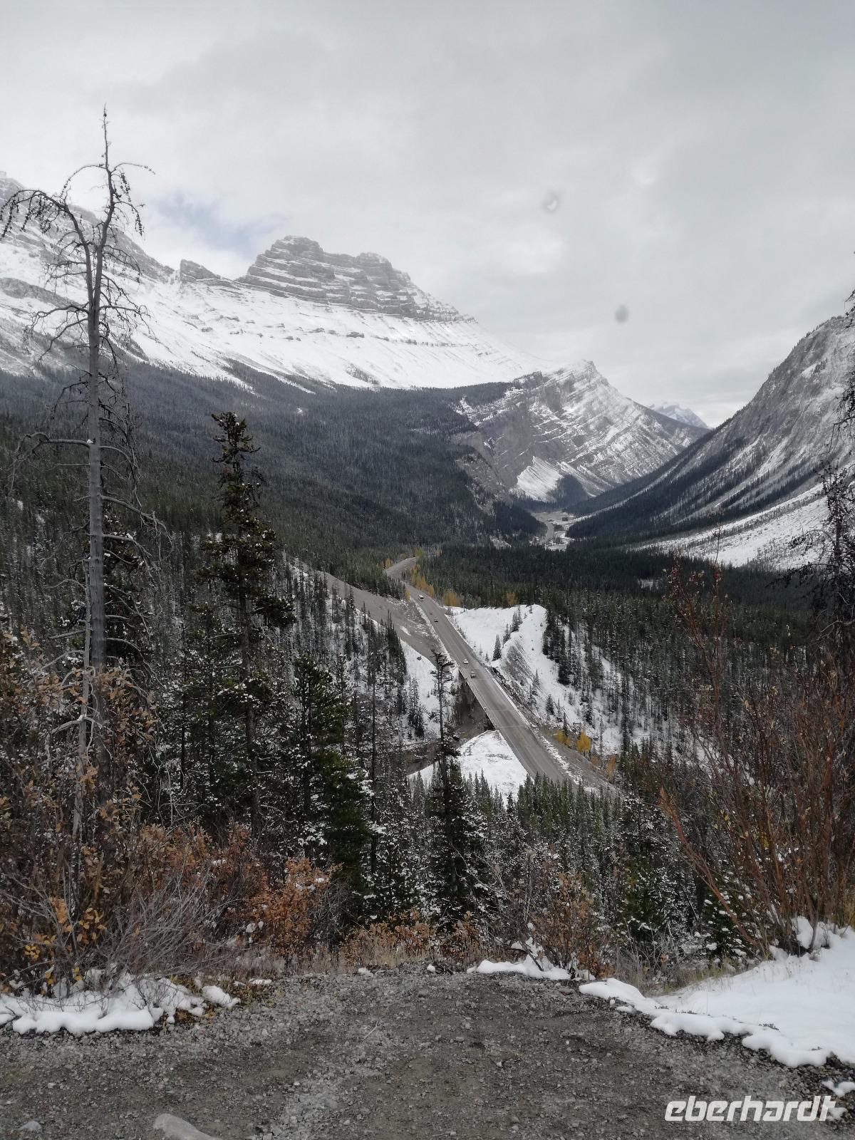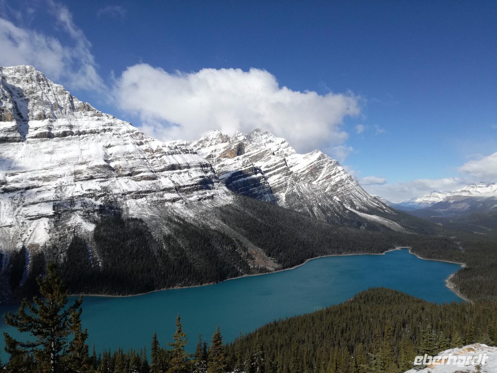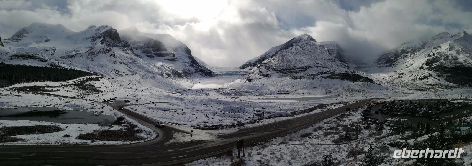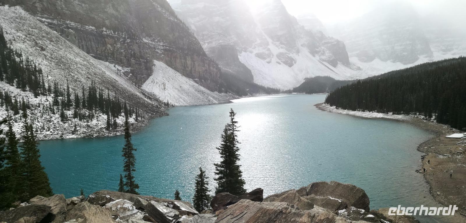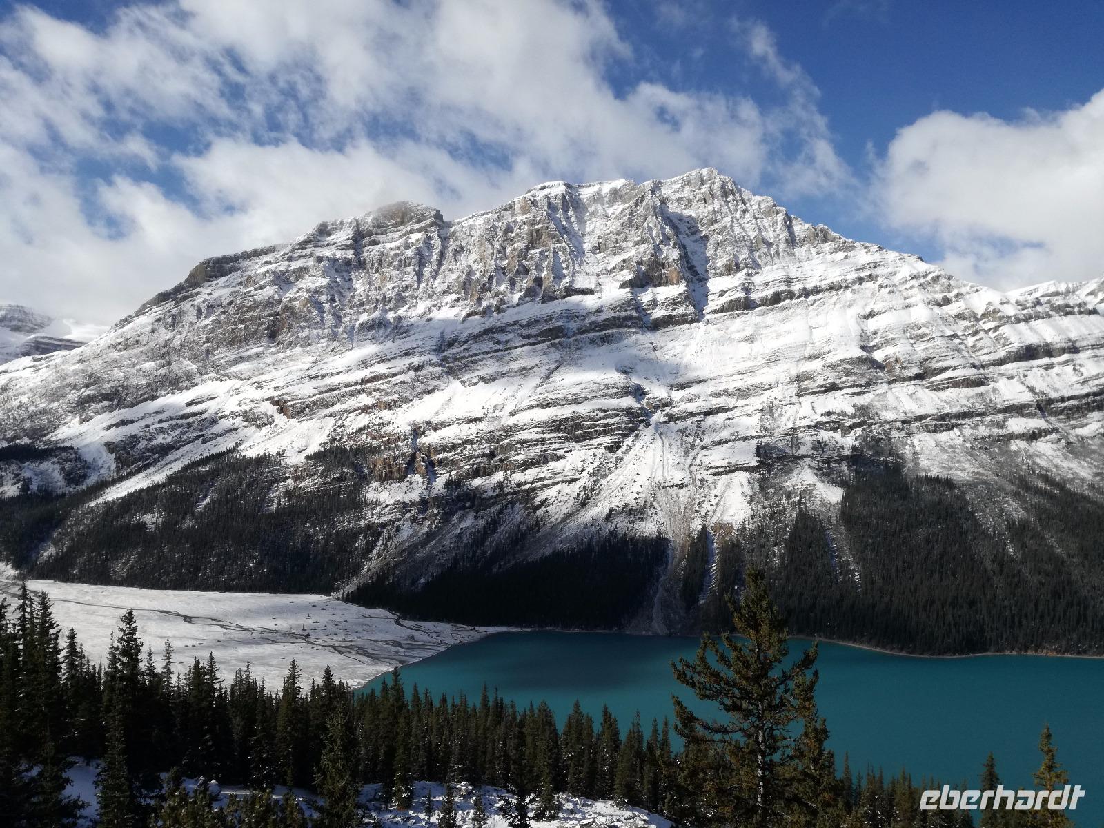 Noch beeindruckt vom Vortag brachen wir mit gepackten Koffer auf in Richtung Lake Louise. Der bezaubernde See lag leider noch etwas im Nebel, aber wir wärmten uns zunächst einmal im Fairmont Chateau Lake Louise bei einem Kaffee auf. Der See wurde nach der Tochter von Königin Victoria, Prinzessin Louise Caroline Alberta benannt. Das Chateau wurde ursprünglich 1890 als kleines Chalet erbaut und nach einem Feuer 1924 als elegantes Hotel wieder aufgebaut. Nach einer kurzen Zeit zeigte sich auch die Sonne und der Lake Louise erstrahlt in einem wundervollen türkisblau. Der Lake Louis erhält seiner Farbe durch Steinmehl, das vom Gletscherwasser in den See gespült wird und es somit in der kraftvollen Farbe erscheinen lässt. Weiter ging unsere Route über den Icefield Parkway zum Bow Lake. Hier wurde der Nebel wieder etwas dichter und es begann zu schneien. Die Schönheit des Sees minderte dies aber nicht. Im Gegenteil. Die Schneebedeckte Landschaft ließ den See in einem saftigen Blau leuchten. Nach einem kurzen Aufenthalt ging es weiter zum Lake Peyto. Für mich persönlich der schönste Fotostopp der Reise. Doch zunächst musste die Gruppe eine Eisbahn überwinden. Aber die Mühe wurde belohnt. Der Ausblick auf den See war atemberaubend. Die auffälligen Türkise Farbe strahlte in Front des schneebedeckten Berge. Dieser einmalige Blick auf den See ließ uns alle innehalten. Nachdem wir genügend Bilder geschossen und den Ausblick genossen hatten, ging es wieder in Richtung Bus. Nach einer Mittagspause ging es weiter auf dem Highway 93, auch Icefield Parkway genannt. Ein weiterer Stopp erfolgte am Sunwapta Pass. Auf über 2.000 Meter Höhe wurde uns erstmal die Weite des Landes und Höhe des Highways und des Passes bewusst. Gleichzeitig bildet der Sunwapta Pass auch die Grenze zwischen Banff und Jasper Nationalpark. Nach nur wenigen weiteren Kilometern erreichten wir auch das Besucherzentrum des Athabasca-Gletschers. Hier hatten wir etwas Zeit zur freien Verfügung. Manche schauten einen sehr interessanten Film über den Gletscher, manche bauten einen kleinen Schneemann und manchen genoss die Faszination des Gletschers bei einem Kaffee auf der Terrasse. Gegen Nachmittag ging es weiter durch den Jasper Nationalpark. Unsere heutige Übernachtung war in Bungalow umgeben von Natur. Nach den wir die Unterkünfte bezogen haben, machten wir noch einen Spaziergang zu den Sunwapta Wasserfällen. Abends ließen wir den aufregenden Tag bei einem gemeinsamen Abendessen ausklingen.