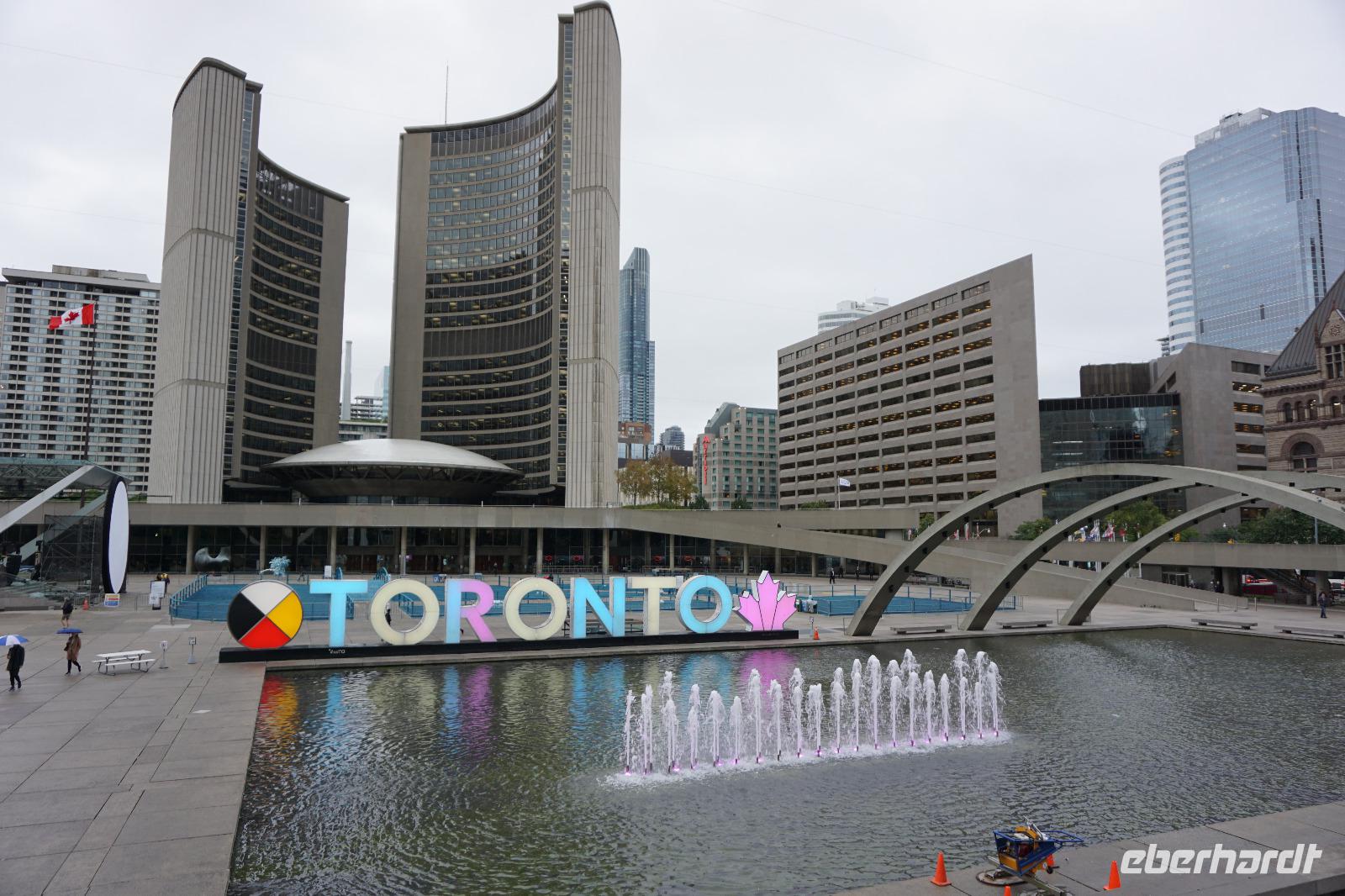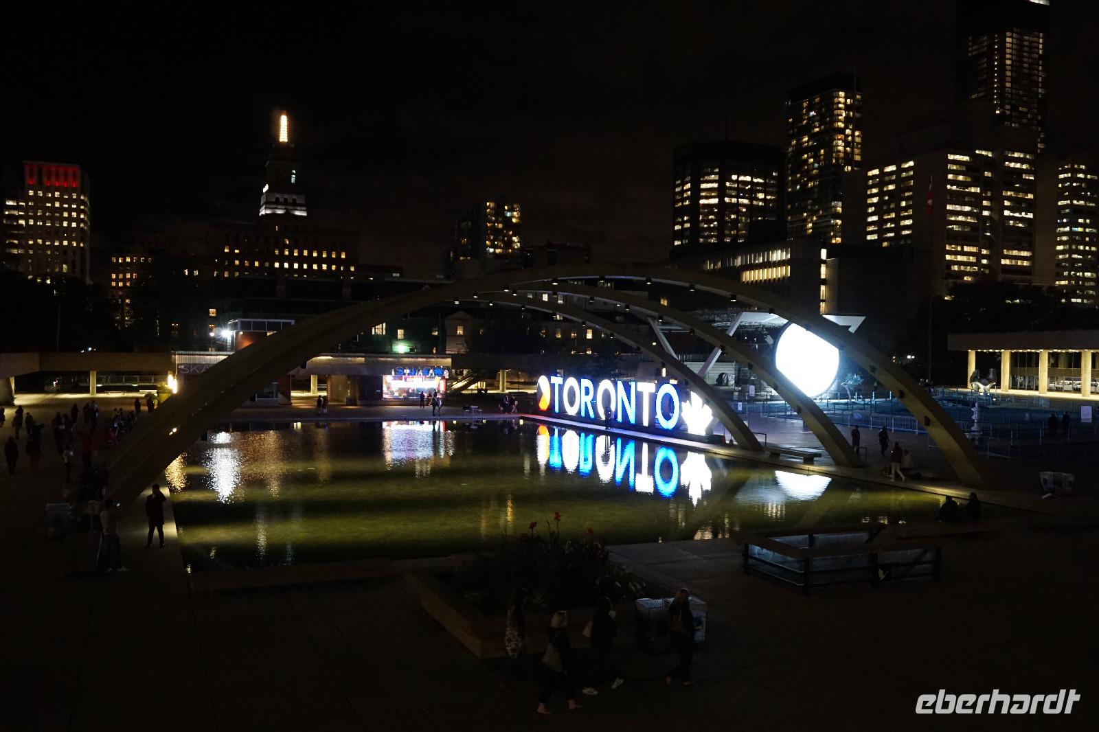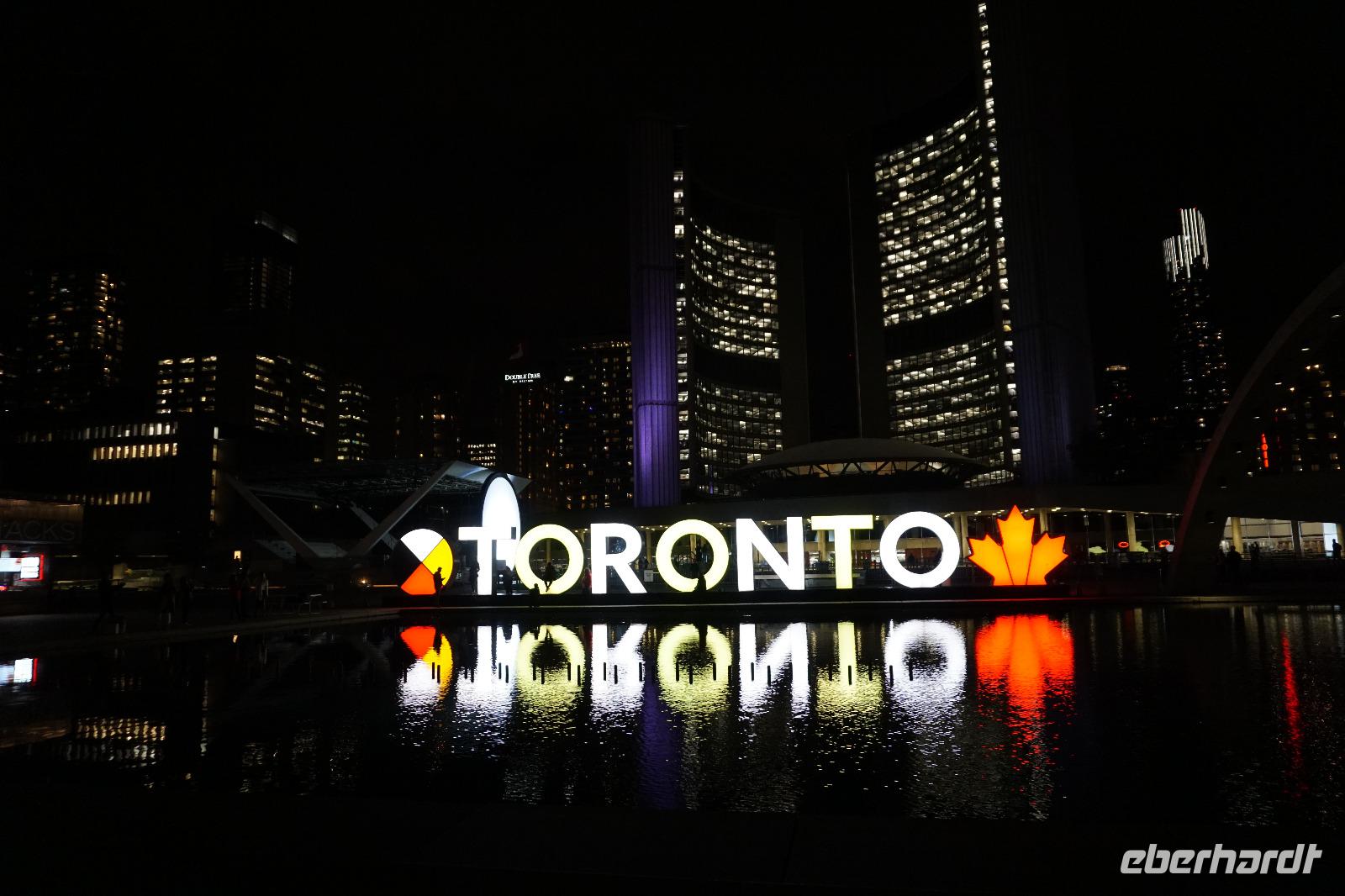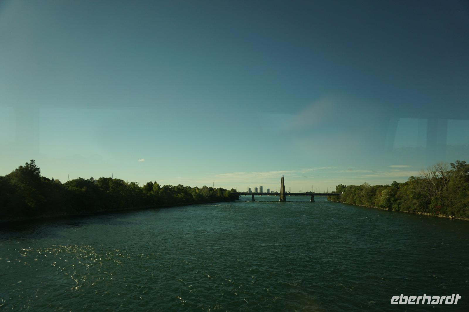 Am frühen Vormittag luden wir (oder eher Simon) unsere Koffer in den Bus und brachen mit Marion zu einer Stadtführung auf. Vorbei an der Sparks Street und dem Terry Fox Denkmal liefen wir zum Gelände des Parlaments mit der Centennial Flame, einer symbolischen Flamme zwischen den Wappen der Provinzen und Territorien Kanadas, inmitten eines Springbrunnens. Neben dem imposanten Hotel Chateau Laurier bestaunten wir die meisten Schleusen auf einer Stelle, die Ottawa Locks mit acht Schleusen. Insgesamt gibt es 43 Schleusen auf dem Rideau Kanal. Im Winter wird das Wasser des Kanals größtenteils abgelassen, dieser friert zu und wird zur Eislaufbahn für Einheimische und Touristen. Gegenüber der Ottawa Locks befand sich das Nationale Kriegsdenkmal, eine Erinnerungsstätte an die vielen gefallenen kanadischen Soldaten im Ersten Weltkrieg und aller späteren Kriege. Am Hotel stiegen wir wieder in den Bus ein und setzten unsere Stadtrundfahrt fort. Wir fuhren durch das Botschaftsviertel entlang des Ottawa Flusses, wo wir auf der anderen Seite Gatineau erblicken konnten. Wir spazierten durch den Rideau Hall Park. Anschließend verließen wir Ottawa, um weiter Richtung Osten zu fahren. Unterwegs spielte uns Marion verschiedene Lieder vor, darunter auch die kanadische Nationalhymne. Durch den kleinen Ort Brockville mit Häusern im viktorianischen Stil fuhren wir nach Rockport, wo wir eine Bootsfahrt entlang der berühmten 1000 Inseln antraten. Die Inseln liegen am Abfluss des Ontariosees in der Grenzregion zwischen den USA und Kanada. Hier findet man ebenfalls die angeblich kleinste internationale Brücke der Welt. Im Anschluss an unsere Fahrt auf dem Wasser ließen wir es uns in einem kleinen Restaurant zum Mittagessen schmecken. Zum Salat reichte man uns das typische 1000-Inseln-Dressing, was sehr gut schmeckte. Entlang des 1000 Insel Parkway fuhren wir weiter in die Garnissionsstadt Kingston, wo wir Zeit zum Verweilen hatten. Die Stadt mit über 120.000 Einwohner liegt am nordöstlichen Ende des Ontariosees. Auf der Weiterfahrt nach Toronto erzählte uns Marion viel Wissenswertes über das kanadische Schul- und Rentensystem. Am Abend erreichten wir unser Hotel in Toronto, welches mitten im belebten Zentrum der Stadt lag. Bei einem abendlichen Spaziergang durch die beleuchtete Stadt, erhaschten wir erste Blicke auf den Yonge-Dundas Square, in das Eaton Centre und auf das Toronto-Schild vor dem neuen Rathaus.