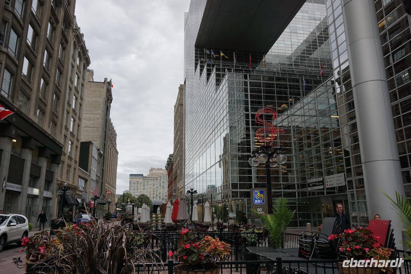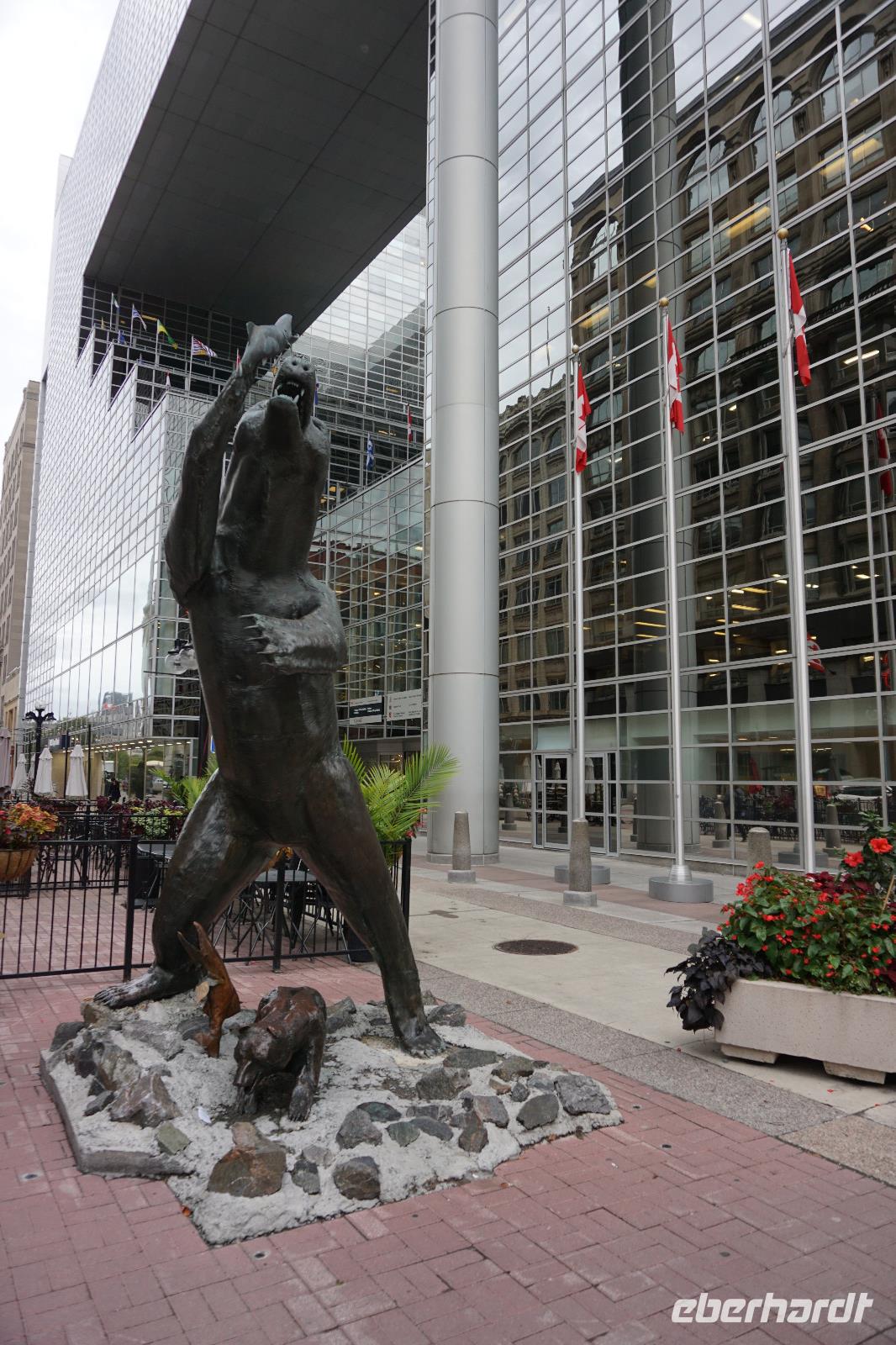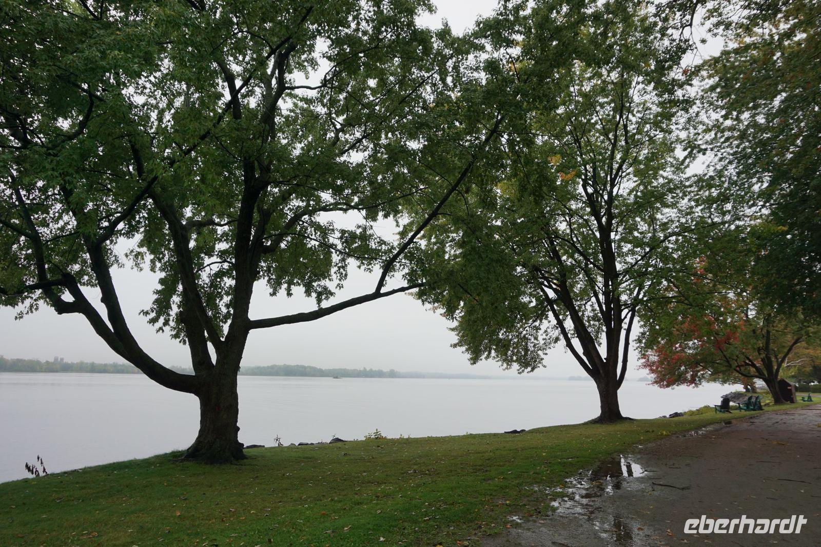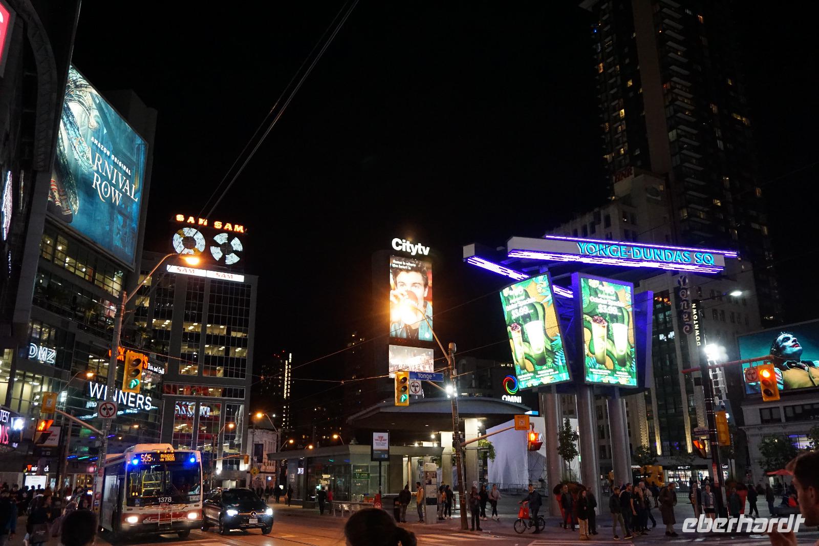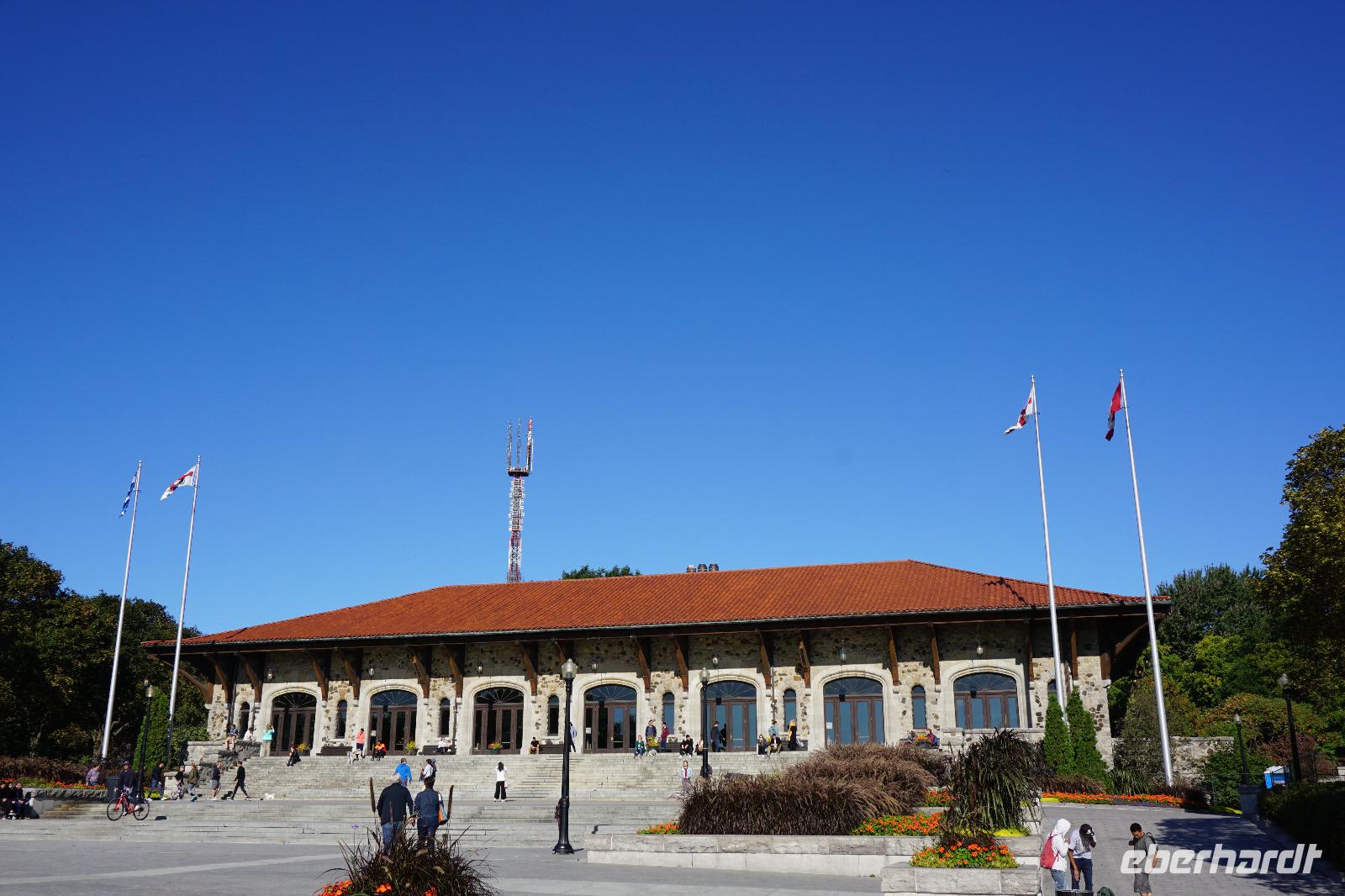 Am frühen Vormittag luden wir (oder eher Simon) unsere Koffer in den Bus und brachen mit Marion zu einer Stadtführung auf. Vorbei an der Sparks Street und dem Terry Fox Denkmal liefen wir zum Gelände des Parlaments mit der Centennial Flame, einer symbolischen Flamme zwischen den Wappen der Provinzen und Territorien Kanadas, inmitten eines Springbrunnens. Neben dem imposanten Hotel Chateau Laurier bestaunten wir die meisten Schleusen auf einer Stelle, die Ottawa Locks mit acht Schleusen. Insgesamt gibt es 43 Schleusen auf dem Rideau Kanal. Im Winter wird das Wasser des Kanals größtenteils abgelassen, dieser friert zu und wird zur Eislaufbahn für Einheimische und Touristen. Gegenüber der Ottawa Locks befand sich das Nationale Kriegsdenkmal, eine Erinnerungsstätte an die vielen gefallenen kanadischen Soldaten im Ersten Weltkrieg und aller späteren Kriege. Am Hotel stiegen wir wieder in den Bus ein und setzten unsere Stadtrundfahrt fort. Wir fuhren durch das Botschaftsviertel entlang des Ottawa Flusses, wo wir auf der anderen Seite Gatineau erblicken konnten. Wir spazierten durch den Rideau Hall Park. Anschließend verließen wir Ottawa, um weiter Richtung Osten zu fahren. Unterwegs spielte uns Marion verschiedene Lieder vor, darunter auch die kanadische Nationalhymne. Durch den kleinen Ort Brockville mit Häusern im viktorianischen Stil fuhren wir nach Rockport, wo wir eine Bootsfahrt entlang der berühmten 1000 Inseln antraten. Die Inseln liegen am Abfluss des Ontariosees in der Grenzregion zwischen den USA und Kanada. Hier findet man ebenfalls die angeblich kleinste internationale Brücke der Welt. Im Anschluss an unsere Fahrt auf dem Wasser ließen wir es uns in einem kleinen Restaurant zum Mittagessen schmecken. Zum Salat reichte man uns das typische 1000-Inseln-Dressing, was sehr gut schmeckte. Entlang des 1000 Insel Parkway fuhren wir weiter in die Garnissionsstadt Kingston, wo wir Zeit zum Verweilen hatten. Die Stadt mit über 120.000 Einwohner liegt am nordöstlichen Ende des Ontariosees. Auf der Weiterfahrt nach Toronto erzählte uns Marion viel Wissenswertes über das kanadische Schul- und Rentensystem. Am Abend erreichten wir unser Hotel in Toronto, welches mitten im belebten Zentrum der Stadt lag. Bei einem abendlichen Spaziergang durch die beleuchtete Stadt, erhaschten wir erste Blicke auf den Yonge-Dundas Square, in das Eaton Centre und auf das Toronto-Schild vor dem neuen Rathaus.