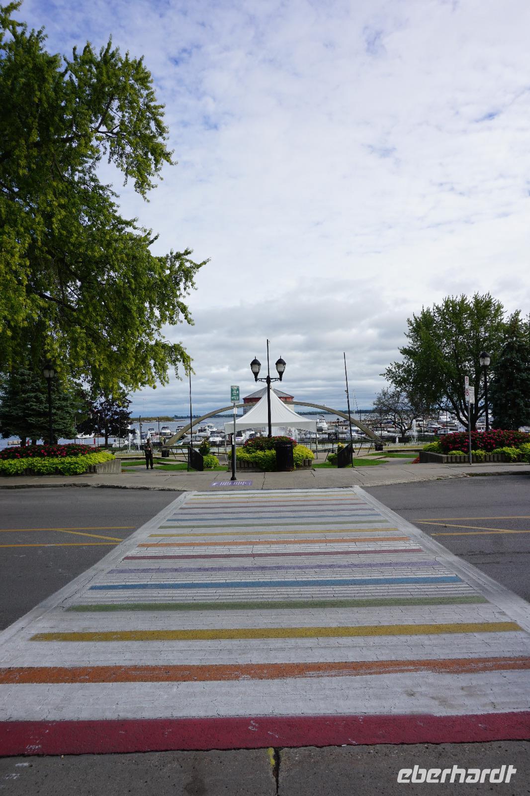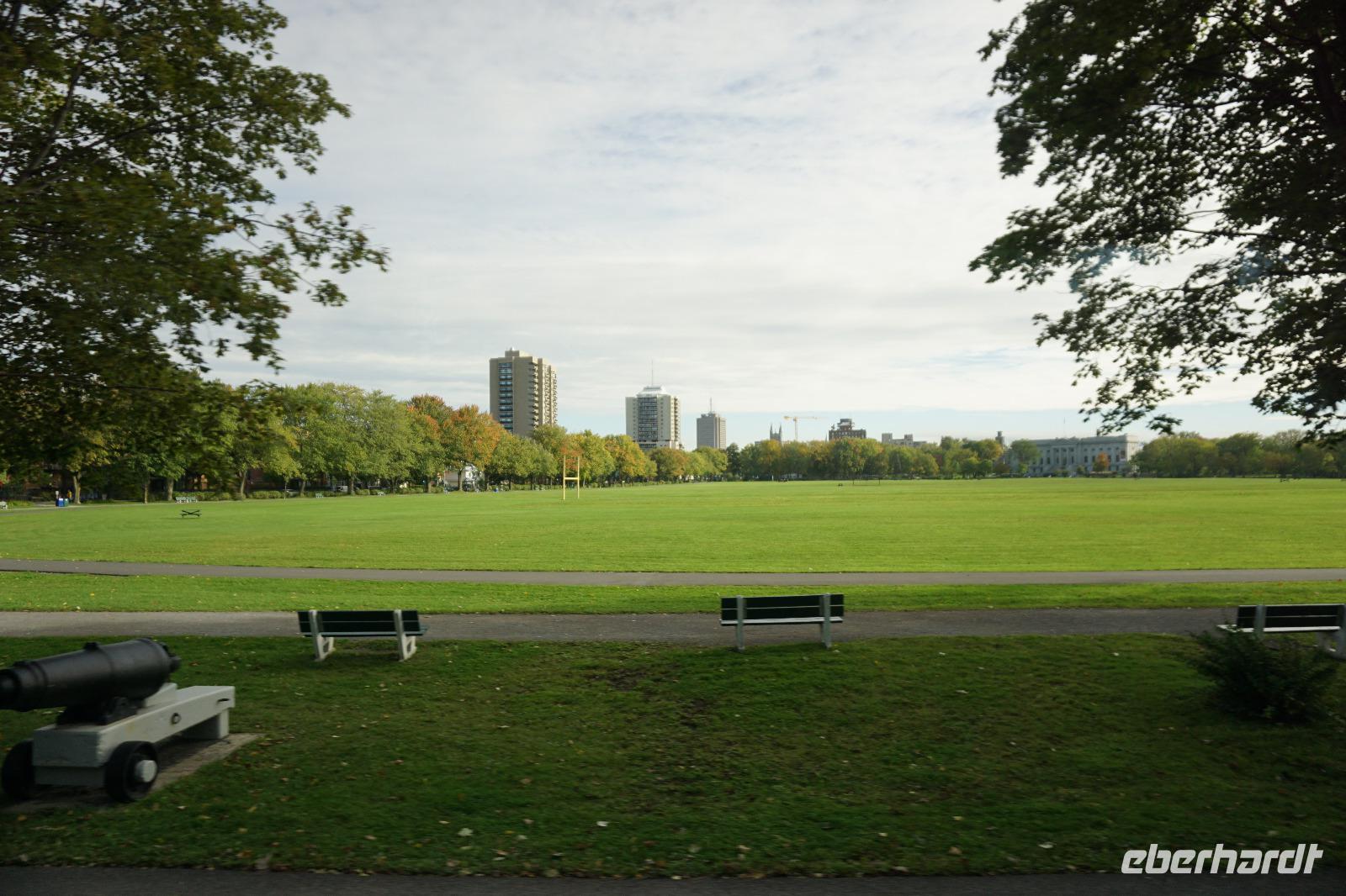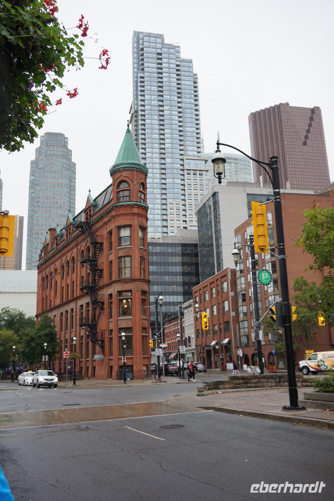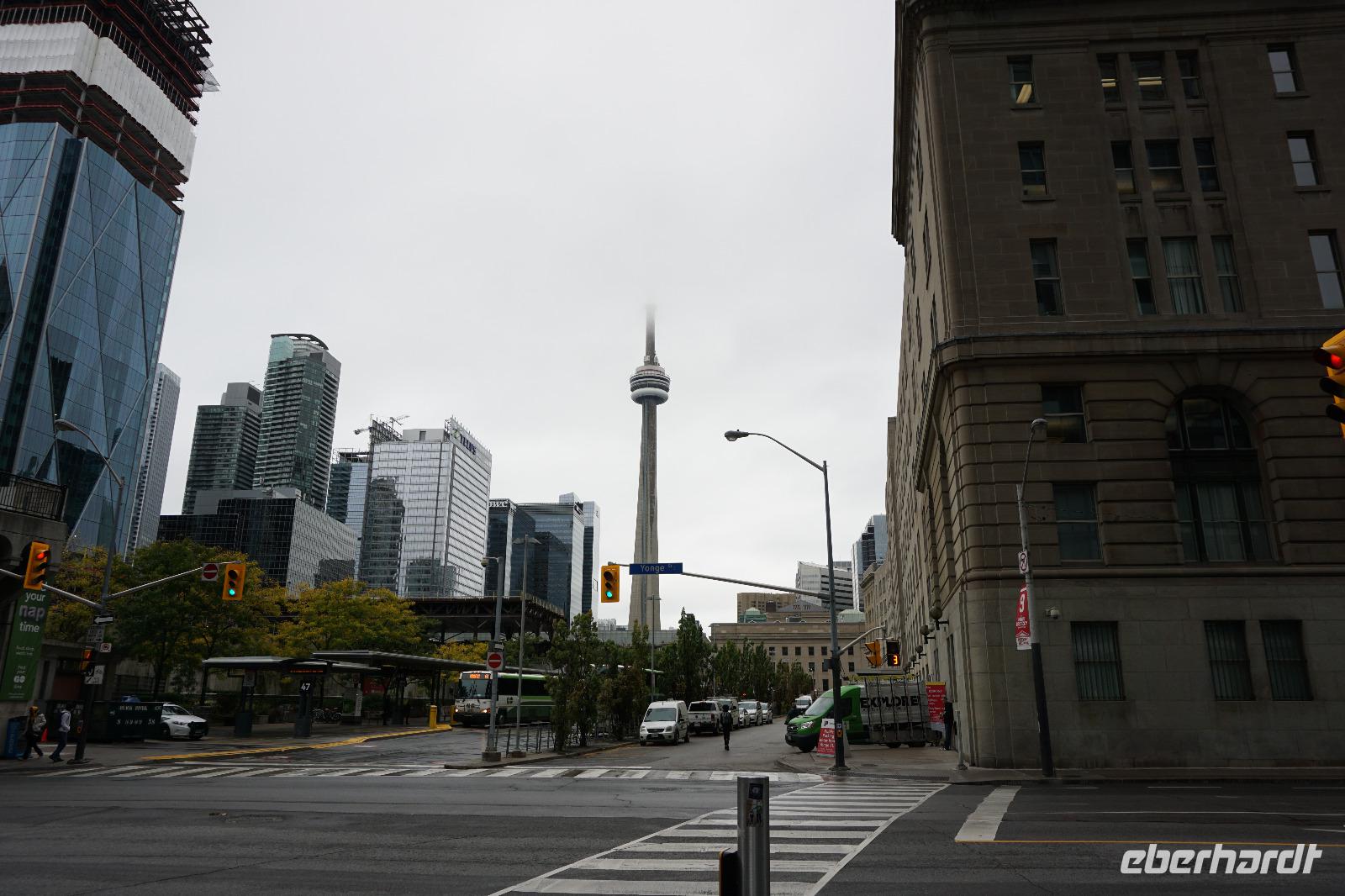 Am frühen Vormittag luden wir (oder eher Simon) unsere Koffer in den Bus und brachen mit Marion zu einer Stadtführung auf. Vorbei an der Sparks Street und dem Terry Fox Denkmal liefen wir zum Gelände des Parlaments mit der Centennial Flame, einer symbolischen Flamme zwischen den Wappen der Provinzen und Territorien Kanadas, inmitten eines Springbrunnens. Neben dem imposanten Hotel Chateau Laurier bestaunten wir die meisten Schleusen auf einer Stelle, die Ottawa Locks mit acht Schleusen. Insgesamt gibt es 43 Schleusen auf dem Rideau Kanal. Im Winter wird das Wasser des Kanals größtenteils abgelassen, dieser friert zu und wird zur Eislaufbahn für Einheimische und Touristen. Gegenüber der Ottawa Locks befand sich das Nationale Kriegsdenkmal, eine Erinnerungsstätte an die vielen gefallenen kanadischen Soldaten im Ersten Weltkrieg und aller späteren Kriege. Am Hotel stiegen wir wieder in den Bus ein und setzten unsere Stadtrundfahrt fort. Wir fuhren durch das Botschaftsviertel entlang des Ottawa Flusses, wo wir auf der anderen Seite Gatineau erblicken konnten. Wir spazierten durch den Rideau Hall Park. Anschließend verließen wir Ottawa, um weiter Richtung Osten zu fahren. Unterwegs spielte uns Marion verschiedene Lieder vor, darunter auch die kanadische Nationalhymne. Durch den kleinen Ort Brockville mit Häusern im viktorianischen Stil fuhren wir nach Rockport, wo wir eine Bootsfahrt entlang der berühmten 1000 Inseln antraten. Die Inseln liegen am Abfluss des Ontariosees in der Grenzregion zwischen den USA und Kanada. Hier findet man ebenfalls die angeblich kleinste internationale Brücke der Welt. Im Anschluss an unsere Fahrt auf dem Wasser ließen wir es uns in einem kleinen Restaurant zum Mittagessen schmecken. Zum Salat reichte man uns das typische 1000-Inseln-Dressing, was sehr gut schmeckte. Entlang des 1000 Insel Parkway fuhren wir weiter in die Garnissionsstadt Kingston, wo wir Zeit zum Verweilen hatten. Die Stadt mit über 120.000 Einwohner liegt am nordöstlichen Ende des Ontariosees. Auf der Weiterfahrt nach Toronto erzählte uns Marion viel Wissenswertes über das kanadische Schul- und Rentensystem. Am Abend erreichten wir unser Hotel in Toronto, welches mitten im belebten Zentrum der Stadt lag. Bei einem abendlichen Spaziergang durch die beleuchtete Stadt, erhaschten wir erste Blicke auf den Yonge-Dundas Square, in das Eaton Centre und auf das Toronto-Schild vor dem neuen Rathaus.