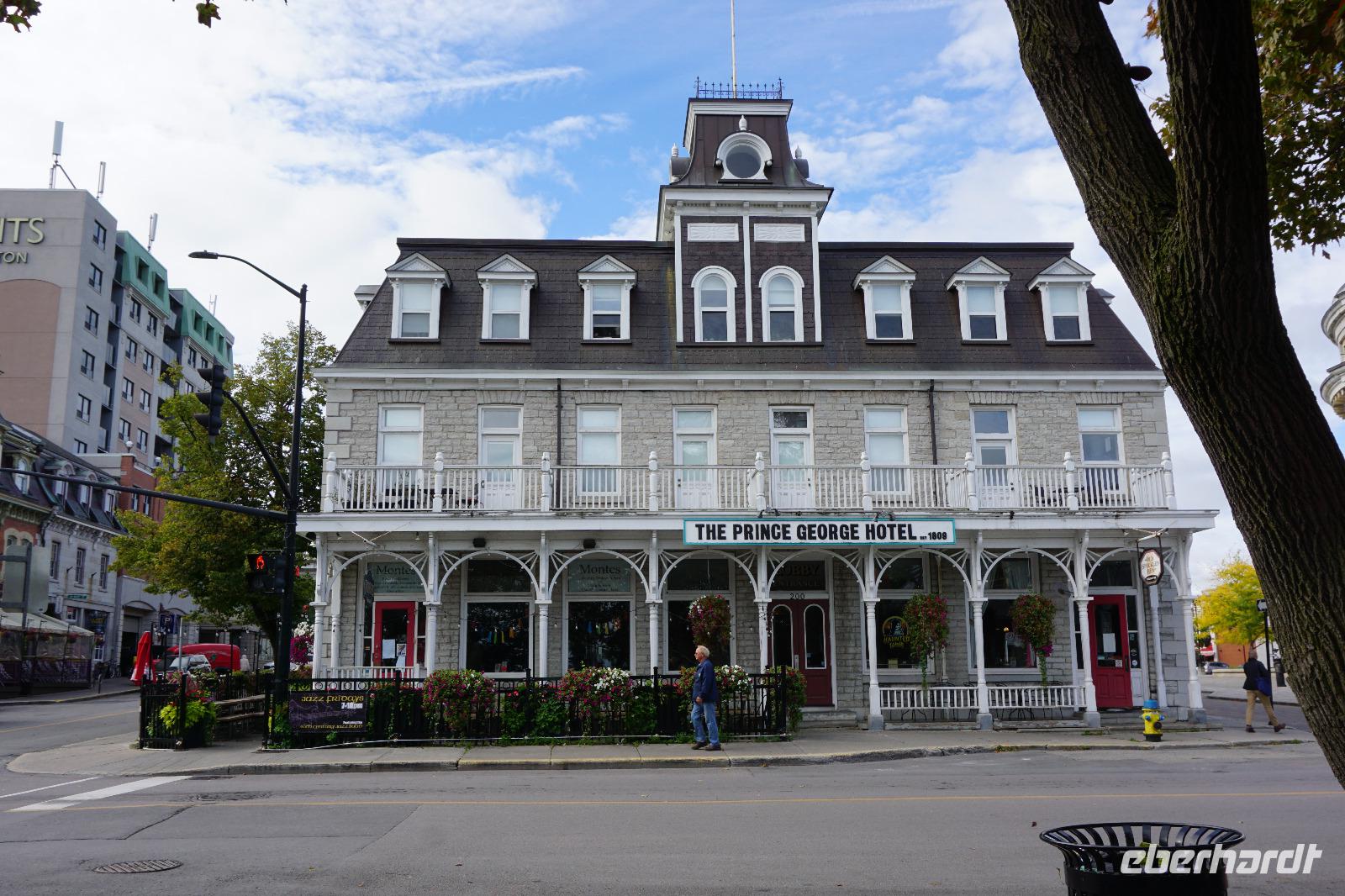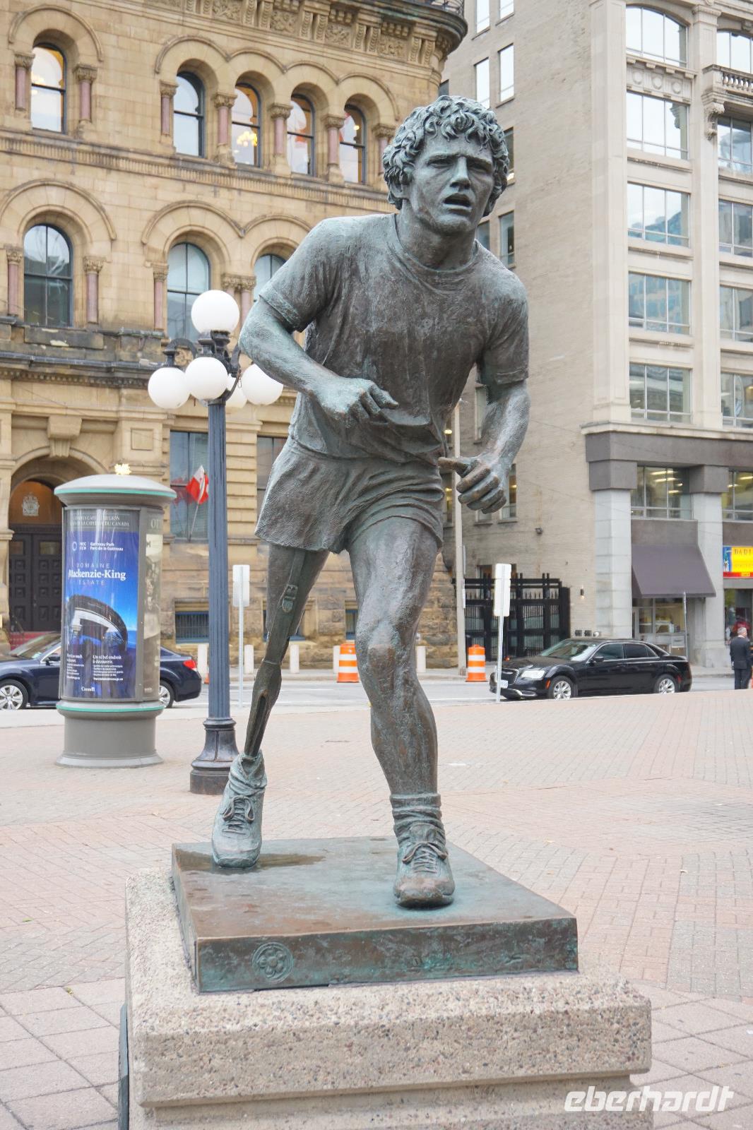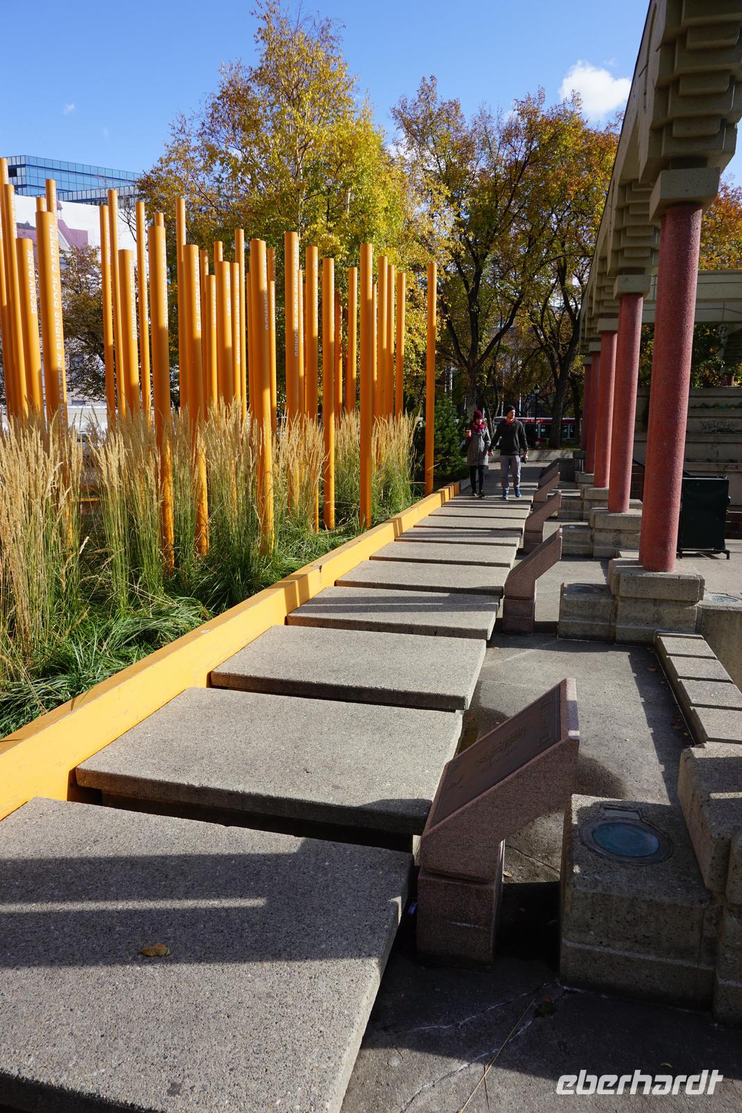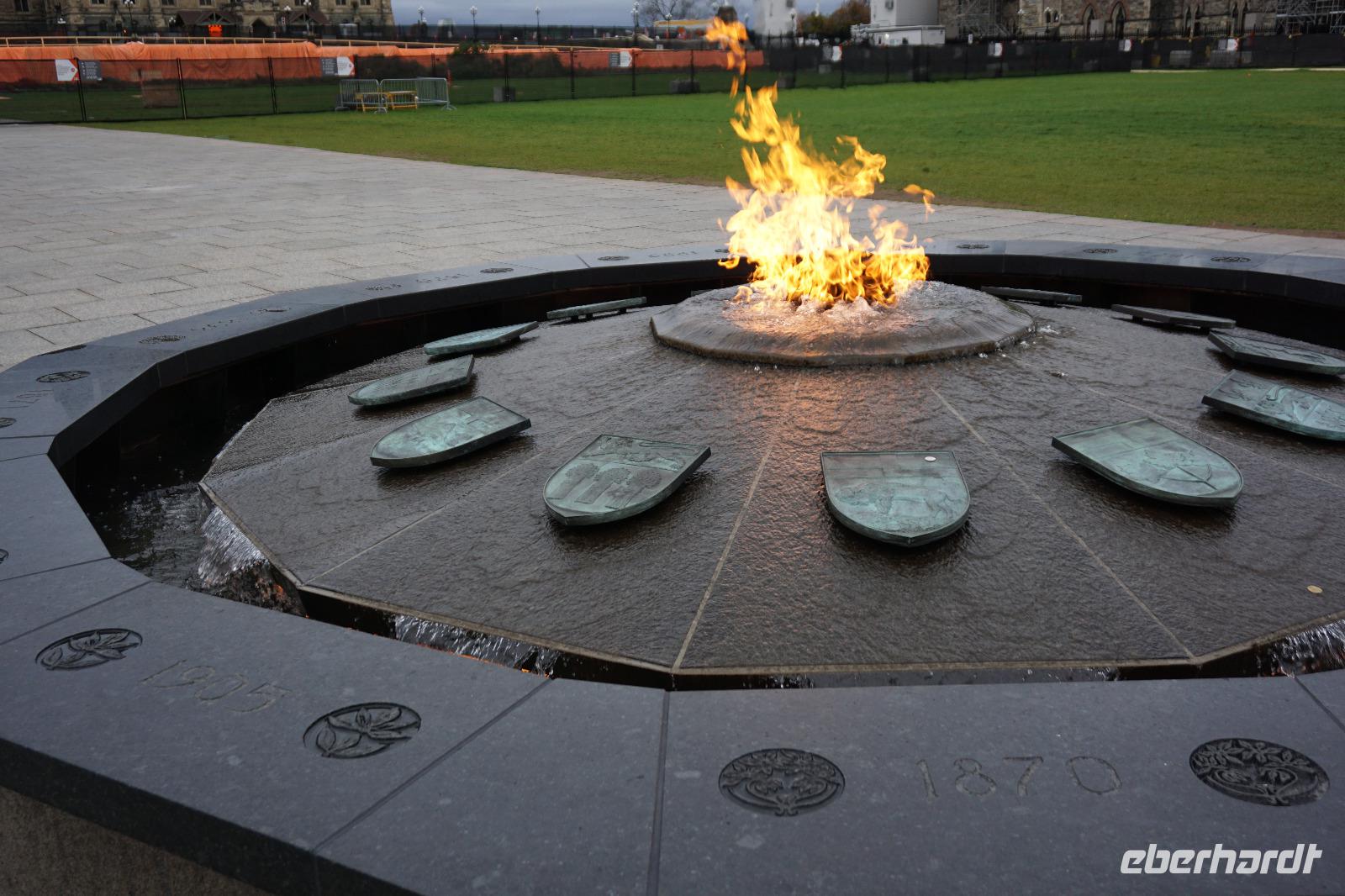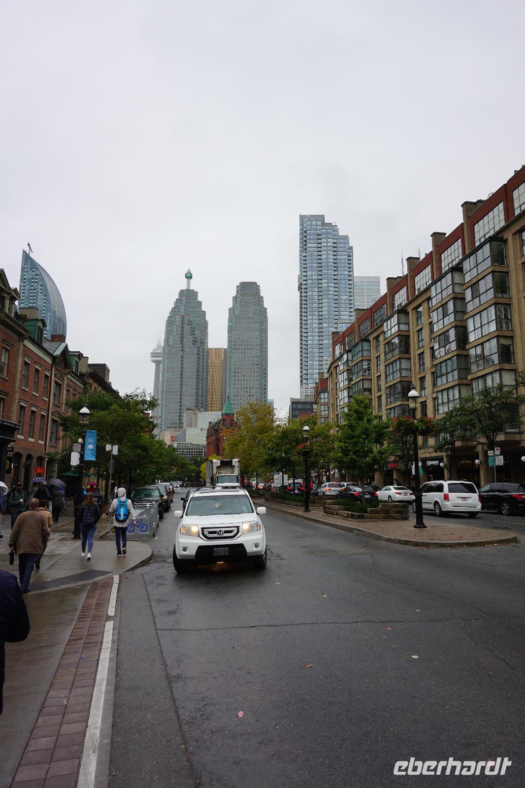 Am frühen Vormittag luden wir (oder eher Simon) unsere Koffer in den Bus und brachen mit Marion zu einer Stadtführung auf. Vorbei an der Sparks Street und dem Terry Fox Denkmal liefen wir zum Gelände des Parlaments mit der Centennial Flame, einer symbolischen Flamme zwischen den Wappen der Provinzen und Territorien Kanadas, inmitten eines Springbrunnens. Neben dem imposanten Hotel Chateau Laurier bestaunten wir die meisten Schleusen auf einer Stelle, die Ottawa Locks mit acht Schleusen. Insgesamt gibt es 43 Schleusen auf dem Rideau Kanal. Im Winter wird das Wasser des Kanals größtenteils abgelassen, dieser friert zu und wird zur Eislaufbahn für Einheimische und Touristen. Gegenüber der Ottawa Locks befand sich das Nationale Kriegsdenkmal, eine Erinnerungsstätte an die vielen gefallenen kanadischen Soldaten im Ersten Weltkrieg und aller späteren Kriege. Am Hotel stiegen wir wieder in den Bus ein und setzten unsere Stadtrundfahrt fort. Wir fuhren durch das Botschaftsviertel entlang des Ottawa Flusses, wo wir auf der anderen Seite Gatineau erblicken konnten. Wir spazierten durch den Rideau Hall Park. Anschließend verließen wir Ottawa, um weiter Richtung Osten zu fahren. Unterwegs spielte uns Marion verschiedene Lieder vor, darunter auch die kanadische Nationalhymne. Durch den kleinen Ort Brockville mit Häusern im viktorianischen Stil fuhren wir nach Rockport, wo wir eine Bootsfahrt entlang der berühmten 1000 Inseln antraten. Die Inseln liegen am Abfluss des Ontariosees in der Grenzregion zwischen den USA und Kanada. Hier findet man ebenfalls die angeblich kleinste internationale Brücke der Welt. Im Anschluss an unsere Fahrt auf dem Wasser ließen wir es uns in einem kleinen Restaurant zum Mittagessen schmecken. Zum Salat reichte man uns das typische 1000-Inseln-Dressing, was sehr gut schmeckte. Entlang des 1000 Insel Parkway fuhren wir weiter in die Garnissionsstadt Kingston, wo wir Zeit zum Verweilen hatten. Die Stadt mit über 120.000 Einwohner liegt am nordöstlichen Ende des Ontariosees. Auf der Weiterfahrt nach Toronto erzählte uns Marion viel Wissenswertes über das kanadische Schul- und Rentensystem. Am Abend erreichten wir unser Hotel in Toronto, welches mitten im belebten Zentrum der Stadt lag. Bei einem abendlichen Spaziergang durch die beleuchtete Stadt, erhaschten wir erste Blicke auf den Yonge-Dundas Square, in das Eaton Centre und auf das Toronto-Schild vor dem neuen Rathaus.