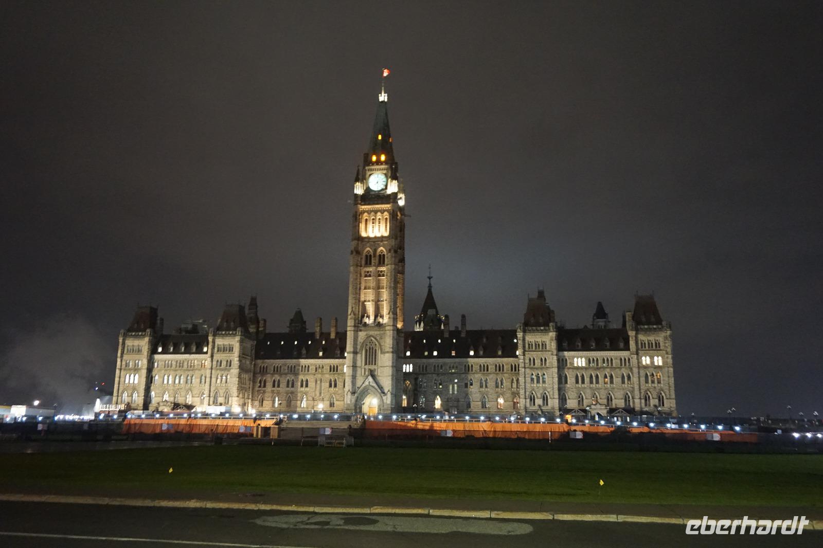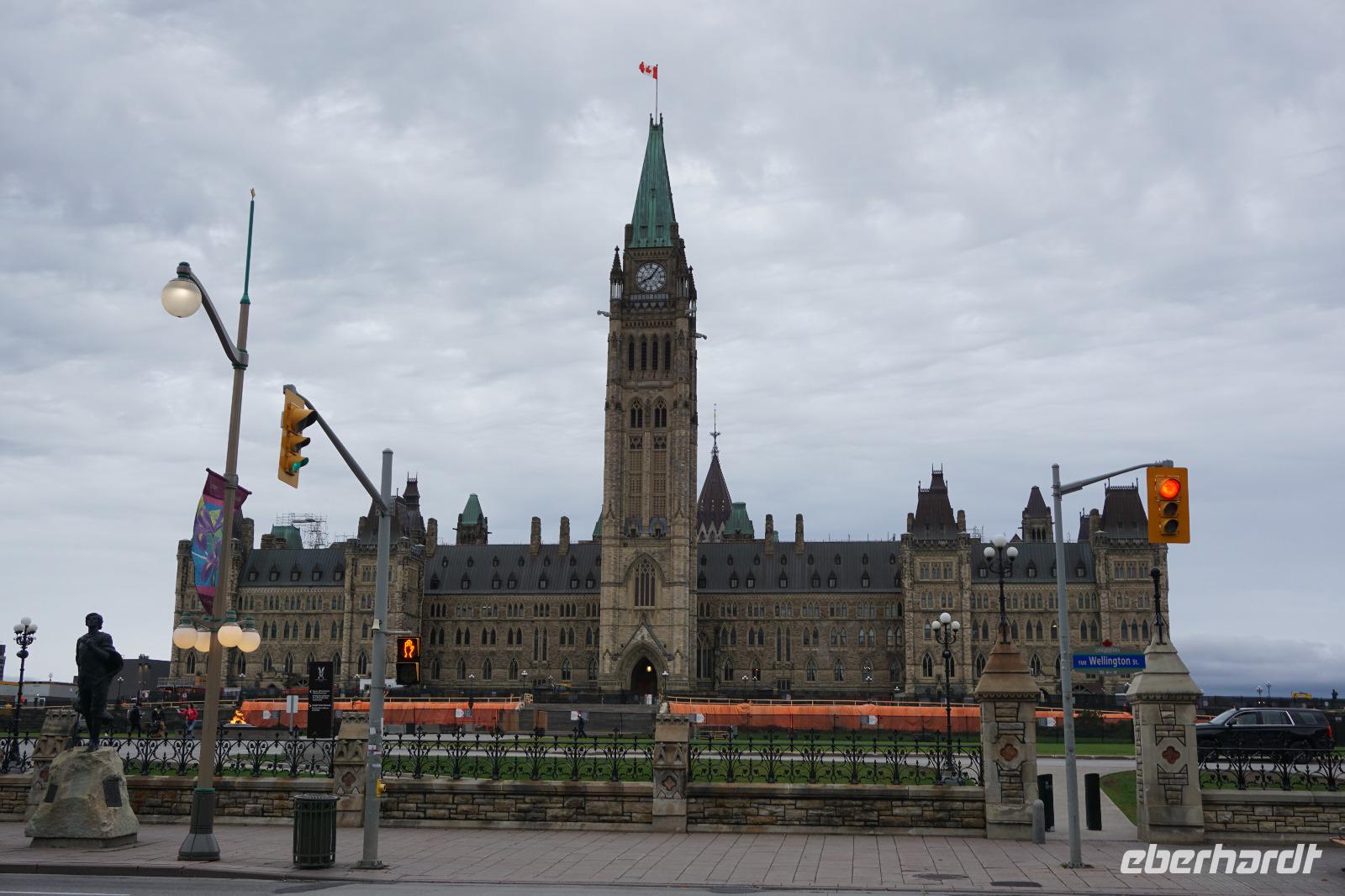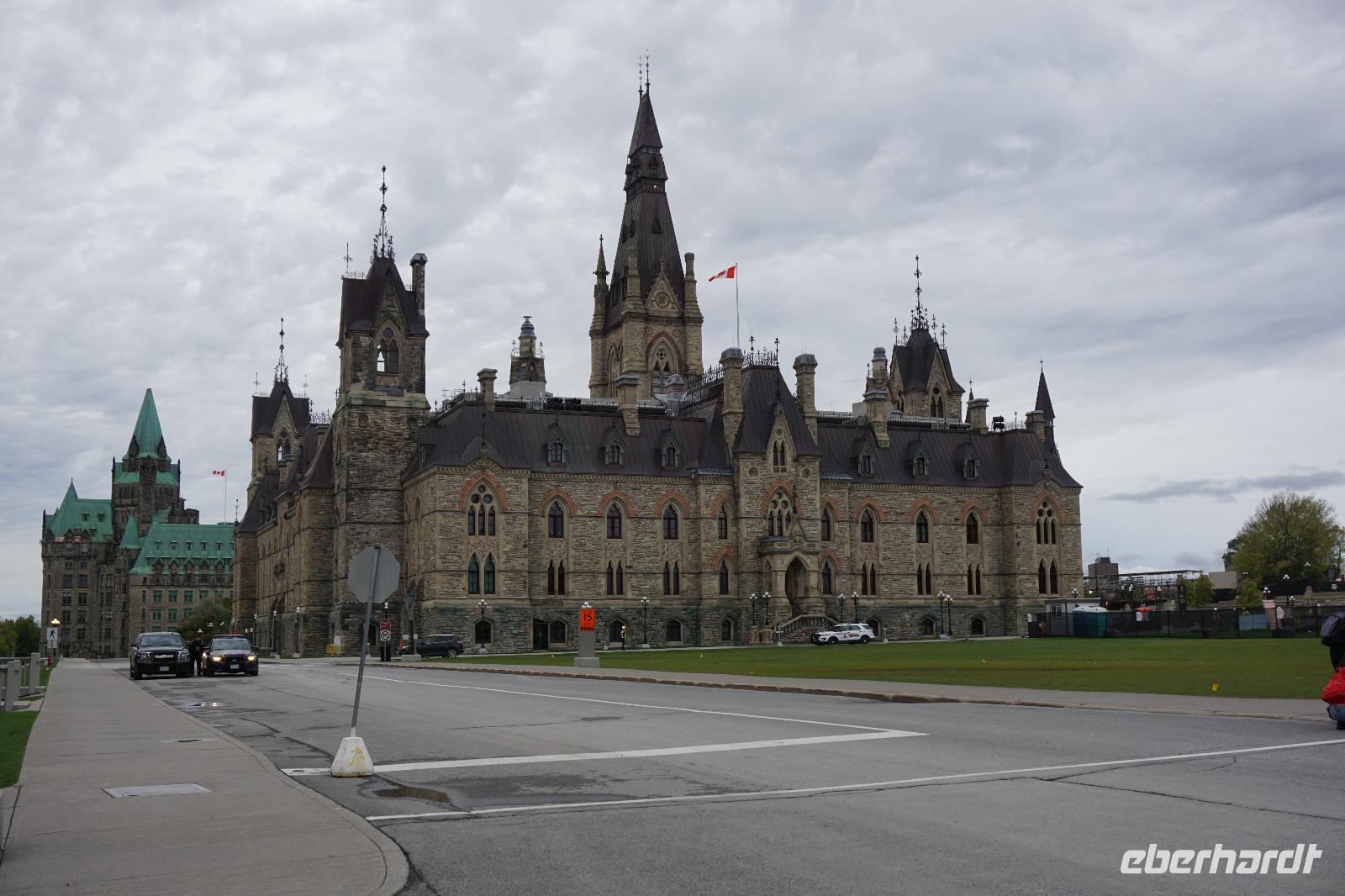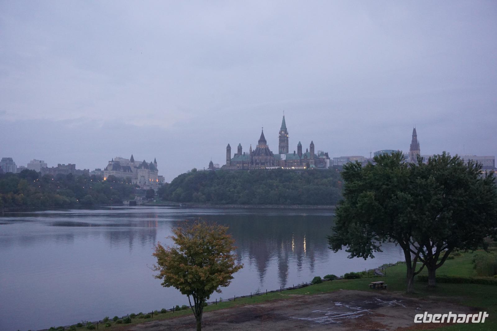 Heute hieß es Abschied nehmen von Québec City, denn unsere Reise führte uns weiter Richtung Südosten nach Ottawa. Auf unserem Weg dorthin versorgte uns Marion mit vielen Erzählungen und Informationen über die verschiedenen Indianerstämme und -sprachen, auch über jene, die noch in der Provinz Québec leben. Wir fuhren entlang der Batiscan Königsstraße, wo zwischen Québec City und Montreal 37 Grafschaften lagen. Nach einem kurzen Versorgungsstopp am Walmart (unter anderem mit Ahornkeksen), erreichten wir einige Zeit später das Chateau Montebello, wo wir ein himmlisches Mittagsbuffet mit viel leckerem Essen und traumhaften Desserts genossen. Durch das Areal spazierten wir anschließend zurück zum Bus, der uns zum Park Omega brachte, wo wir trotz Regens einige Tiere beobachten und fotografieren konnten: Hirsche, Wapitis, Polarfüchse, Cariboos, Büffel, einen Elch, (Polar-) Wölfe, Kojoten, Bergziegen, Braun- und Schwarzbären. Hier und da hielten wir auf der Strecke kurz, um die Tür des Busses zu öffnen und die neugierigen Hirsche, Rehe und Wapitis mit Möhren zu füttern. Zum Spazieren im Parkgelände war es leider zu nass. Am frühen Abend kamen wir in der kanadischen Hauptstadt Ottawa an, wo wir zuerst noch einen kleinen Fotostopp am Geschichtsmuseum mit Blick auf den Rideau Kanal und das Parlamentsgebäude machten, bevor wir im Hotel eincheckten und ich mit einigen anderen Mitreisenden noch eine kleinen Runde zum Parlament Hill und zum Byward Market spazierte. Der Abend stand zur freien Verfügung.