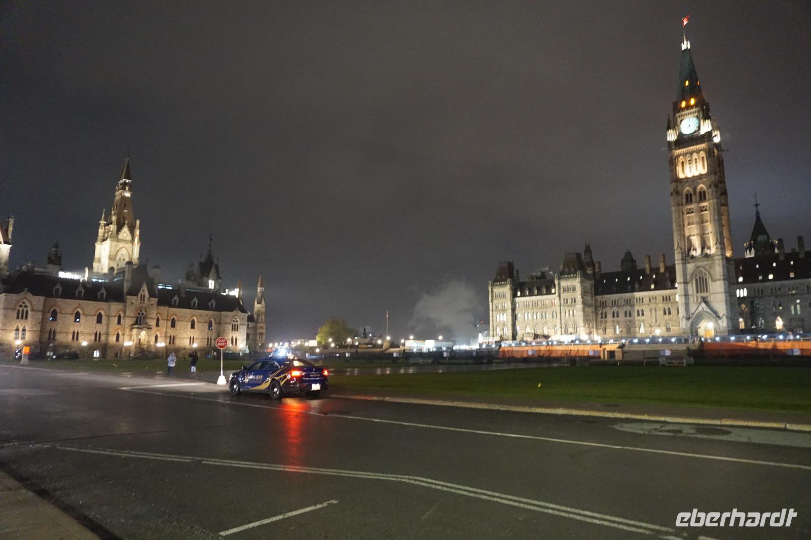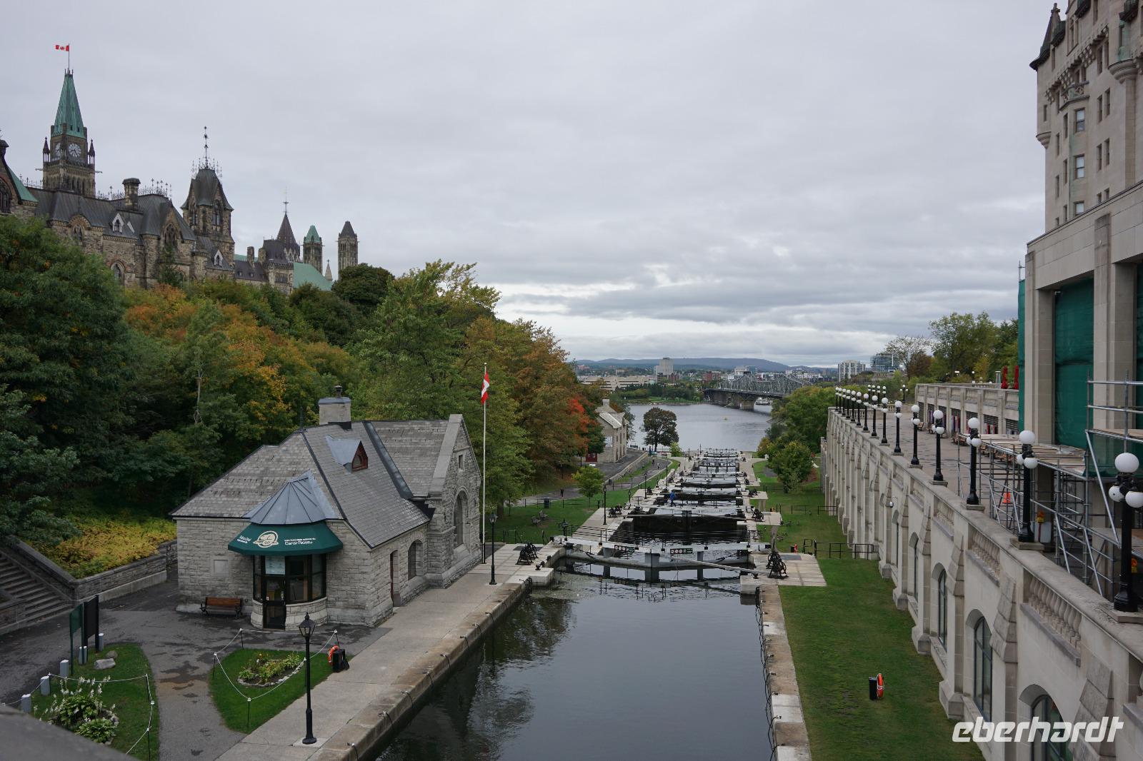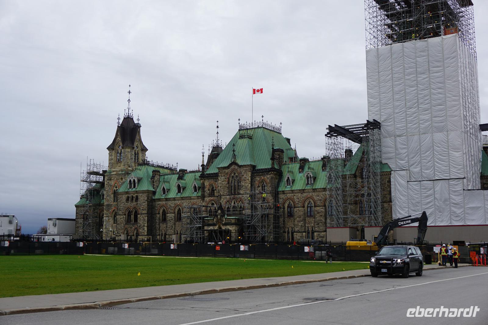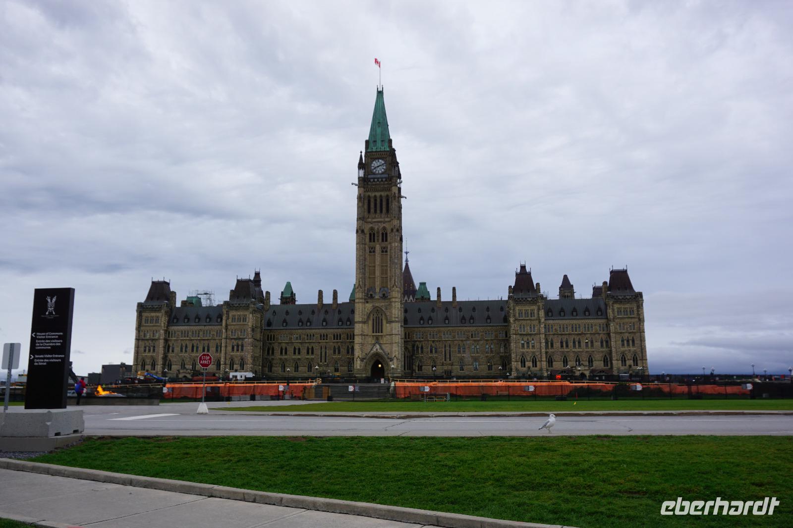 Heute hieß es Abschied nehmen von Québec City, denn unsere Reise führte uns weiter Richtung Südosten nach Ottawa. Auf unserem Weg dorthin versorgte uns Marion mit vielen Erzählungen und Informationen über die verschiedenen Indianerstämme und -sprachen, auch über jene, die noch in der Provinz Québec leben. Wir fuhren entlang der Batiscan Königsstraße, wo zwischen Québec City und Montreal 37 Grafschaften lagen. Nach einem kurzen Versorgungsstopp am Walmart (unter anderem mit Ahornkeksen), erreichten wir einige Zeit später das Chateau Montebello, wo wir ein himmlisches Mittagsbuffet mit viel leckerem Essen und traumhaften Desserts genossen. Durch das Areal spazierten wir anschließend zurück zum Bus, der uns zum Park Omega brachte, wo wir trotz Regens einige Tiere beobachten und fotografieren konnten: Hirsche, Wapitis, Polarfüchse, Cariboos, Büffel, einen Elch, (Polar-) Wölfe, Kojoten, Bergziegen, Braun- und Schwarzbären. Hier und da hielten wir auf der Strecke kurz, um die Tür des Busses zu öffnen und die neugierigen Hirsche, Rehe und Wapitis mit Möhren zu füttern. Zum Spazieren im Parkgelände war es leider zu nass. Am frühen Abend kamen wir in der kanadischen Hauptstadt Ottawa an, wo wir zuerst noch einen kleinen Fotostopp am Geschichtsmuseum mit Blick auf den Rideau Kanal und das Parlamentsgebäude machten, bevor wir im Hotel eincheckten und ich mit einigen anderen Mitreisenden noch eine kleinen Runde zum Parlament Hill und zum Byward Market spazierte. Der Abend stand zur freien Verfügung.