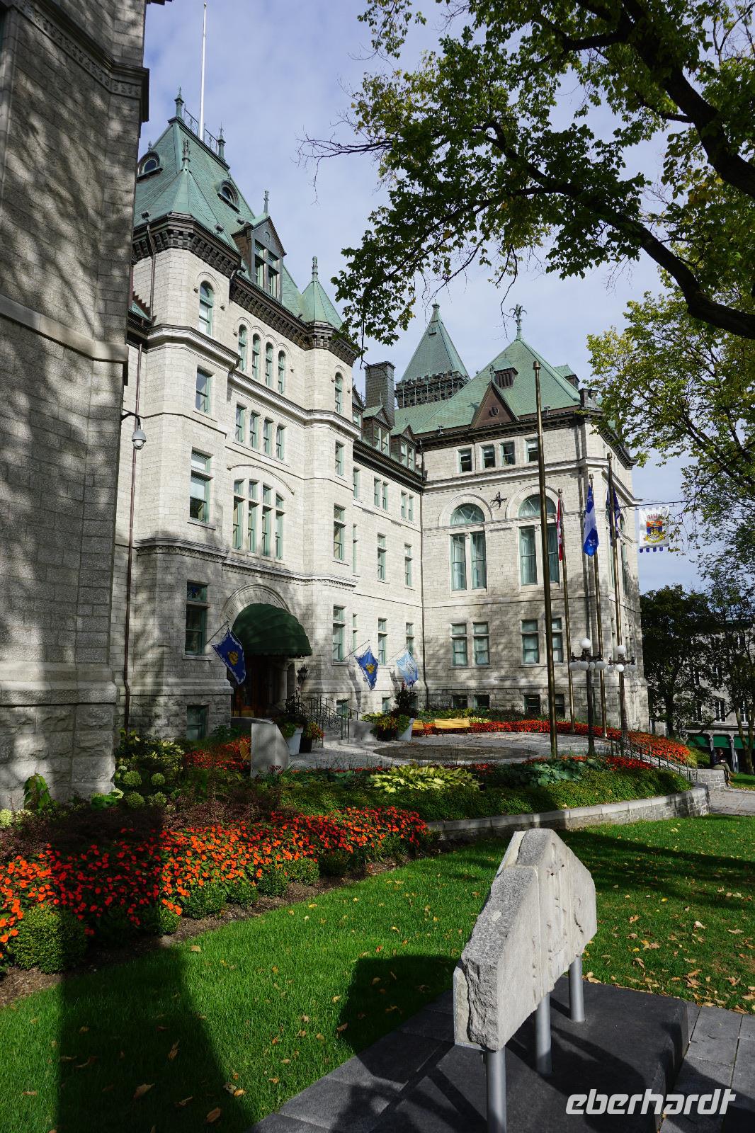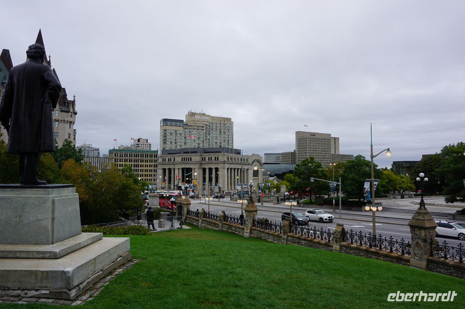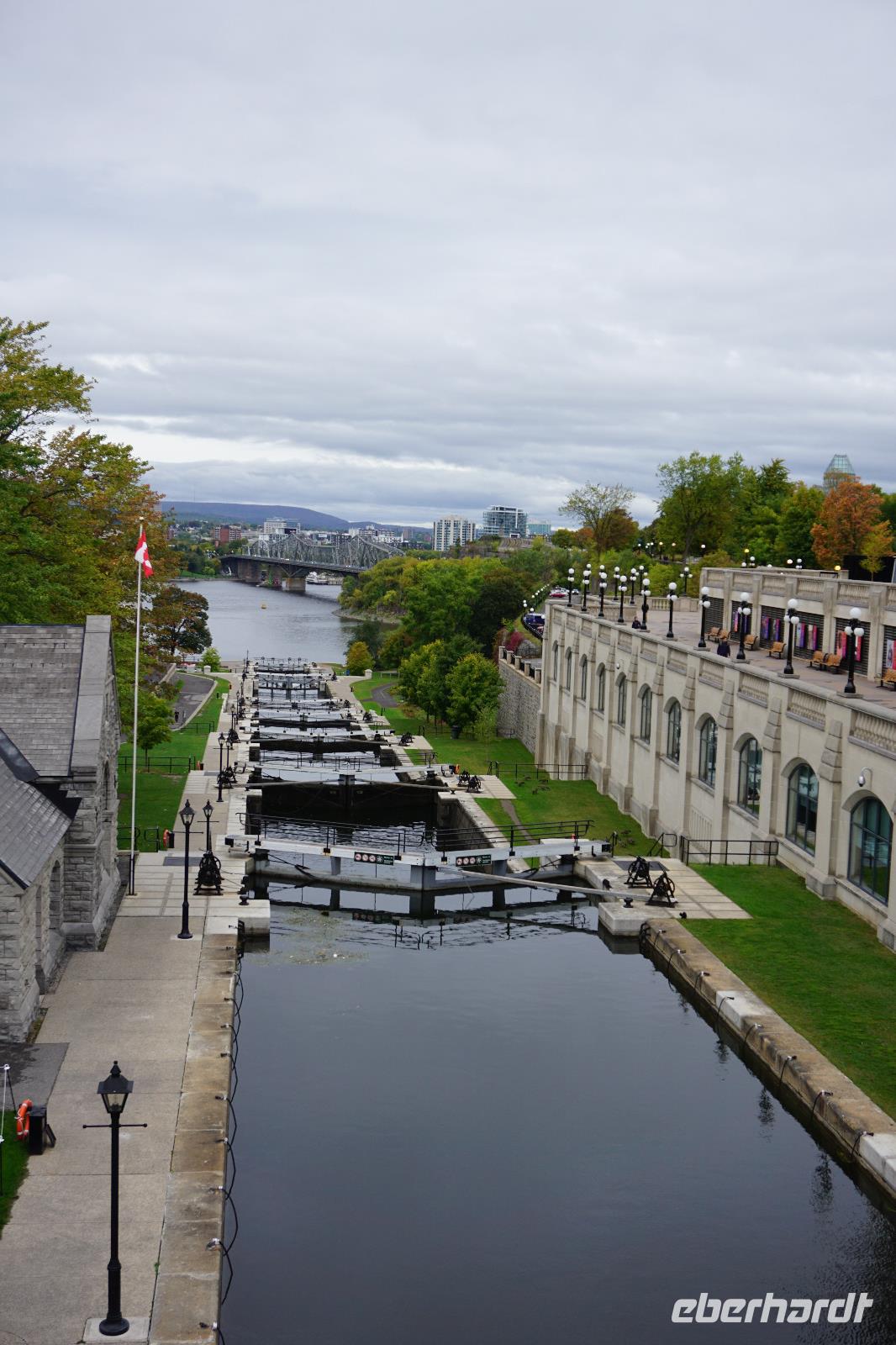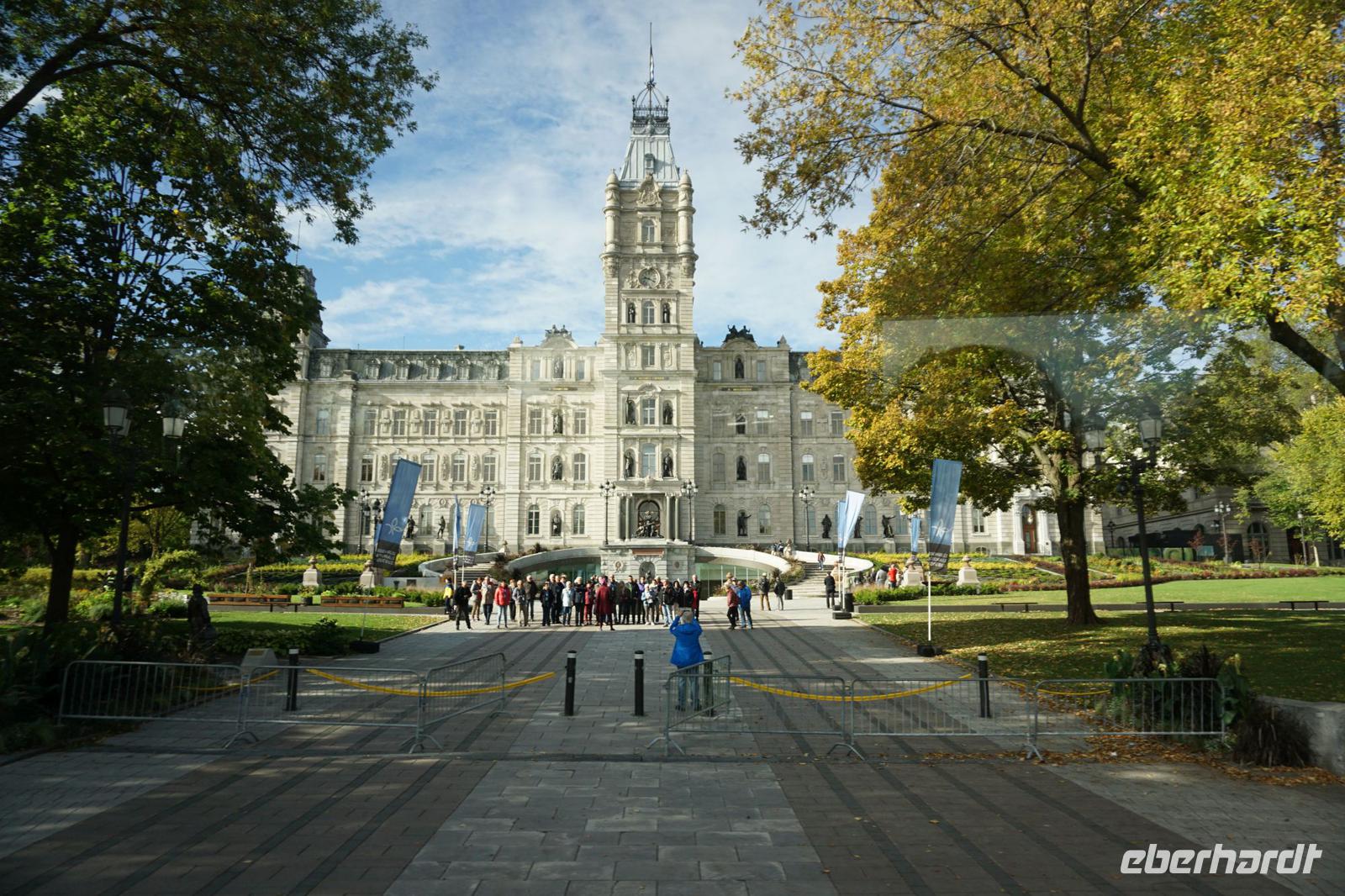 Heute hieß es Abschied nehmen von Québec City, denn unsere Reise führte uns weiter Richtung Südosten nach Ottawa. Auf unserem Weg dorthin versorgte uns Marion mit vielen Erzählungen und Informationen über die verschiedenen Indianerstämme und -sprachen, auch über jene, die noch in der Provinz Québec leben. Wir fuhren entlang der Batiscan Königsstraße, wo zwischen Québec City und Montreal 37 Grafschaften lagen. Nach einem kurzen Versorgungsstopp am Walmart (unter anderem mit Ahornkeksen), erreichten wir einige Zeit später das Chateau Montebello, wo wir ein himmlisches Mittagsbuffet mit viel leckerem Essen und traumhaften Desserts genossen. Durch das Areal spazierten wir anschließend zurück zum Bus, der uns zum Park Omega brachte, wo wir trotz Regens einige Tiere beobachten und fotografieren konnten: Hirsche, Wapitis, Polarfüchse, Cariboos, Büffel, einen Elch, (Polar-) Wölfe, Kojoten, Bergziegen, Braun- und Schwarzbären. Hier und da hielten wir auf der Strecke kurz, um die Tür des Busses zu öffnen und die neugierigen Hirsche, Rehe und Wapitis mit Möhren zu füttern. Zum Spazieren im Parkgelände war es leider zu nass. Am frühen Abend kamen wir in der kanadischen Hauptstadt Ottawa an, wo wir zuerst noch einen kleinen Fotostopp am Geschichtsmuseum mit Blick auf den Rideau Kanal und das Parlamentsgebäude machten, bevor wir im Hotel eincheckten und ich mit einigen anderen Mitreisenden noch eine kleinen Runde zum Parlament Hill und zum Byward Market spazierte. Der Abend stand zur freien Verfügung.