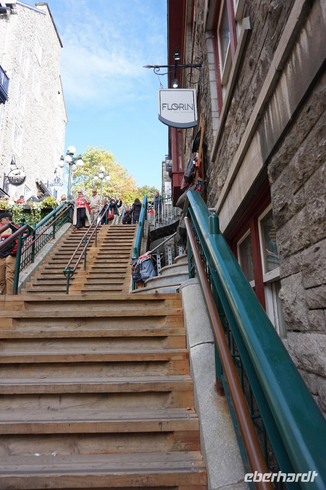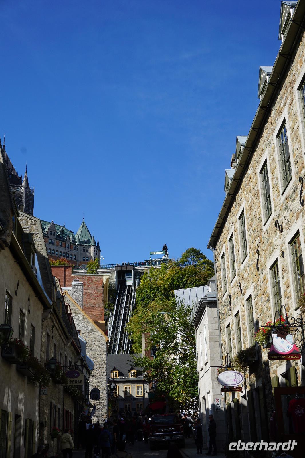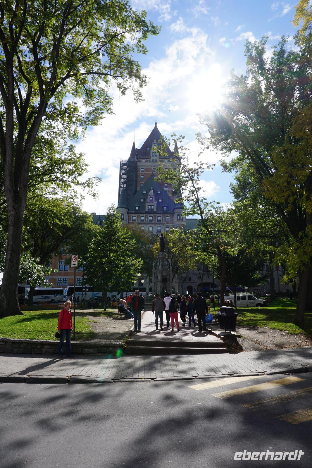 Nach dem Frühstück trafen wir uns alle beim Bus, um zu einer Stadtrundfahrt durch Québec City aufzubrechen. Dabei fuhren wir zuerst durch den zwei km langen und 800 m breiten Park Abraham mit seiner sternenförmigen Zitadelle und dem Parlamentsgebäude. Die Stadtmauer von Québec City ist 4,5 km lang. Vorbei am Kongresszentrum begaben wir uns in die Oberstadt, wo wir einen Spaziergangentlang der Terrasse Dufferin, dem Chateau Frontenac, was ca. 600 Zimmer beherbergt und der Kirche Notre Dame de Québec. Über die Halsbrechertreppe gingen wir in die belebte und von kleinen Läden gesäumte Unterstadt mit dem berühmten Wandgemälde. Nach der aufschlussreichen Stadtführung blieb uns noch etwas Zeit, um in der Stadt zu bummeln oder ein Café aufzusuchen. Anschließend führte unsere Reise weiter zu den bekannten Montmorency Wasserfällen, die sogar 30 m höher sind als die Niagara-Wasserfälle, aber sehr schmal. Dort spazierten wir entlang der Wasserfälle, fotografierten und hatten eine wunderbare Aussicht über den Sankt-Lorenz-Strom und auf die gegenüberliegende Insel Ile d'Orleans. Danach besuchten wir den St. Anne Canyon, wo wir über drei Brücken (eine davon 60 m über dem Grund des Canyons) gehen und verschiedene kleine und große Wasserfälle beobachten konnten. Nach einem ausgiebigen Spaziergang entlang des Canyons erreichten wir kurze Zeit später die imposante Kathedrale St. Anne de Beaupre, wo wir genügend Zeit für eigene Erkundungen hatten. Mit rund einer halben Million Pilgern jährlich zählt diese zu den bedeutendsten Wallfahrtsorten Nordamerikas. Auf dem Weg zum Abendessen fuhren wir an den für die Region typischen Häusern mit Schlittendächern, in den Berg gehauenen Vorratskellern und kleinen Kapellen vorbei. An der „Zuckerhütte" angekommen, erklärte uns ein Mitarbeiter den Prozess des Ahornsirup-Abbaus und dessen Weiterverarbeitung zu verschiedenen Produkten, wie Ahornsirup, -butter oder -toffee. Hier hatten wir auch die Möglichkeit selbst ein paar Produkte zu probieren und zu kaufen. Uns wurde ein reichhaltiges Abendessen serviert, bei dem wir verschiedenste Gerichte, wie Kartoffeln, Rührei, Schinken, Suppe oder Pancakes mit dem klebrig-süßen Ahornsirup probieren und verfeinern durften. Für Unterhaltung sorgte ein Livemusiker und eine französische Reisegruppe. Nachdem wir uns alle satt gegessen hatten, gab es noch ein „Dessert". Draußen goss man über Eis Ahornsirup, wartete etwa zehn Sekunden und rollte dann die klebrige Masse auf einen Holzstiel. Der Lolli aus Ahornsirup war süß, aber auch sehr köstlich.