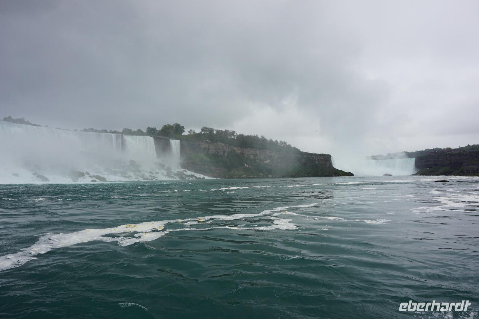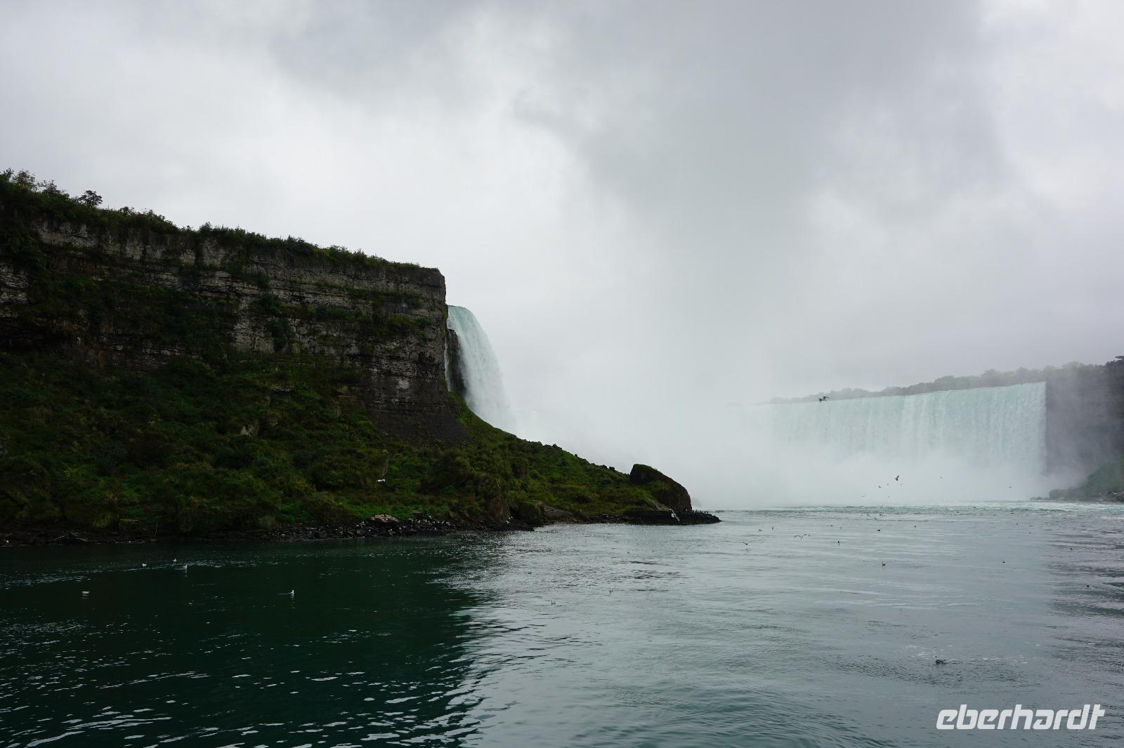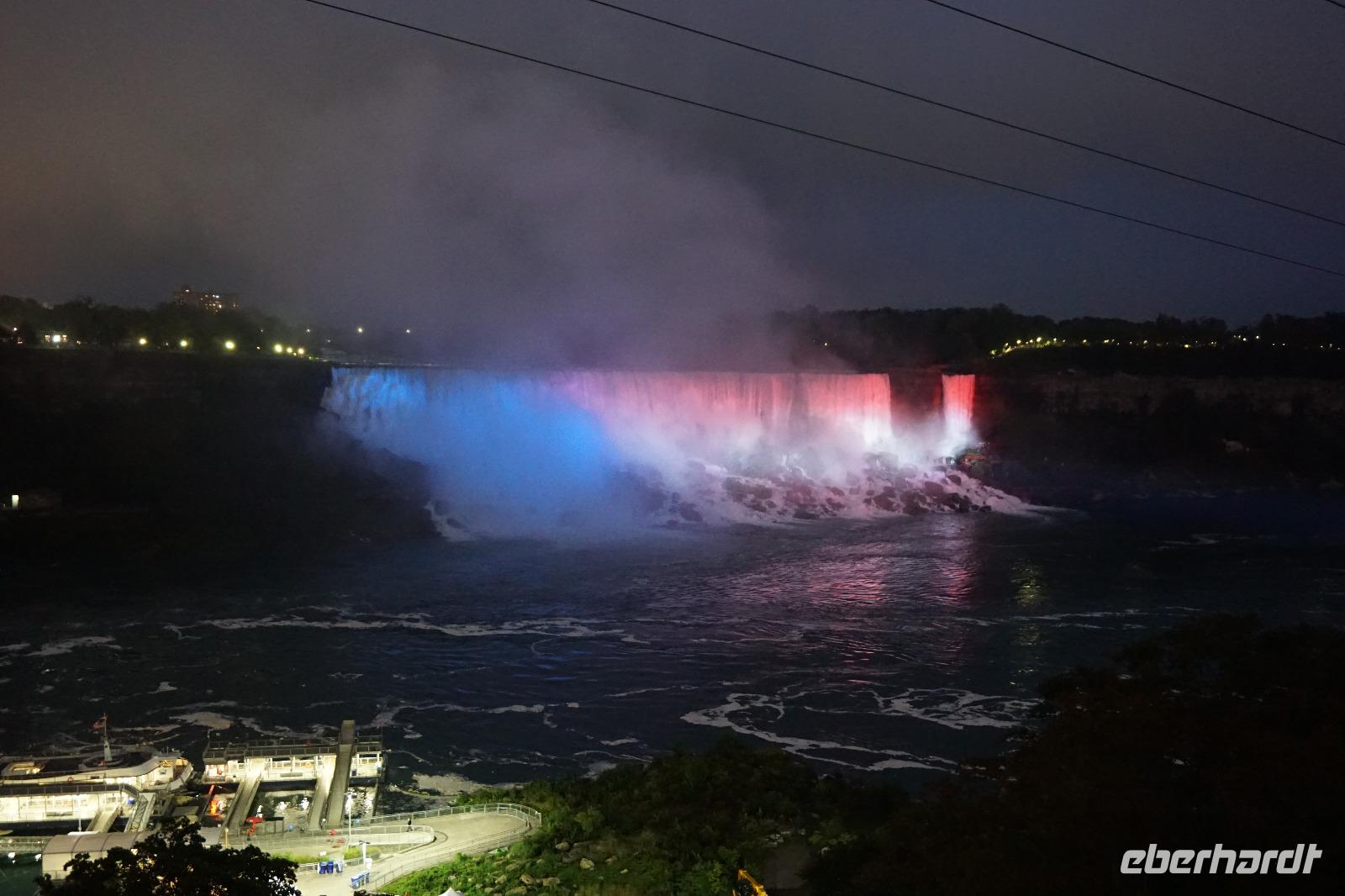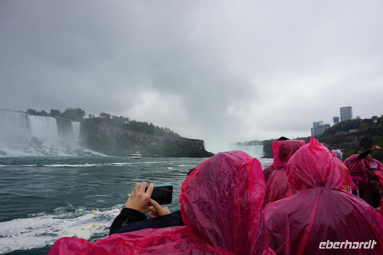 Nach einem ausgiebigen Frühstück starteten wir zu unserer Stadtrundfahrt, bei der wir an der St. Michaels Cathedral, dem neuen und alten Rathaus, dem Toronto-Schild und an der Bloor Street mit vielen Geschäften namhafter Marken vorbei fuhren. Vorbei an der größten Universität Torontos, dem St. Michaels College, Chinatown und der Kunst Gallerie begaben wir uns zur größten und ältesten Markthalle Torontos - St. Lawrence Market. Wir bestaunten die riesige Markthalle von innen, bevor wir zu Fuß durch den Berczy Park zur Hockey Hall of Fame gingen. Da das Wetter nicht so schön war, ließen wir die Fahrt auf den CN-Tower aus. Dafür hatten wir am Hafen einen wunderbaren Blick auf die Skyline der Metropole. Unser weiterer Weg führte uns am Rogers Centre vorbei aus der Stadt. Durch endlos scheinende Weinanbaugebiete, wo der bekannte Eiswein hergestellt wurde, fuhren wir in das kleine Künstlerörtchen Niagara-on-the-lake, um dort unsere Mittagspause zu verbringen. Gesättigt ging es dann weiter zu den Niagarafällen, die die Wasserfälle des Niagara-Flusses sind und sich an der Grenze zwischen dem US-amerikanischen Bundesstaat New York und der kanadischen Provinz Ontario befinden. Wir hielten am Visitor Center kurz überhalb der Wasserfälle, wo man am Fluss entlang spazieren und Fotos machen konnte. Allerdings war es dort wegen des zu uns wehenden Windes sehr nass. Es schien fast so als würde es regnen. Danach fuhren wir mit einer Seilbahn zur Anlegestelle des Bootes. Nach kurzer Wartezeit standen wir auch schon alle auf dem Boot von Hornblower Niagara Cruises und hatten große rote Regencapes an. Wir fuhren direkt auf die Wasserfälle zu. Am Anfang konnte man noch ein paar Fotos machen, aber dann wurden wir durch die Gischt der Wasserfälle nass gespritzt. Es war mitunter so nass, dass man kaum noch etwas sehen konnte und sich vor den Wassermassen von allen Seiten im Inneren des Bootes in Sicherheit bringen musste. Es war ein einmaliges Erlebnis. Nach der Bootsfahrt trafen wir uns wieder am Bus, wo es leckeren, typisch kanadischen Fudge mit Ahorngeschmack zum Probieren gab. Kurze Zeit später waren wir im Hotel. Später am Abend trafen wir uns für einen abendlichen Spaziergang zu den beleuchteten Wasserfällen. Unterwegs hatte man die Möglichkeit viele tolle Fotos zu schießen oder die spektakulären, mit verschiedenen Farben angeleuchteten Wasserfälle einfach eine Weile auf sich wirken zu lassen. Auch der Skylon Tower und das "kleine Las Vegas" mit den bunten Spielhallen und vielen Schnellrestaurants waren sehr interessant.
