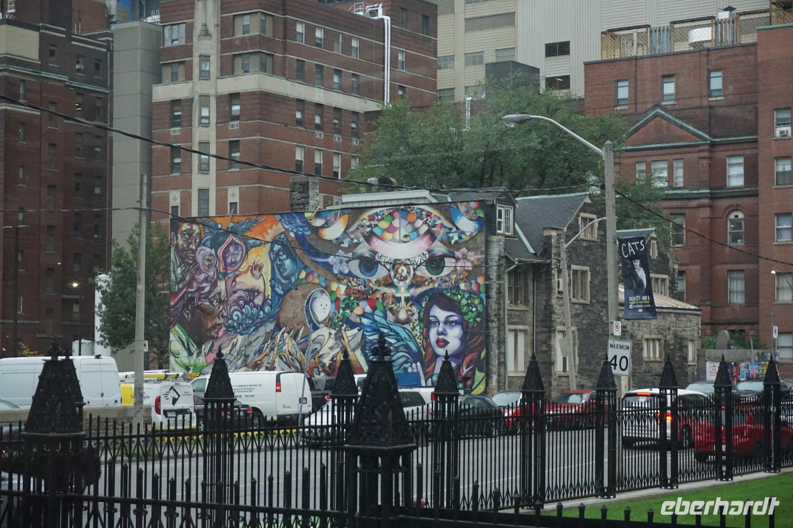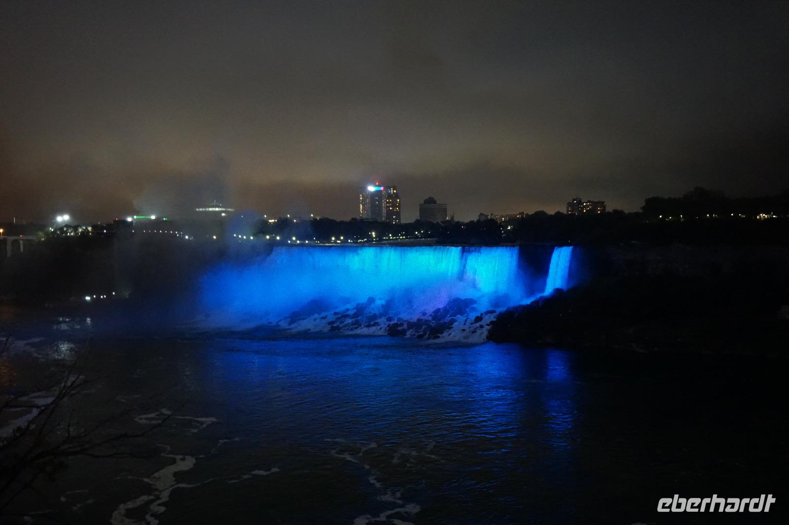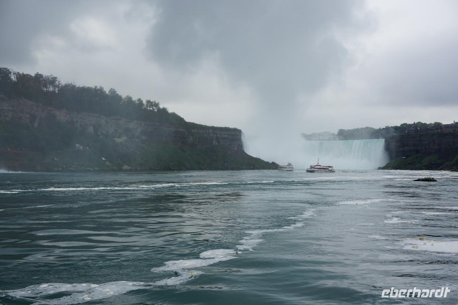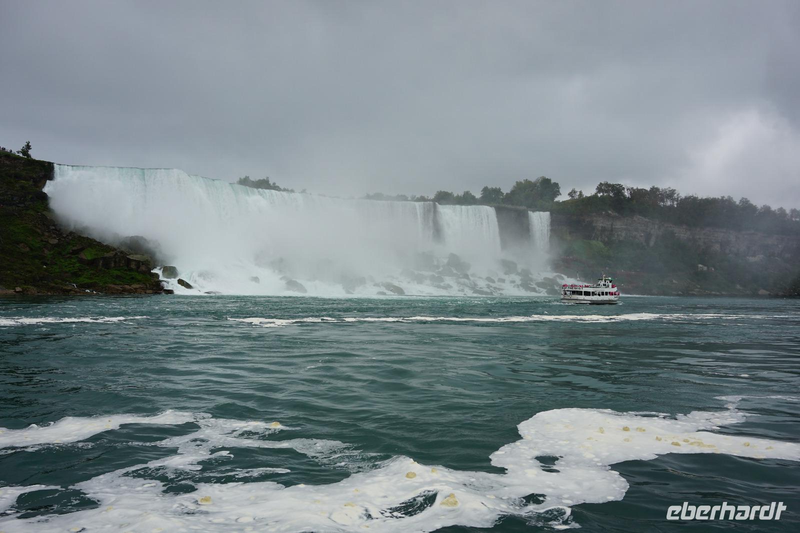 Nach einem ausgiebigen Frühstück starteten wir zu unserer Stadtrundfahrt, bei der wir an der St. Michaels Cathedral, dem neuen und alten Rathaus, dem Toronto-Schild und an der Bloor Street mit vielen Geschäften namhafter Marken vorbei fuhren. Vorbei an der größten Universität Torontos, dem St. Michaels College, Chinatown und der Kunst Gallerie begaben wir uns zur größten und ältesten Markthalle Torontos - St. Lawrence Market. Wir bestaunten die riesige Markthalle von innen, bevor wir zu Fuß durch den Berczy Park zur Hockey Hall of Fame gingen. Da das Wetter nicht so schön war, ließen wir die Fahrt auf den CN-Tower aus. Dafür hatten wir am Hafen einen wunderbaren Blick auf die Skyline der Metropole. Unser weiterer Weg führte uns am Rogers Centre vorbei aus der Stadt. Durch endlos scheinende Weinanbaugebiete, wo der bekannte Eiswein hergestellt wurde, fuhren wir in das kleine Künstlerörtchen Niagara-on-the-lake, um dort unsere Mittagspause zu verbringen. Gesättigt ging es dann weiter zu den Niagarafällen, die die Wasserfälle des Niagara-Flusses sind und sich an der Grenze zwischen dem US-amerikanischen Bundesstaat New York und der kanadischen Provinz Ontario befinden. Wir hielten am Visitor Center kurz überhalb der Wasserfälle, wo man am Fluss entlang spazieren und Fotos machen konnte. Allerdings war es dort wegen des zu uns wehenden Windes sehr nass. Es schien fast so als würde es regnen. Danach fuhren wir mit einer Seilbahn zur Anlegestelle des Bootes. Nach kurzer Wartezeit standen wir auch schon alle auf dem Boot von Hornblower Niagara Cruises und hatten große rote Regencapes an. Wir fuhren direkt auf die Wasserfälle zu. Am Anfang konnte man noch ein paar Fotos machen, aber dann wurden wir durch die Gischt der Wasserfälle nass gespritzt. Es war mitunter so nass, dass man kaum noch etwas sehen konnte und sich vor den Wassermassen von allen Seiten im Inneren des Bootes in Sicherheit bringen musste. Es war ein einmaliges Erlebnis. Nach der Bootsfahrt trafen wir uns wieder am Bus, wo es leckeren, typisch kanadischen Fudge mit Ahorngeschmack zum Probieren gab. Kurze Zeit später waren wir im Hotel. Später am Abend trafen wir uns für einen abendlichen Spaziergang zu den beleuchteten Wasserfällen. Unterwegs hatte man die Möglichkeit viele tolle Fotos zu schießen oder die spektakulären, mit verschiedenen Farben angeleuchteten Wasserfälle einfach eine Weile auf sich wirken zu lassen. Auch der Skylon Tower und das "kleine Las Vegas" mit den bunten Spielhallen und vielen Schnellrestaurants waren sehr interessant.
