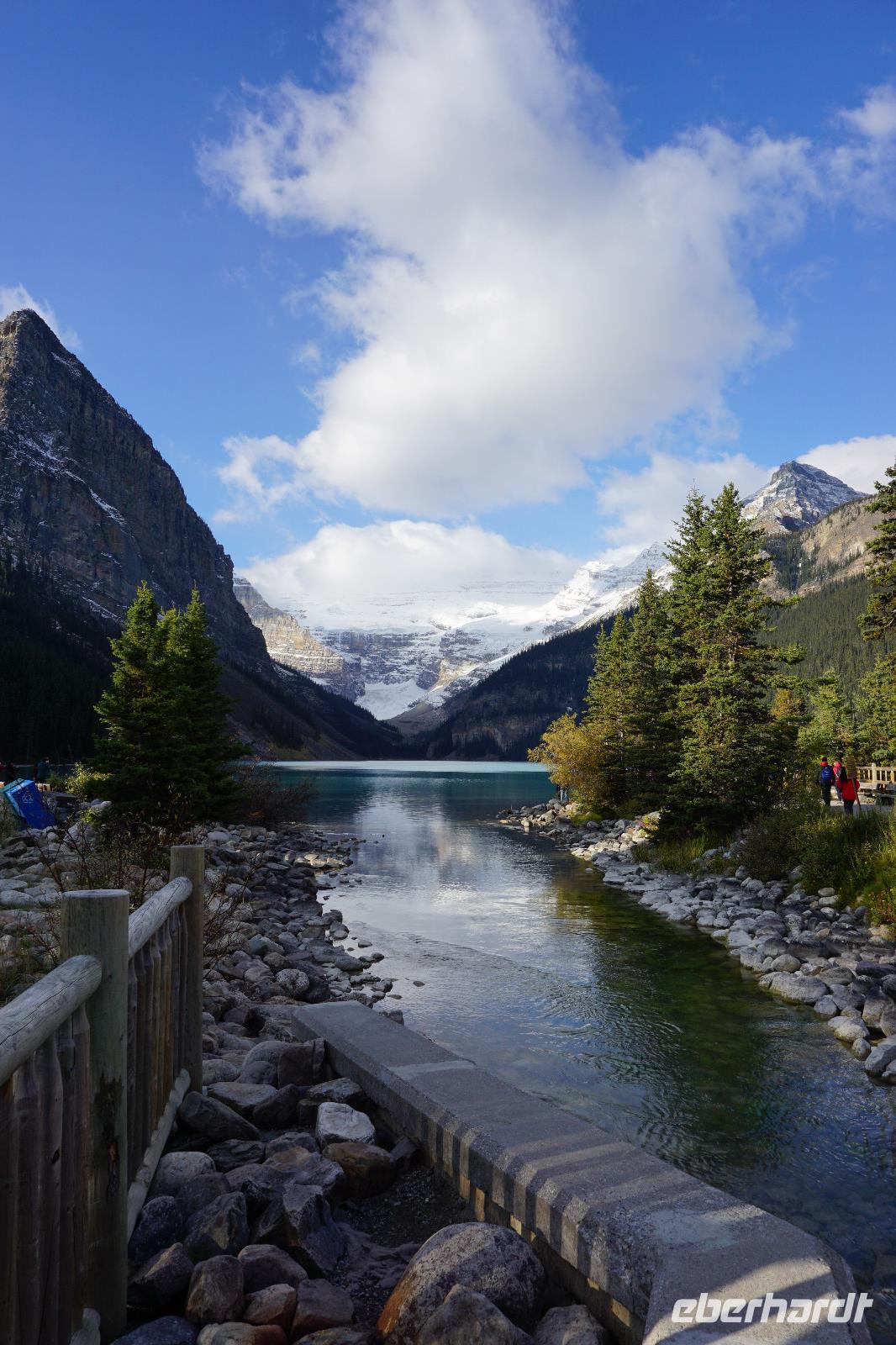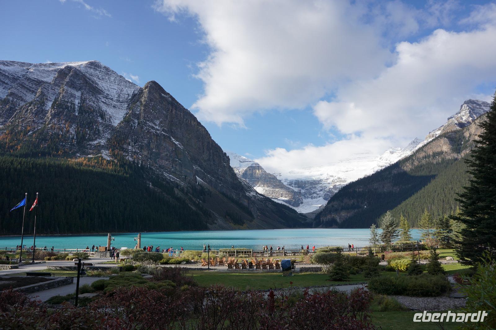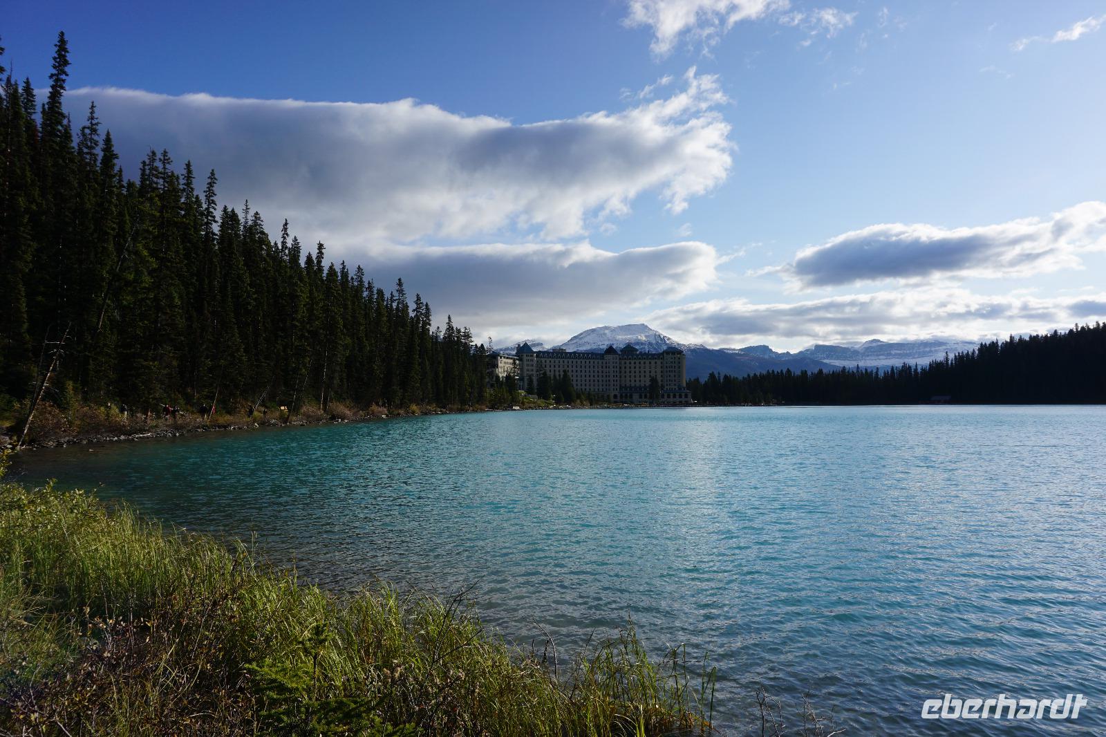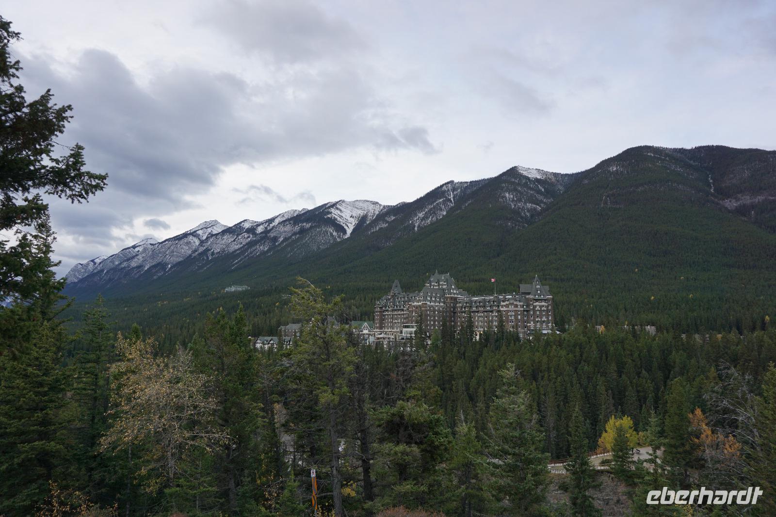 Nach einem leckeren Frühstück, begann unser Erlebnis im Banff-Nationalpark, der 6000 km² Fläche umfasst. Der Banff-Nationalpark war der erste Nationalpark Kanadas. Für den ersten Fotostopp hielten wir am Surprise View Point, von dem man einen sehr guten Blick auf das Fairmont Banff Springs Hotel hatte. Das Luxushotel ist ein ehemaliges Eisenbahnhotel der Canadian Pacific Railway und liegt spektakulär in den Rocky Mountains. Danach fuhren wir zum Aussichtspunkt der Hoodoos, von dem man auch sehr gut den Mount Rundle sehen konnte. Über den Kicking Horse Pass gelangten wir in den Yoho-Naionalpark, wo wir einen kurzen Blick auf die Spiral Tunnels werfen konnten, es fing kurz an zu schneien, hörte aber schnell wieder auf. Der Yoho-Nationalpark, der bereits in der Provinz British Columbia liegt, hat sich 1886 etabliert und umfasst eine Fläche von 1310 km². Kurze Zeit später erreichten wir den Emerald Lake (der größte von Yohos Seen), wo wir ein Stück am See entlang spazierten, bevor wir weiter zur Natürlichen Brücke und dem Kicking Horse River fuhren. Auf dem Weg zurück in den Banff-Nationalpark nach Lake Louise Village sahen wir den ersten Schwarzbären auf den Bahngleisen. Nach der Mittagspause wanderten wir, nach einer kurzen Busfahrt über den Bow Valley Parkway, entlang des Johnston Canyons, der durch den Johnston Creek geformt wird, zu den Lower Falls (Wasserfälle) und wieder zurück. Am Nachmittag erreichten wir wieder Banff, wo wir freie Zeit zur Verfügung fürs Bummeln, Spazieren, Essen oder anderen Unternehmungen hatten.