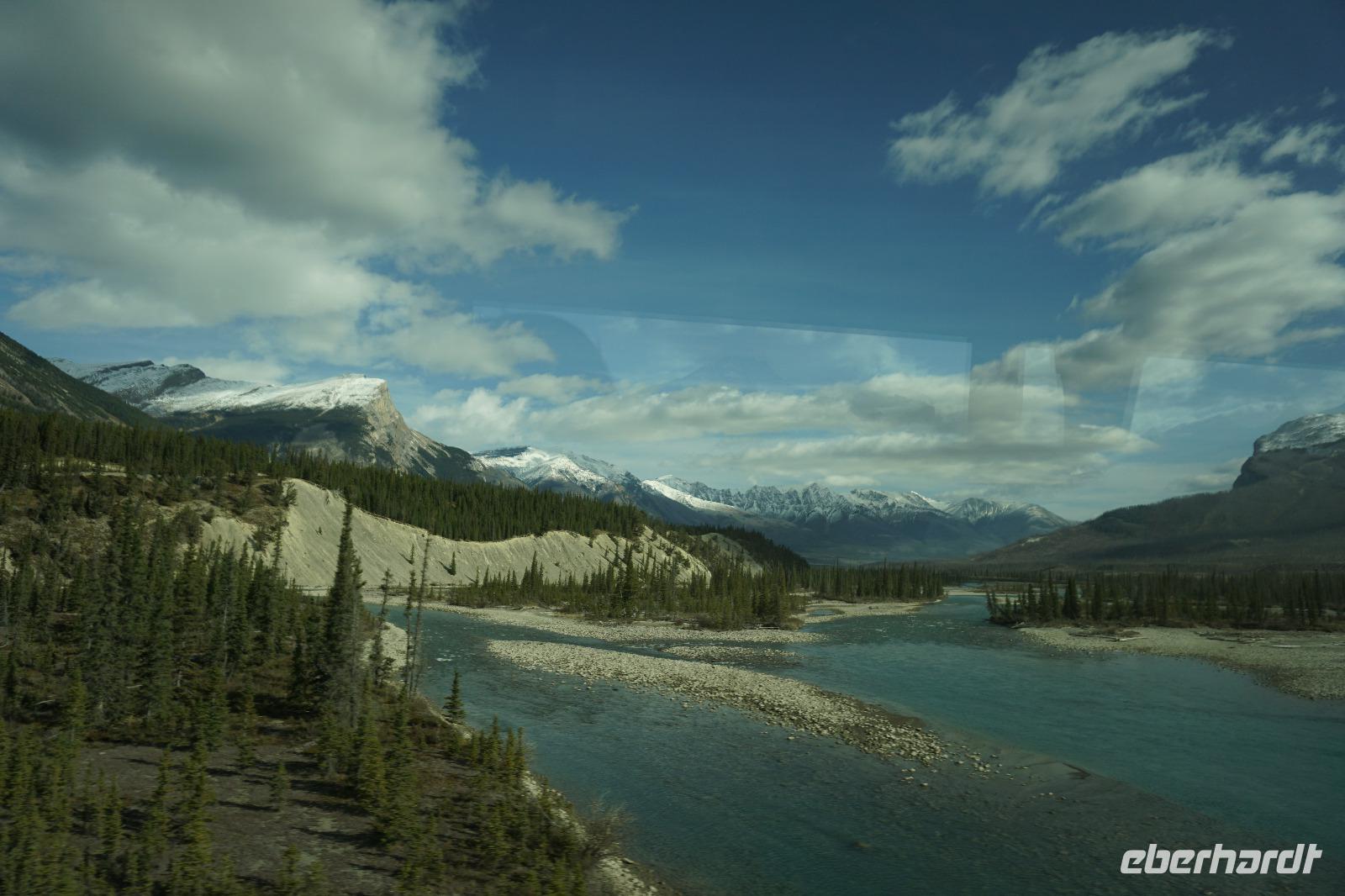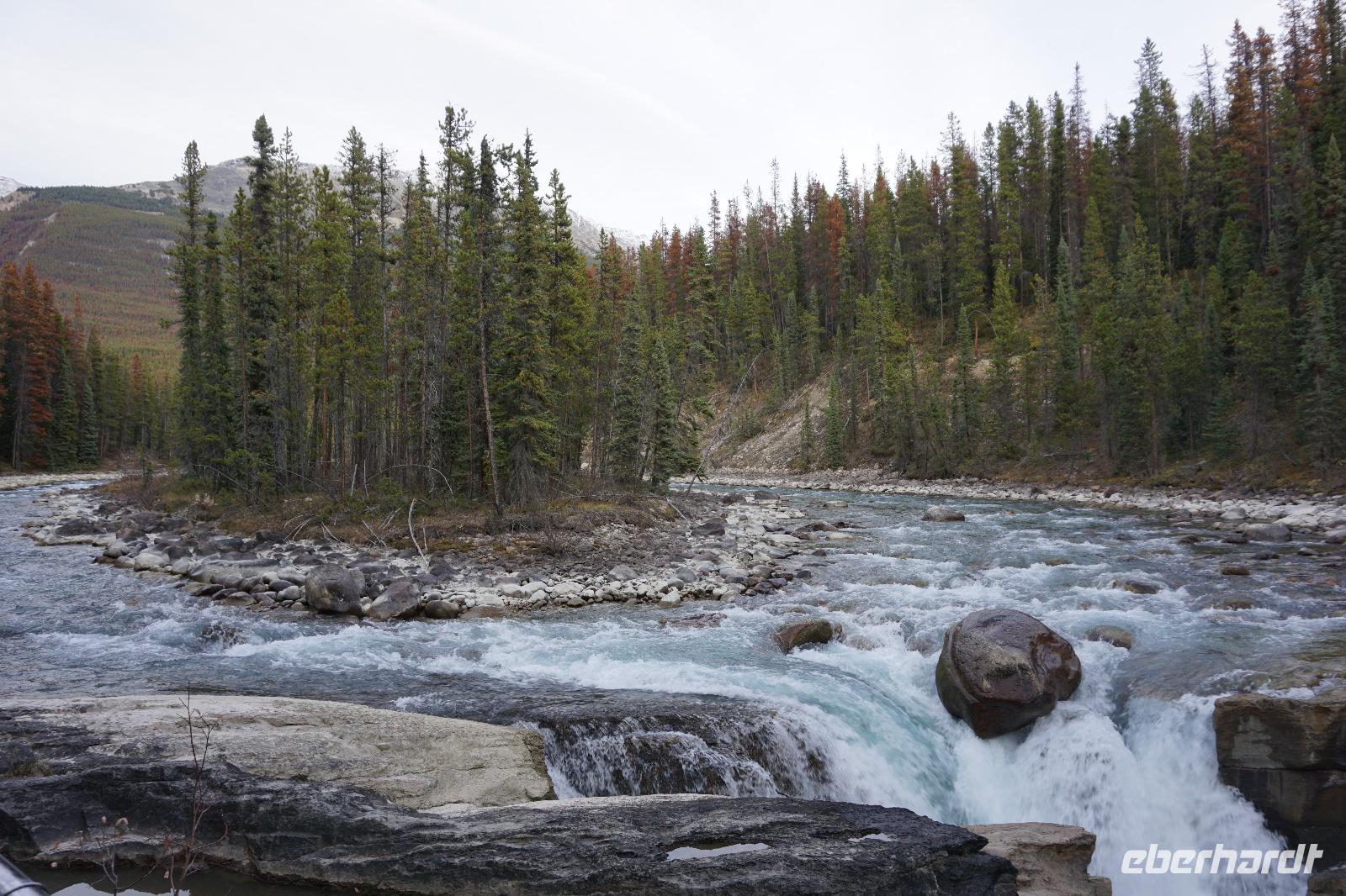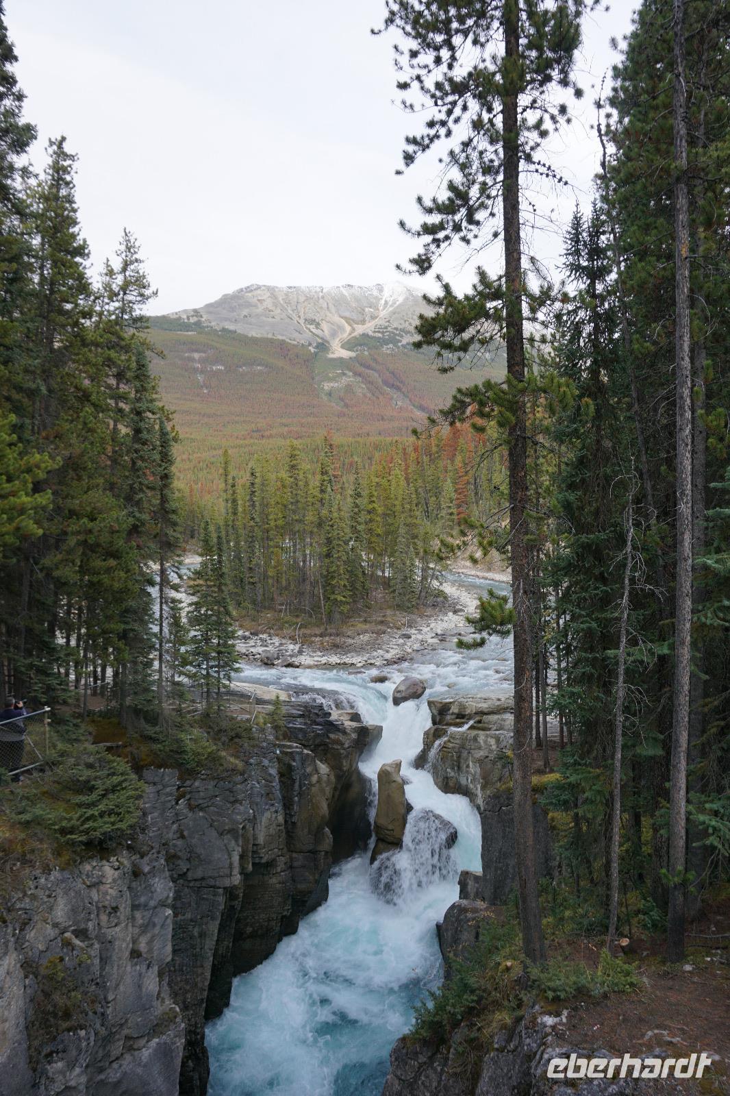 Am Morgen begrüßten uns vor dem Hotel zwei Wapitis, die gerade die Straße überquerten und dabei viele Schaulustige anzogen. Den ersten kurzen Fotostopp machten wir am Castle Mountain. Entlang der von der Sonne beleuchteten Rocky Mountains fuhren wir weiter über die Morant Curve (wundervolle Aussicht) zum Lake Louise, der von sechs Gletschern gespeist wird. Die türkisblaue Farbe des Sees stammt von Steinmehl, das von Gletscherschmelzwasser in den See gespült wird und auch als rock flour oder glacial flour bezeichnet wird. Lake Louise ist nach Prinzessin Louise Caroline Alberta, einer Tochter von Königin Victoria, benannt. Direkt am See befindet sich eines der Fairmont Hotels, das einzige mit direkter Lage am See. Bei strahlendem Sonnenschein schlossen wir uns den vielen anderen Touristen an und spazierten entlang des herrlich türkisblau glitzernden Sees mit dem Mount Victoria im Hintergrund. Ein paar Kanus fuhren auch auf dem Lake Louise. Im Anschluss führte unsere Reise weiter über den Icefield Parkway zum Bow Lake mit Blick auf den Crowfoot Gletscher. Unterwegs zogen endlose Wälder, Berge, Flüsse und Seen an uns vorbei. Über den Saskatchewan Fluss kamen wir zum Howse Pass Viewpoint, von dem man den gleichnamigen Pass sehr gut überblicken und fotografieren konnte. Unsere Mittagspause verbrachten wir am Athabasca Gletscher. Die Hälfte unserer Reisegruppe fuhr mit dem Ice Explorer, einem Schneebus mit riesigen Reifen, nach oben auf das Eisfeld. Wir teilten uns den Bus mit einer Gruppe Chinesen, die alles fotografierten, was sie taten und ihnen vor die Linse kam. Auf dem Weg dorthin fuhr man über Kanadas steilste Straße mit 32% Gefälle und hatte eine fantastische Sicht in das Tal, auf den Gletscher und die umliegenden Berge. Als wir oben ankamen, hatten wir ein bisschen Zeit um auszusteigen und eine Runde zu gehen oder Fotos zu schießen. Draußen waren minus 22°C, es wehte ein starker Wind und war an manchen Stellen sehr glatt, aber die Sonne schien und wir wurden mit einer grandiosen Aussicht belohnt. Wieder unten angekommen ging es weiter entlang des Sunwapta Flusses im Sunwapta Tal, was so viel wie schnell fließendes Wasser heißt, zu unserer nächsten Unterkunft. Die Lodge lag umgeben von Wald, weit entfernt vom nächsten Ort. Inmitten kaum berührter Natur spazierten wir am Abend zum Sunwapta Wasserfall, bevor wir im Restaurant der Lodge speisten. Es gab als Vorspeise Kartoffelsuppe oder Salat, als Hauptgericht kanadischen Lachs oder Hühnchen und warmen Apfelkuchen als Dessert.