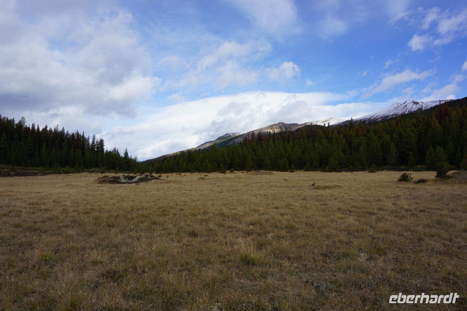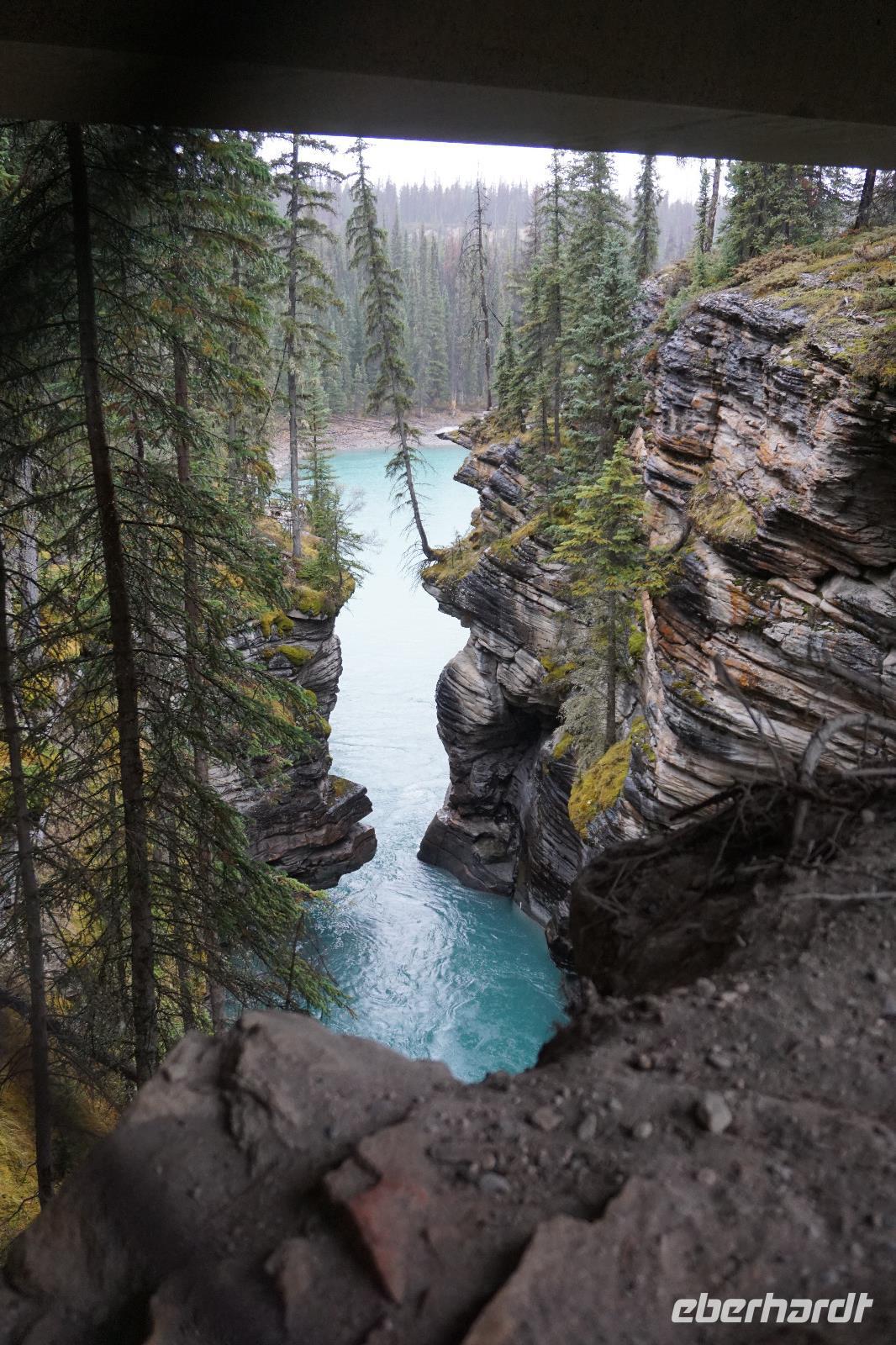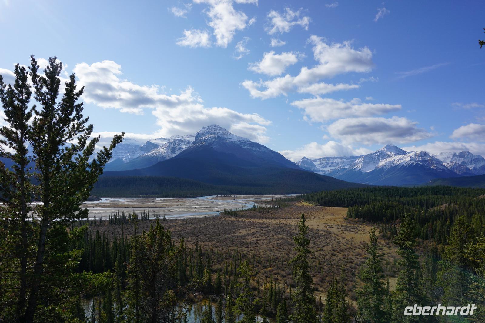 Am Morgen begrüßten uns vor dem Hotel zwei Wapitis, die gerade die Straße überquerten und dabei viele Schaulustige anzogen. Den ersten kurzen Fotostopp machten wir am Castle Mountain. Entlang der von der Sonne beleuchteten Rocky Mountains fuhren wir weiter über die Morant Curve (wundervolle Aussicht) zum Lake Louise, der von sechs Gletschern gespeist wird. Die türkisblaue Farbe des Sees stammt von Steinmehl, das von Gletscherschmelzwasser in den See gespült wird und auch als rock flour oder glacial flour bezeichnet wird. Lake Louise ist nach Prinzessin Louise Caroline Alberta, einer Tochter von Königin Victoria, benannt. Direkt am See befindet sich eines der Fairmont Hotels, das einzige mit direkter Lage am See. Bei strahlendem Sonnenschein schlossen wir uns den vielen anderen Touristen an und spazierten entlang des herrlich türkisblau glitzernden Sees mit dem Mount Victoria im Hintergrund. Ein paar Kanus fuhren auch auf dem Lake Louise. Im Anschluss führte unsere Reise weiter über den Icefield Parkway zum Bow Lake mit Blick auf den Crowfoot Gletscher. Unterwegs zogen endlose Wälder, Berge, Flüsse und Seen an uns vorbei. Über den Saskatchewan Fluss kamen wir zum Howse Pass Viewpoint, von dem man den gleichnamigen Pass sehr gut überblicken und fotografieren konnte. Unsere Mittagspause verbrachten wir am Athabasca Gletscher. Die Hälfte unserer Reisegruppe fuhr mit dem Ice Explorer, einem Schneebus mit riesigen Reifen, nach oben auf das Eisfeld. Wir teilten uns den Bus mit einer Gruppe Chinesen, die alles fotografierten, was sie taten und ihnen vor die Linse kam. Auf dem Weg dorthin fuhr man über Kanadas steilste Straße mit 32% Gefälle und hatte eine fantastische Sicht in das Tal, auf den Gletscher und die umliegenden Berge. Als wir oben ankamen, hatten wir ein bisschen Zeit um auszusteigen und eine Runde zu gehen oder Fotos zu schießen. Draußen waren minus 22°C, es wehte ein starker Wind und war an manchen Stellen sehr glatt, aber die Sonne schien und wir wurden mit einer grandiosen Aussicht belohnt. Wieder unten angekommen ging es weiter entlang des Sunwapta Flusses im Sunwapta Tal, was so viel wie schnell fließendes Wasser heißt, zu unserer nächsten Unterkunft. Die Lodge lag umgeben von Wald, weit entfernt vom nächsten Ort. Inmitten kaum berührter Natur spazierten wir am Abend zum Sunwapta Wasserfall, bevor wir im Restaurant der Lodge speisten. Es gab als Vorspeise Kartoffelsuppe oder Salat, als Hauptgericht kanadischen Lachs oder Hühnchen und warmen Apfelkuchen als Dessert.