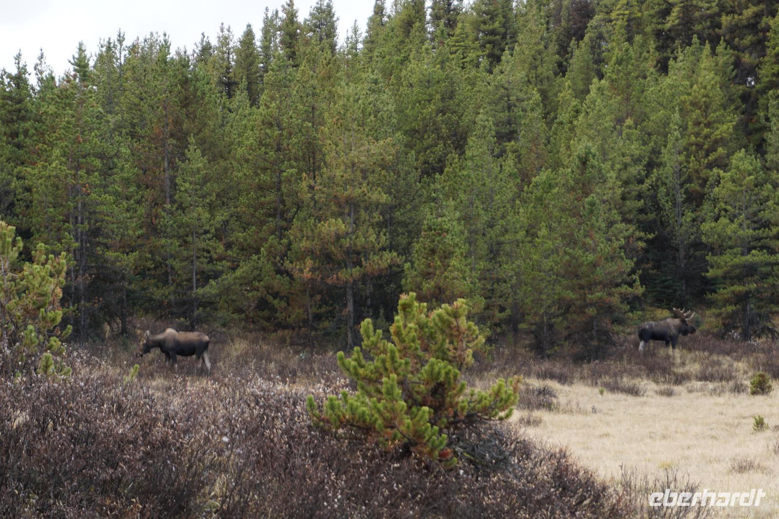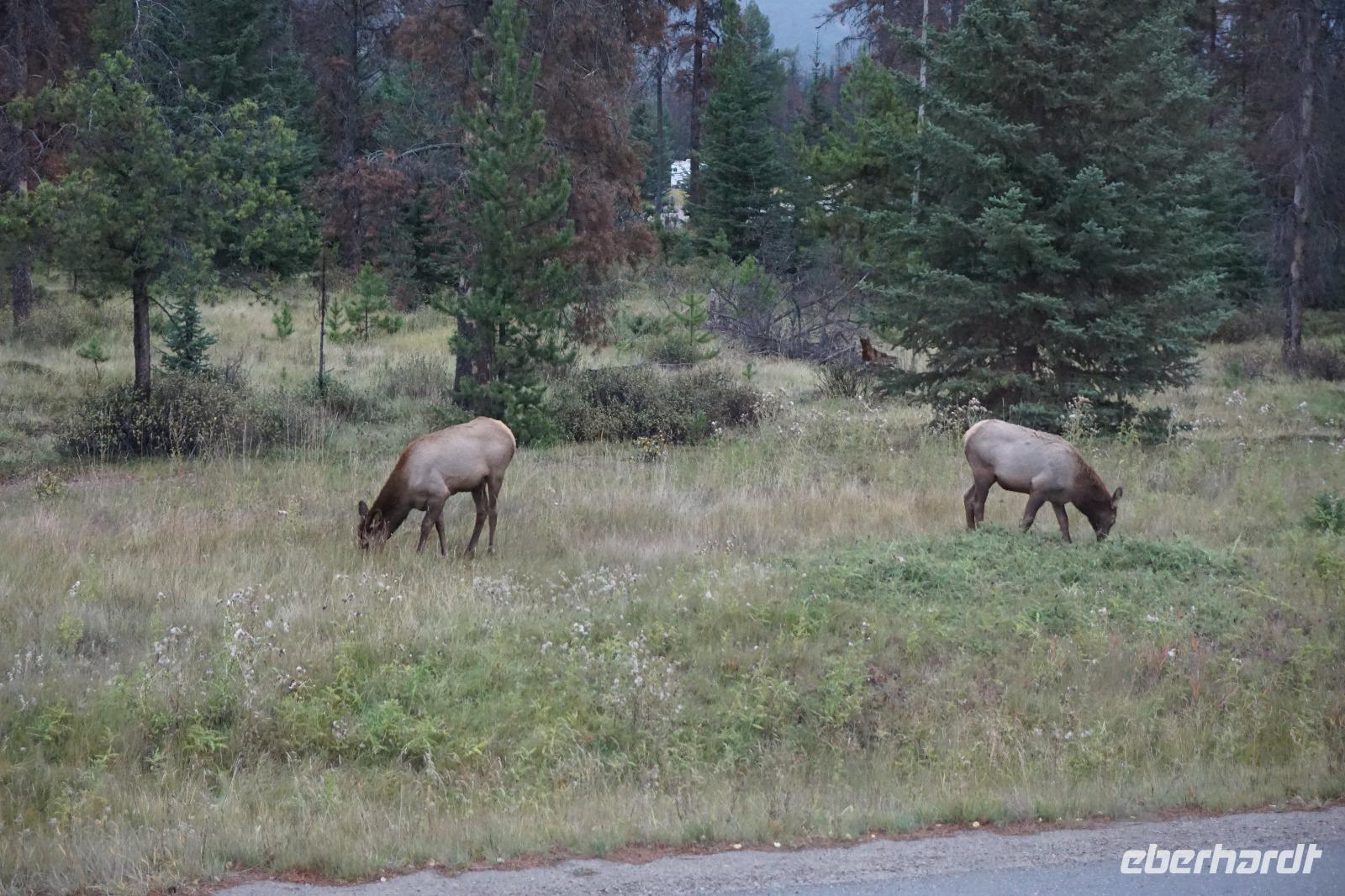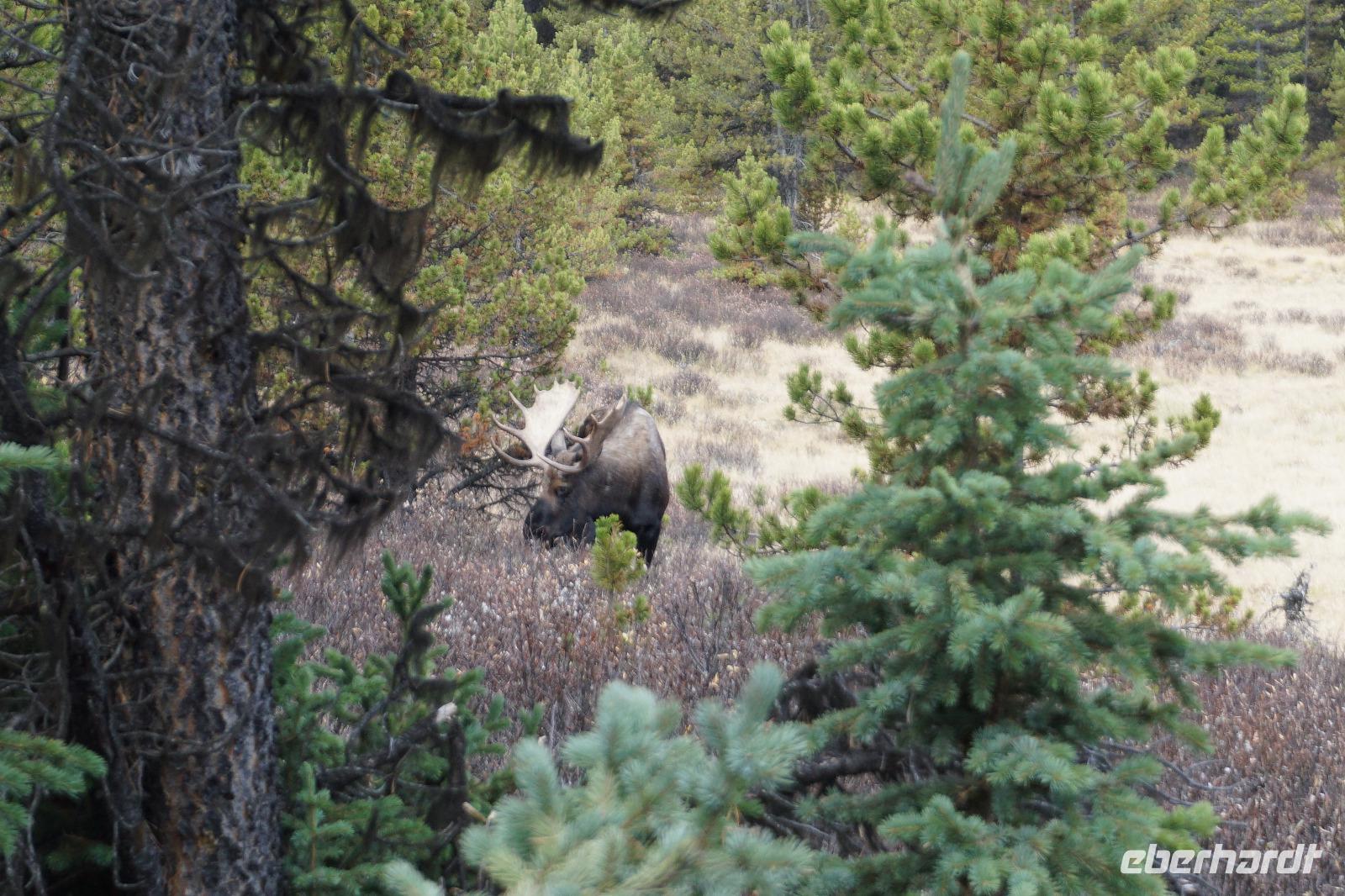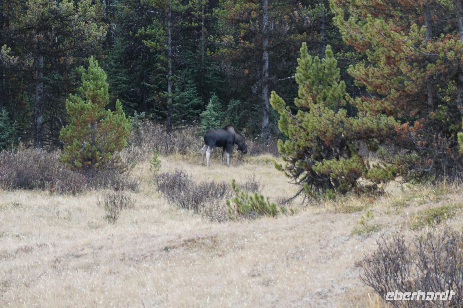 Nach einem ausgiebigen und leckeren Frühstück fuhren wir Richtung Jasper zum Maligne Lake über den Athabasca Fluss. Auf dem Weg dorthin sahen wir ein paar Wapitis am Straßenrand grasen. Am Medicine Lake, dessen Wasser immer weniger wird, hielten wir für einige Fotos und kamen kurze Zeit später am Rosemary Rock vorbei. Am wunderschönen Maligne Lake gingen wir entlang des Mary Schäfer Rundwegs bis zu einem Aussichtspunkt, an dem sich die Gruppe teilte. Ein paar Leute gingen zurück, die anderen liefen weiter entlang des Rundweges durch den Wald. Kurz vorm Ende des Weges kamen wir an einer Lichtung vorbei, auf der wir zwei Elchkühe und einen Elch sahen, die gemütlich am Rande der Lichtung Gras futterten. Leise und mit Abstand wagten wir uns auf die Lichtung vor, um einige gute Fotos zu schießen und die beeindruckenden Tiere zu beobachten. Wir schlichen vorsichtig weiter entlang des Rundweges, der nur ca. zehn Meter von einem der Elche entfernt war. Mit einem Elch wollten wir es lieber nicht aufnehmen. Kurze Zeit später kamen wir wieder auf dem Parkplatz an und berichteten den anderen von unserer Begegnung mit den großen Tieren. Auf dem Weg zum Maligne Canyon erzählten einige von uns amüsante Witze. Am Canyon gab es für alle eine kleine (oder große) Kostprobe kanadischen Whiskys mit Ahornsirup. Gut gestärkt spazierten wir weiter entlang des Canyons, einige mit Marion bis zur dritten Brücke, die Mehrheit nur über die erste und zweite Brücke. Wir bestaunten immer wieder die Kraft der gewaltigen Wassermassen. Im Ort Jasper war viel Zeit um Mittag zu essen, durch die Straßen zu bummeln oder einzukaufen. Leider fing es dann an zu regnen und war draußen nicht sehr gemütlich. Nachmittags besuchten wir die Athabasca Wasserfälle, wo es auch von oben ziemlich nass wurde. Bei strömendem Regen fuhren wir zurück zur Unterkunft. Die wolkenverhangenen Berge, die an uns vorbeizogen, hatten etwas Mystisches. Unterwegs sahen wir noch einmal vier junge Wapitis am Straßenrand. In der Lodge hatten wir noch etwas Zeit bis zum Abendessen. Es fing an zu schneien.