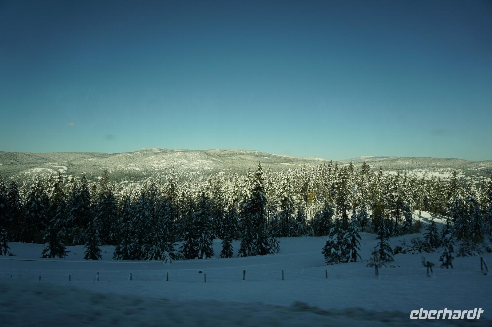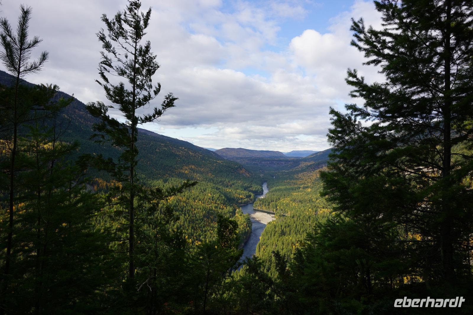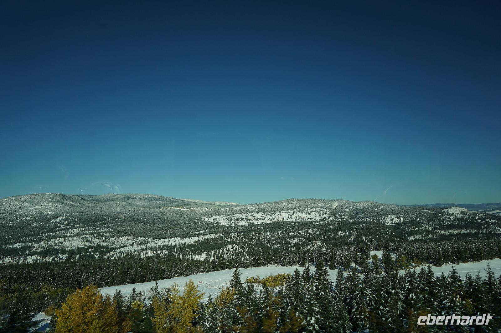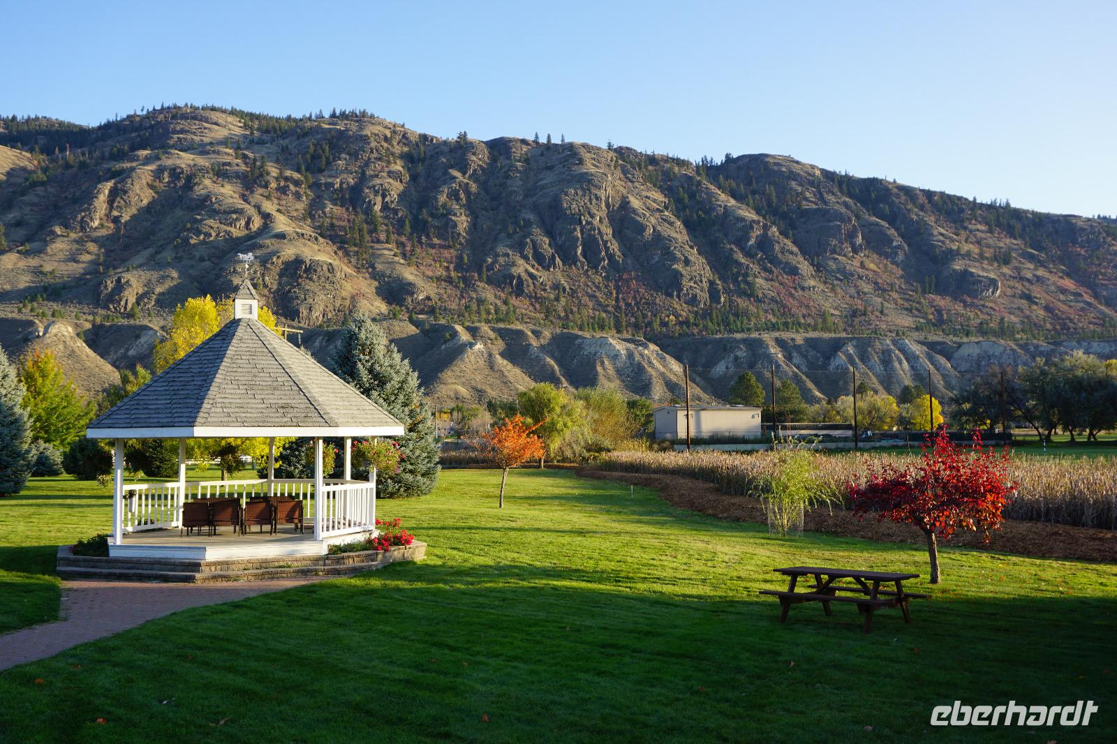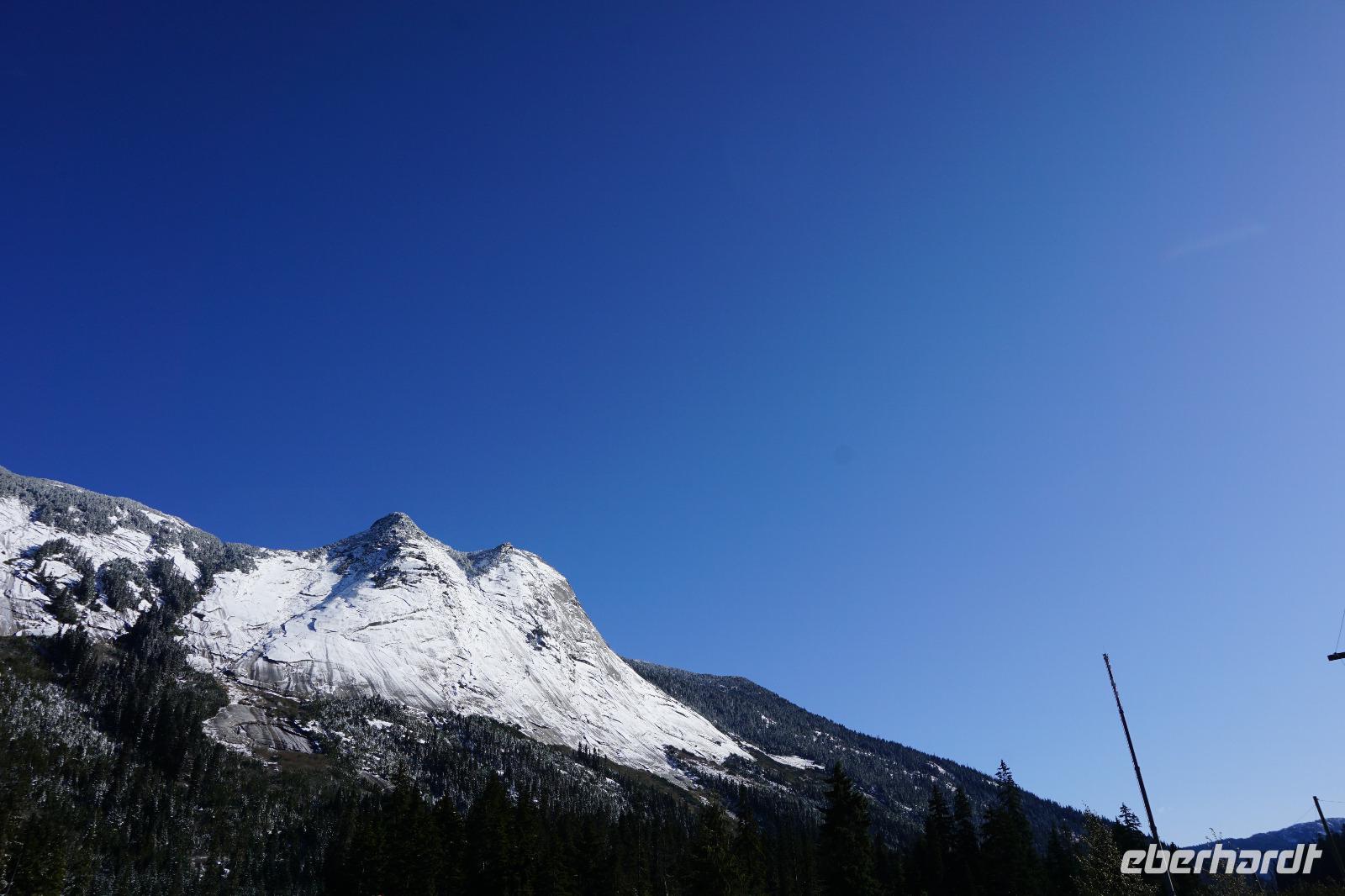 Knackige minus 6°C und fünf Zentimeter Schnee erwarteten uns am Morgen draußen. Vom reichlichen Frühstück gestärkt traten wir unsere Weiterfahrt nach British Columbia an. Am Anfang hatten wir noch eine weiße, vom Schnee bedeckte Straße, kurze Zeit später wurde es weniger und dann lag gar kein Schnee mehr. Den ersten Fotostopp machten wir am Yellowhead Pass mit dem Portal Lake, wo auch der Eingang zum Mount Robson Provincial Park ist. Hier stellten wir unsere Uhren nochmal um eine Stunde zurück, da wir soeben die Grenze zu British Columbia überfahren hatten. Wir fuhren weiter entlang des Fraser Flusses, der wichtig für die Lachswanderung ist. Unterwegs sahen wir ein paar versteckte Elche, aber so schnell konnte der Bus leider nicht anhalten. Wir passierten den Moose Lake, der 11,4 km lang und an seiner tiefsten Stelle 84 m tief ist. Als nächstes verbrachten wir etwas Zeit am Mount Robson Besucherzentrum, bevor wir weiter Richtung Kamloops fuhren. Mount Robson ist 3.954 Meter hoch und damit der höchste Berg der kanadischen Rocky Mountains. Unterwegs hielten wir für eine technische Pause im kleinen Ort Blue River. Wir bogen vom Highway ab auf eine sehr abenteuerliche Straße, die uns zum Aussichtspunkt des Little Hells Gate (kleiner Hölleneingang) brachte. Nach einem kurzen Stopp im Supermarkt in Clearwater, machten wir unsere Mittagspause im Gateway Grill im gleichen Ort. Es gab richtig leckeres Steak mit Kartoffeln, Salat und ein himmlisches Dessert. Da wir vom Essen sehr satt waren, wanderten wir im Wells Gray Provincial Park noch durch den Wald zum Spahat Creek Wasserfall. Am Nachmittag fuhren wir weiter und erreichten am Abend unsere gemütliche Guest Ranch, direkt am South Thompson Fluss gelegen. Später versuchten wir es noch mit einem Lagerfeuer draußen mit Smoars (geröstetes Marschmallow zwischen zwei Keksen und einem Stück Schokolade - süß und lecker), was aber nicht sehr lange dauerte, da es einfach zu windig und ungemütlich wurde.