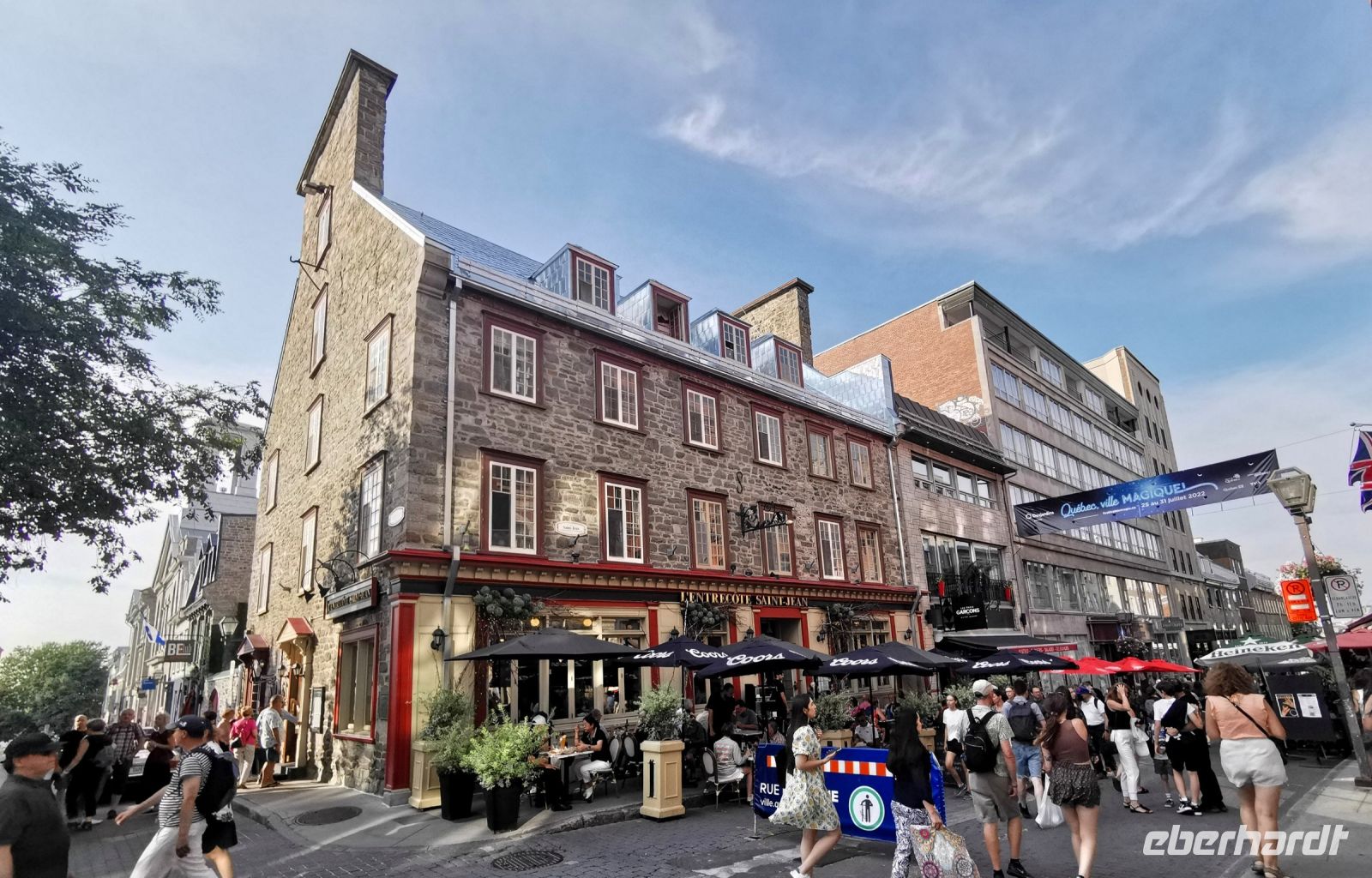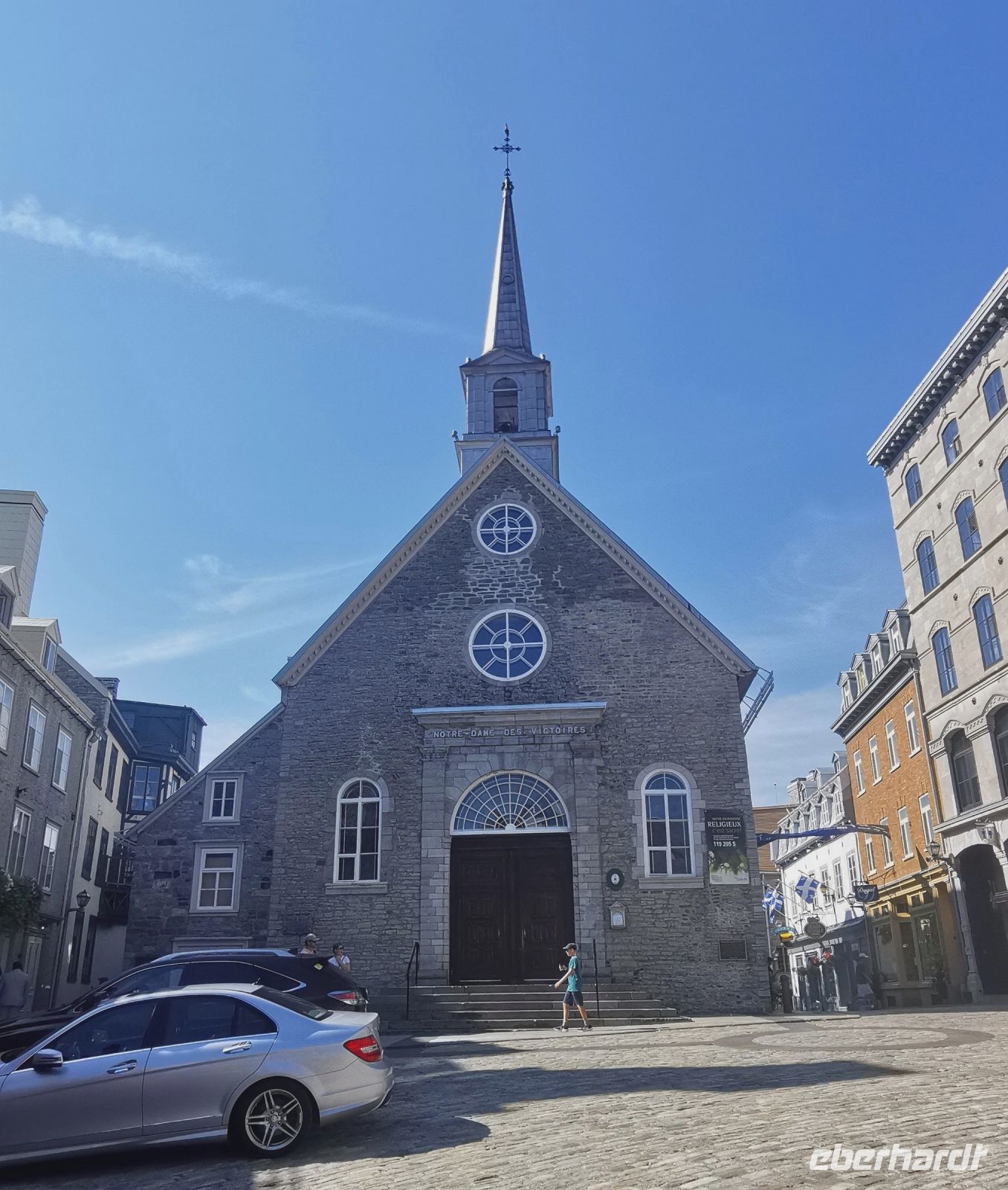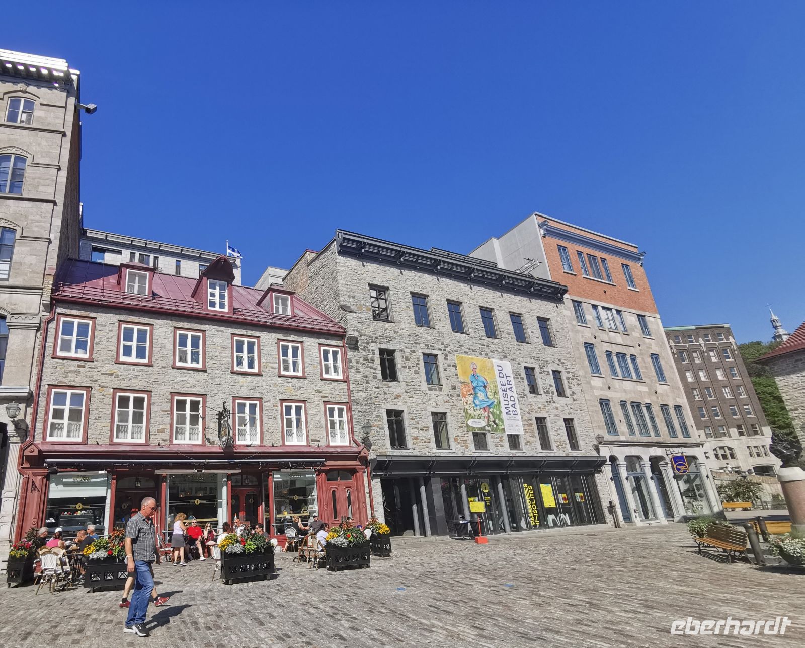 Am heutigen Morgen brechen wir nochmals zur Altstadt Quebecs auf, wir beginnen unseren Spaziergang in Basse Ville, der so genannten Unterstadt. Dieser Teil der Altstadt ist einige Jahre älter als die 90 Meter höher gelegene Haute Ville, die Oberstadt. Am heutigen Place Royale entstand unter der Leitung von Samuel de Champlain die erste kleine Ansiedlung von Häusern direkt am Sankt Lorenz Strom. Bei einem Stadtbrand 1682 wurde alles zerstört. Danach errichtete man 1688 die Notre Dame de Victoires Kirche als erstes Gebäude auf dem Platz. Sie war damals die einzige ganz aus Stein bestehende Kirche Nordamerikas und um sie herum entstanden nach und nach Wohnhäuser ebenfalls aus Stein, die man in den 1970er Jahren liebevoll sanierte. Dieser Platz ist wunderhübsch anzusehen und üppig bepflanzt mit wunderschönen Blumenarrangements.