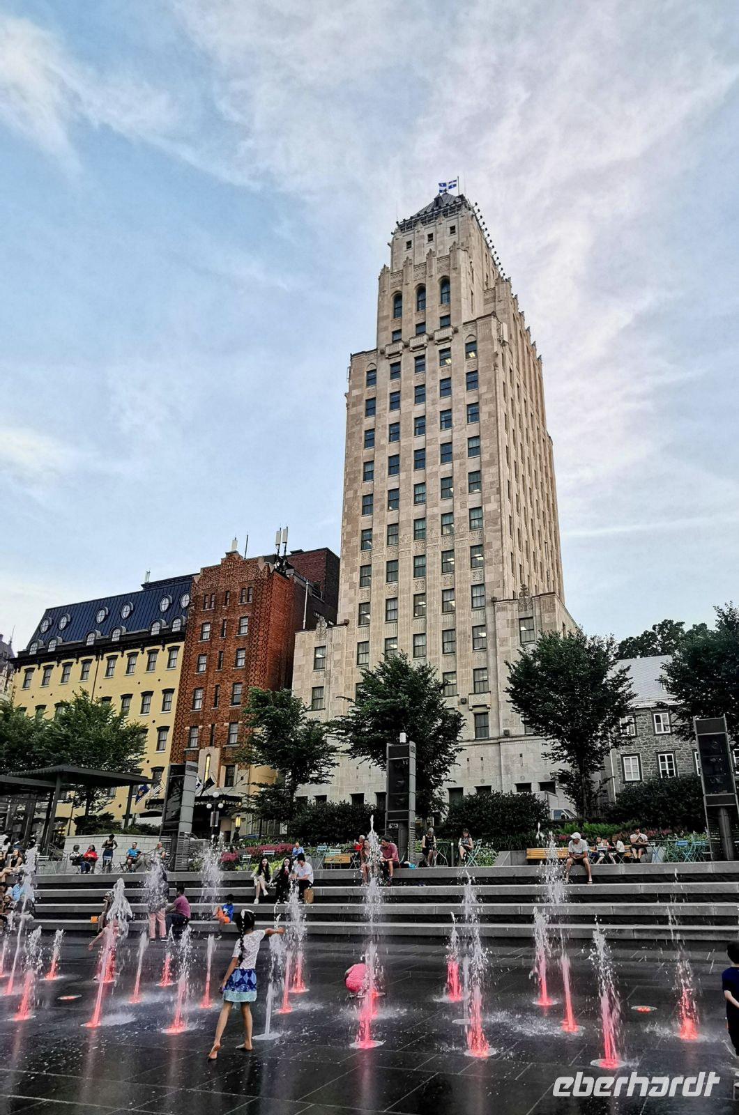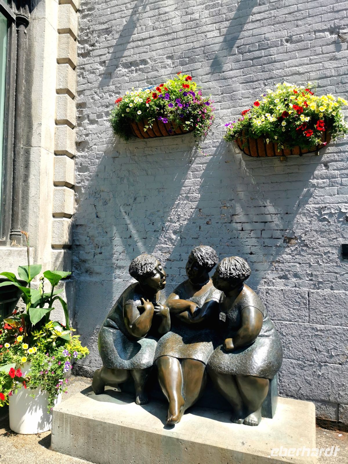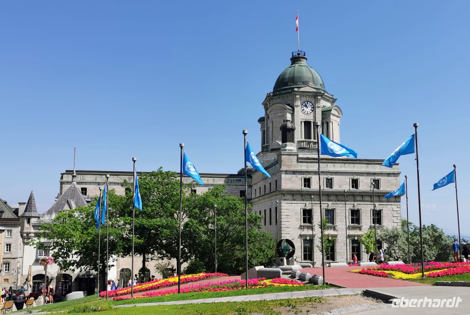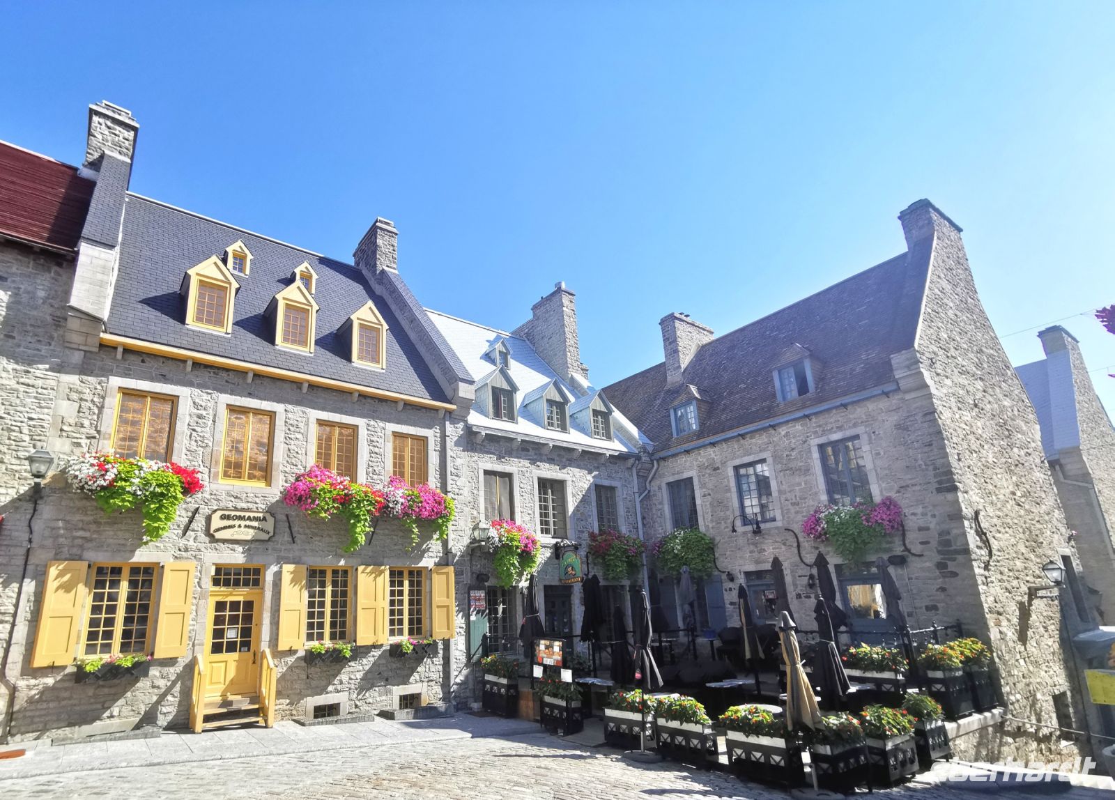 Am heutigen Morgen brechen wir nochmals zur Altstadt Quebecs auf, wir beginnen unseren Spaziergang in Basse Ville, der so genannten Unterstadt. Dieser Teil der Altstadt ist einige Jahre älter als die 90 Meter höher gelegene Haute Ville, die Oberstadt. Am heutigen Place Royale entstand unter der Leitung von Samuel de Champlain die erste kleine Ansiedlung von Häusern direkt am Sankt Lorenz Strom. Bei einem Stadtbrand 1682 wurde alles zerstört. Danach errichtete man 1688 die Notre Dame de Victoires Kirche als erstes Gebäude auf dem Platz. Sie war damals die einzige ganz aus Stein bestehende Kirche Nordamerikas und um sie herum entstanden nach und nach Wohnhäuser ebenfalls aus Stein, die man in den 1970er Jahren liebevoll sanierte. Dieser Platz ist wunderhübsch anzusehen und üppig bepflanzt mit wunderschönen Blumenarrangements.