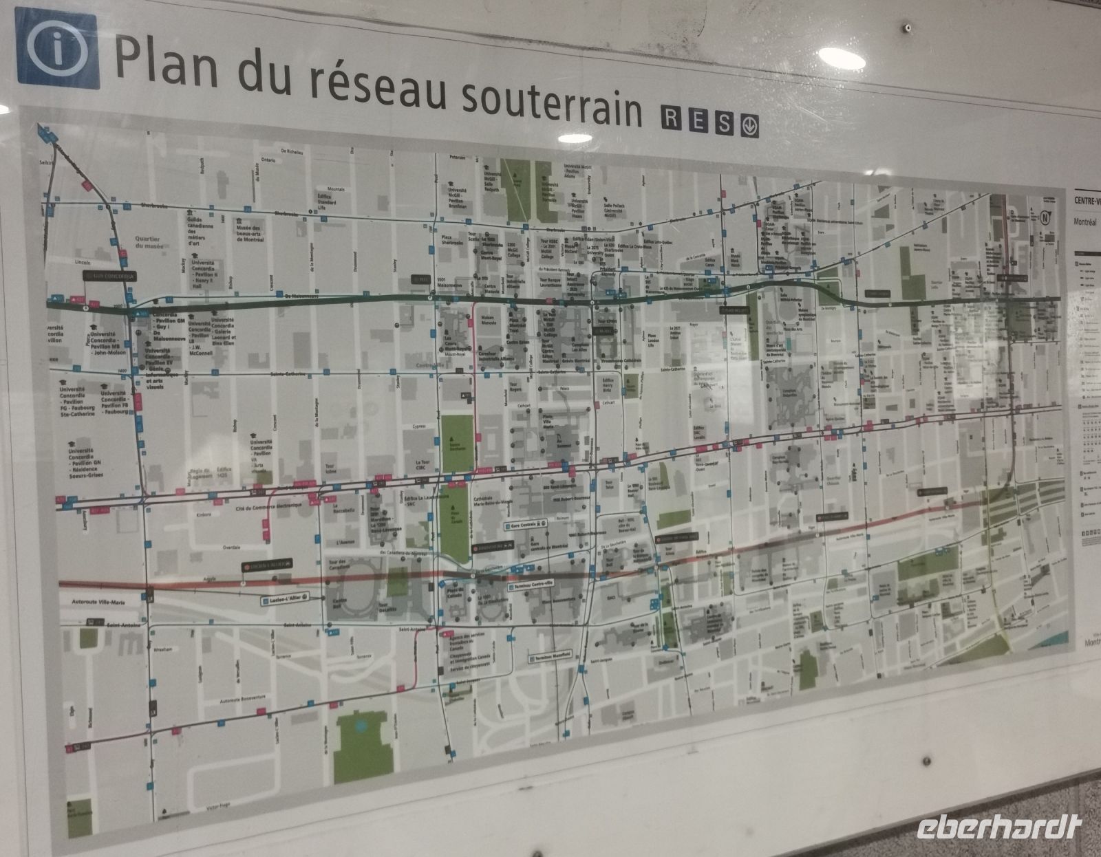 Nun fahren wir wieder hinab und wollen der Untergrundstadt einen kurzen Besuch abstatten. Das sogenannte Souterrain wird auch Réso genannt und ist ein weit verzweigtes Netzwerk von Fußgängertunneln und unterirdischen Ladenpassagen, die es den Bewohnern ermöglichen, an kalten Wintertagen von ihren Wohnungen unterirdisch zur Arbeit zu kommen, ohne durch tiefen Schnee stapfen oder frieren zu müssen. Die Tunnel und Passagen sind beheizt und sogar die Metro fährt durch sie hindurch. Eine unterirdische Parallelwelt sozusagen.