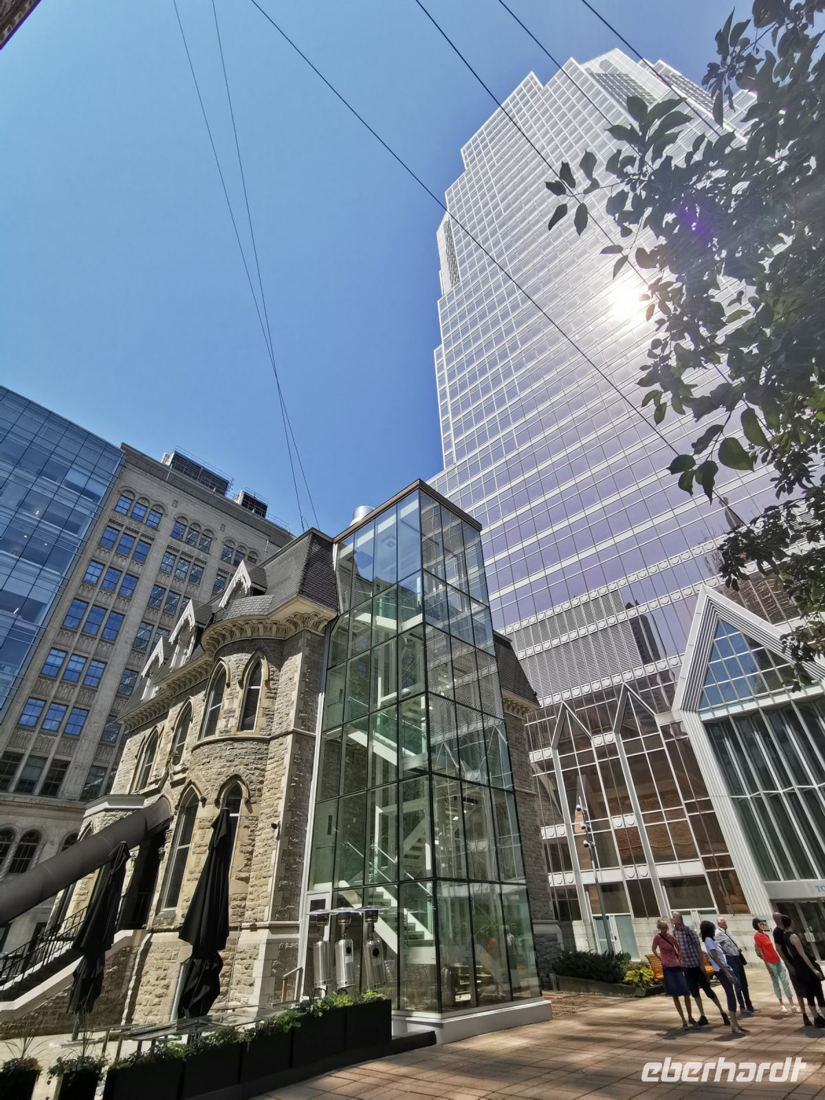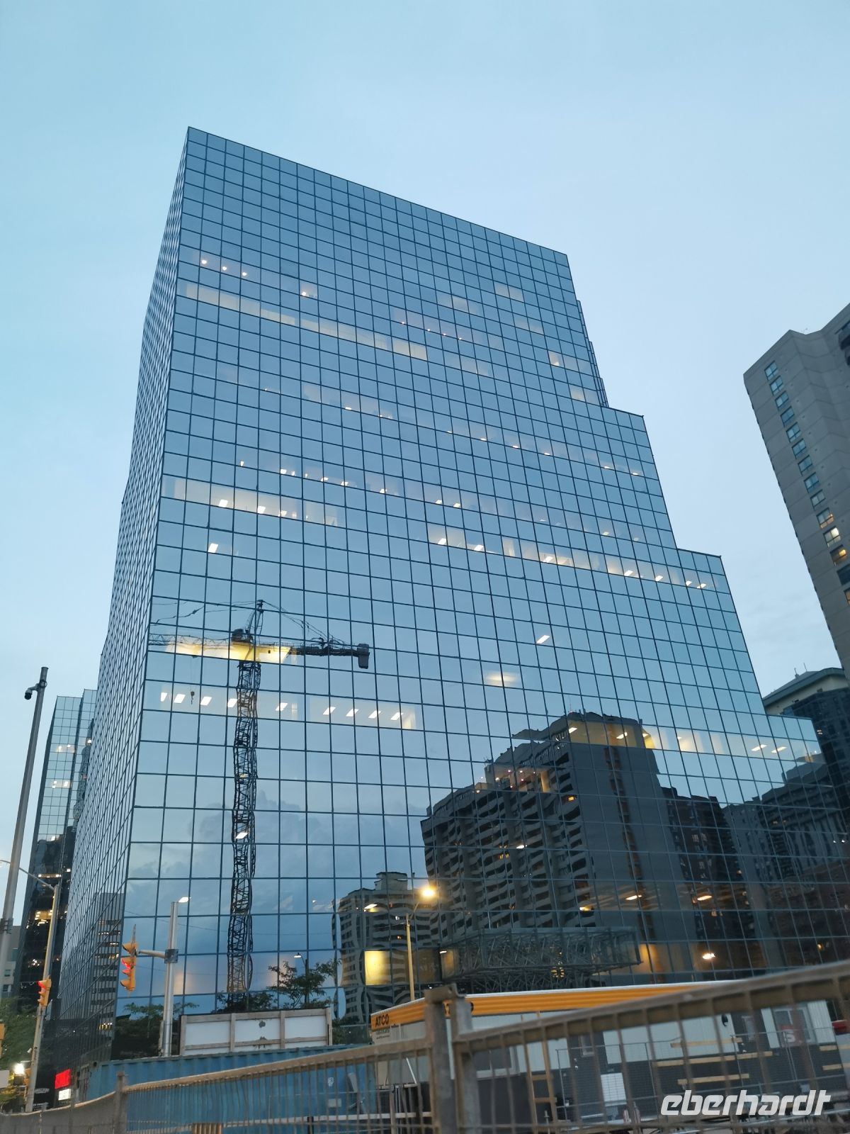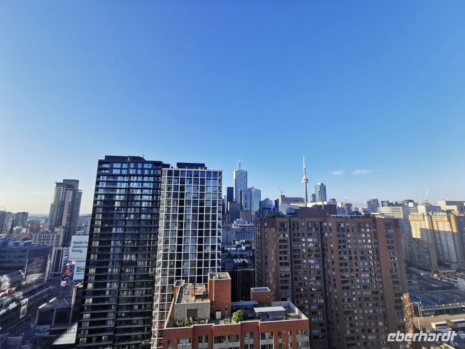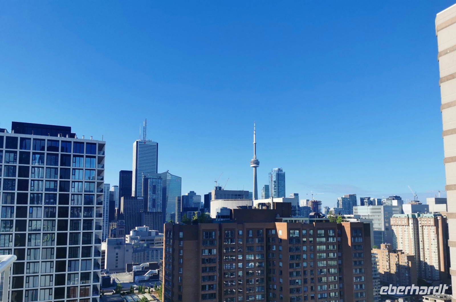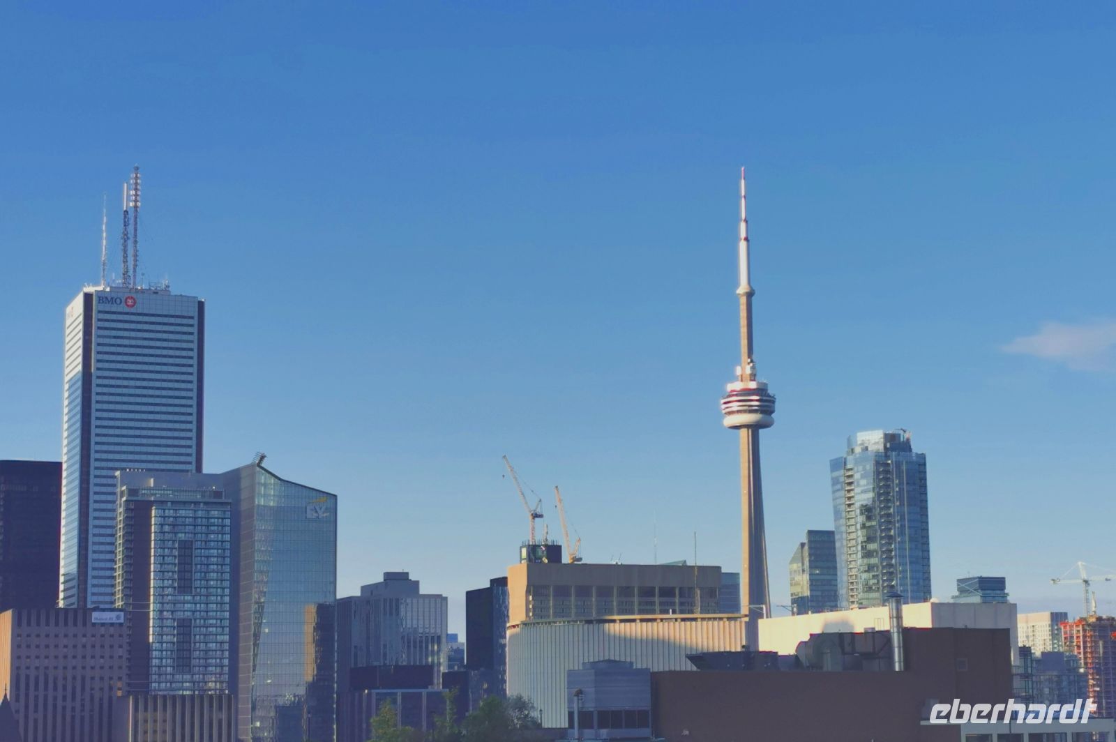 An diesem Morgen erkunden wir das riesige Toronto. Den CN Tower können wir schon bei Sonnenaufgang von der Dachterrasse unseres Hotels aus sehen. Der Name dieser Stadt leitet sich aus dem indianischen Wort tkaronto ab, was soviel bedeutet wie: Ort, an dem Bäume am Wasser stehen und später Ort der Zusammenkünfte. Die weißen Einwanderer nannten die Stadt vorerst York, zur besseren Unterscheidung von New York wurde sie dann 1834 in Toronto umbenannt.