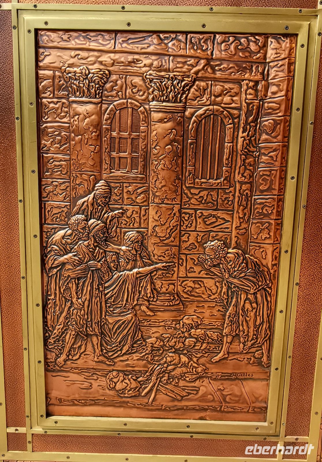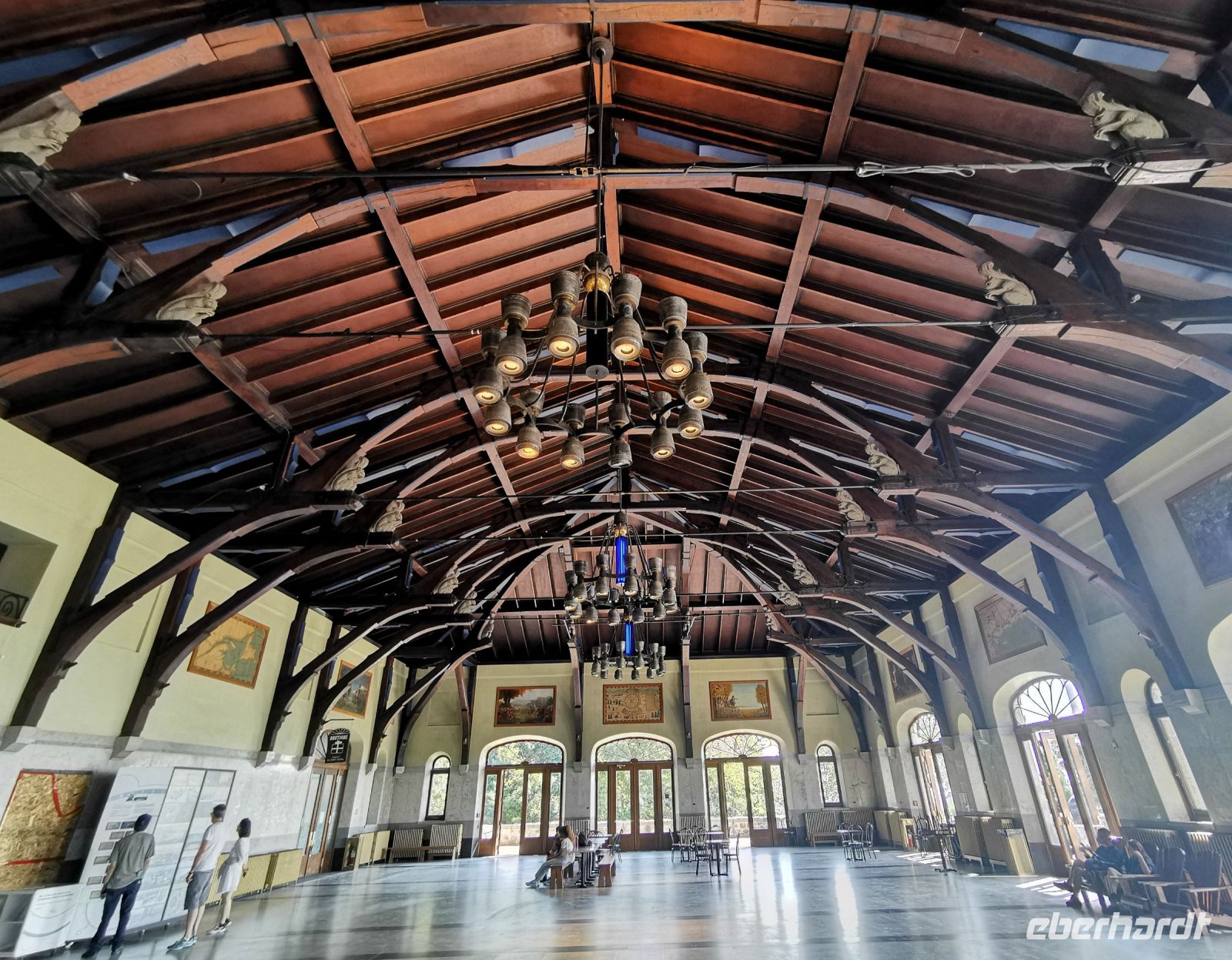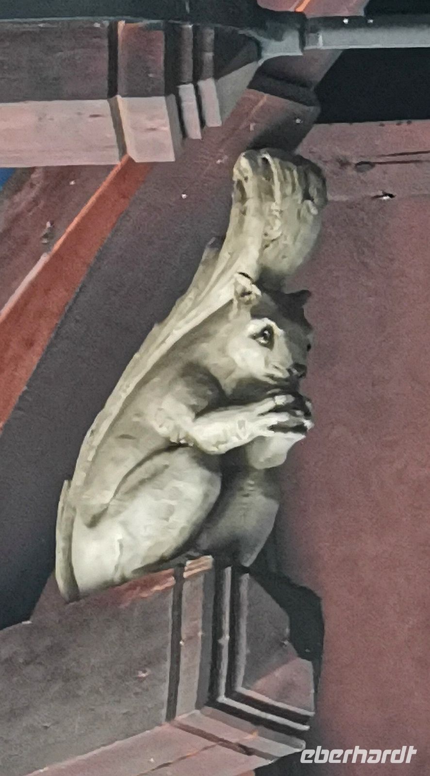 Wir erklimmen mit unserem renovierten Schulbus den Hausberg der Stadt, den sogenannten Mont Royal. Er thront ganze 233 Meter über der Stadt und aus seinem Namen leitet sich Montreal ab. Oben angekommen genießen wir zuerst den Panoramablick von der Aussichtsterrasse, erspähen das Antlitz von Leonhard Cohen, der hier geboren wurde, sehen den Sankt-Lorenz-Strom und die Pont Jaques Cartier Brücke. Danach laufen wir durch das auf dem Hügel gelegene Chalet du Mont Royale, welches 1922 eingeweiht wurde. Es hat eine große Halle, in der mindestens 500 Leute Platz finden. Die Decke erinnert an einen Schiffsrumpf und ist mit geschnitzten Eichhörnchen verziert.