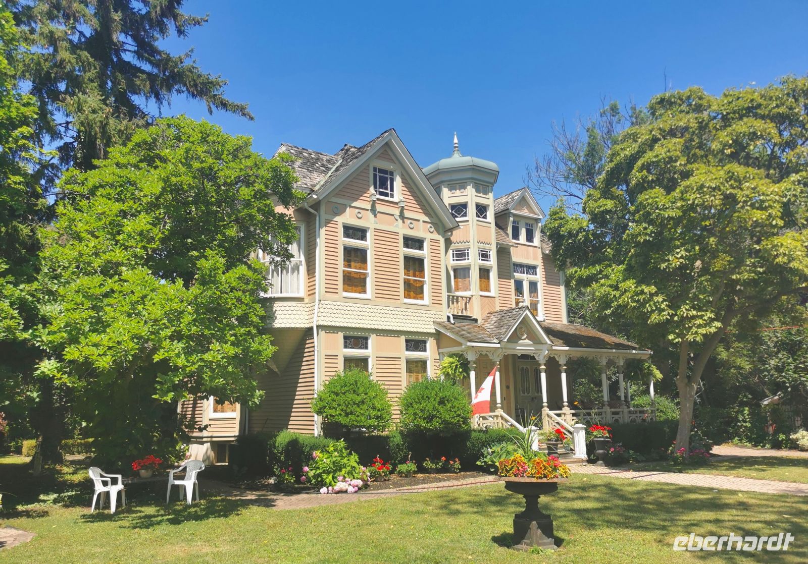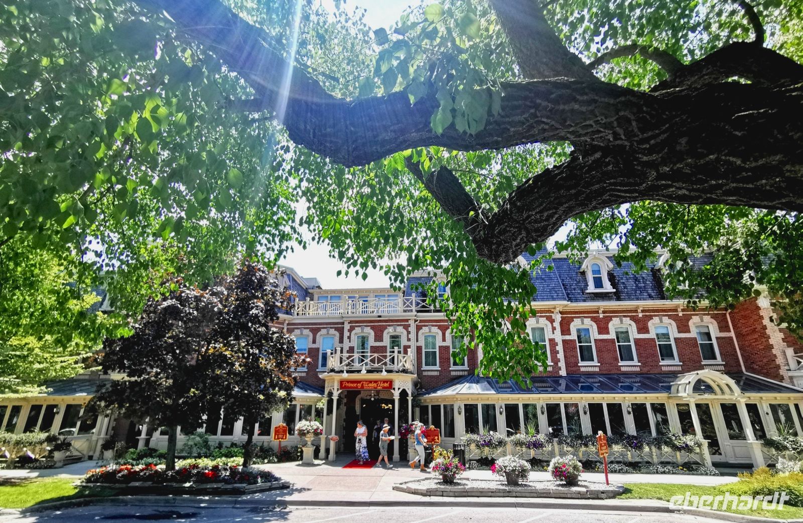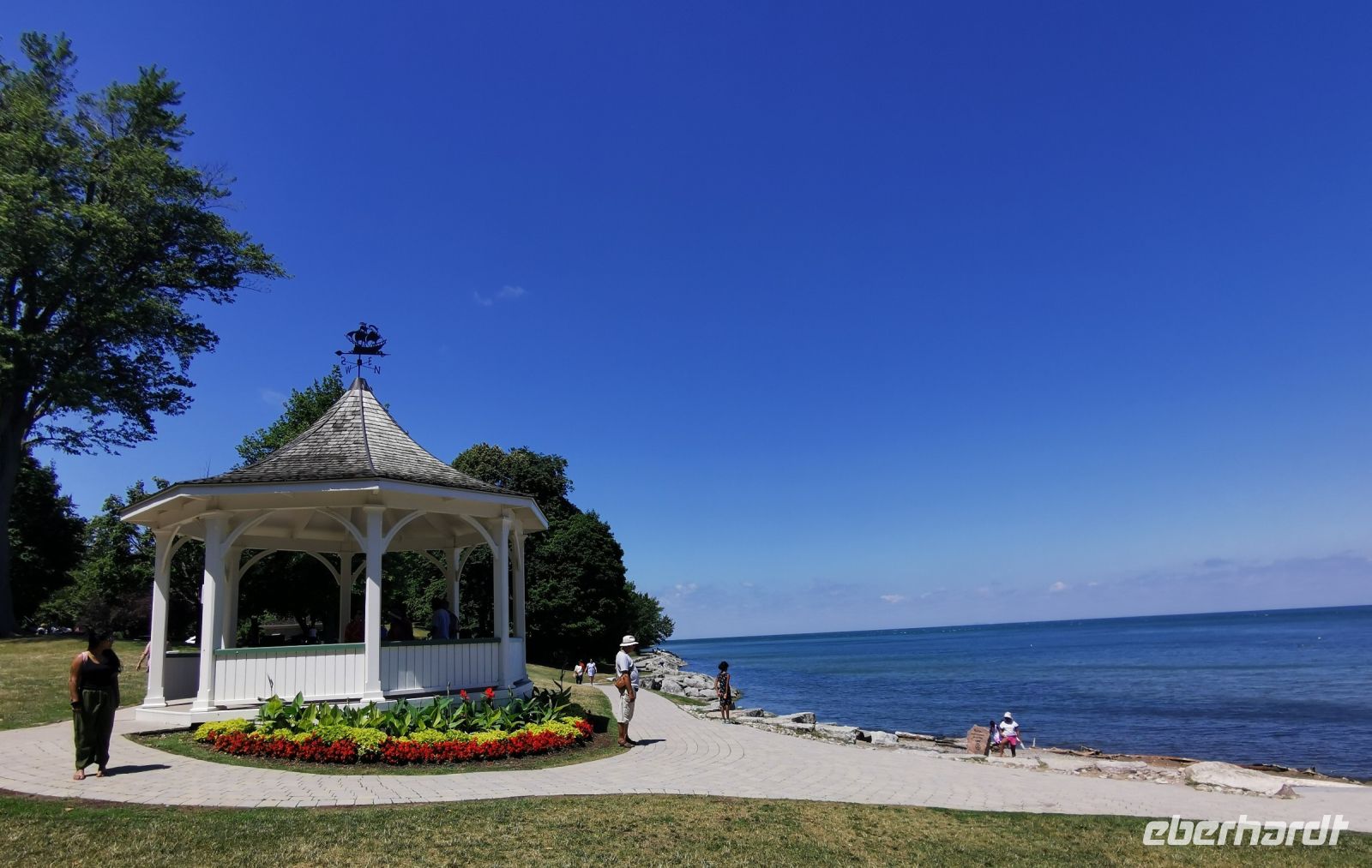 Danach haben sich Marina und Simone für die Gäste eine kleine Überraschung ausgedacht, eigentlich würden wir direkt zu den Niagarafällen fahren, da sich das Mittagslicht aber nicht fürs Fotografieren eignet, legen wir eine Pause im malerischen Niagara-on-the-Lake ein. Dieses kanadische Kleinstädtchen liegt an der Mündung des Niagara Flusses. Hier befinden sich einige der besten Weingüter Kanadas und man kann an herrlich bepflanzten Flaniermeilen entlang spazieren und die wunderschönen Holzvillen mit ihren gepflegten Vorgärten bewundern. Nach den ganzen Großstädten, die wir in den letzten Tagen gesehen haben, ist es eine regelrechte Erholung, mal durch so eine pittoreske Kleinstadt zu laufen und wir genießen das sehr.