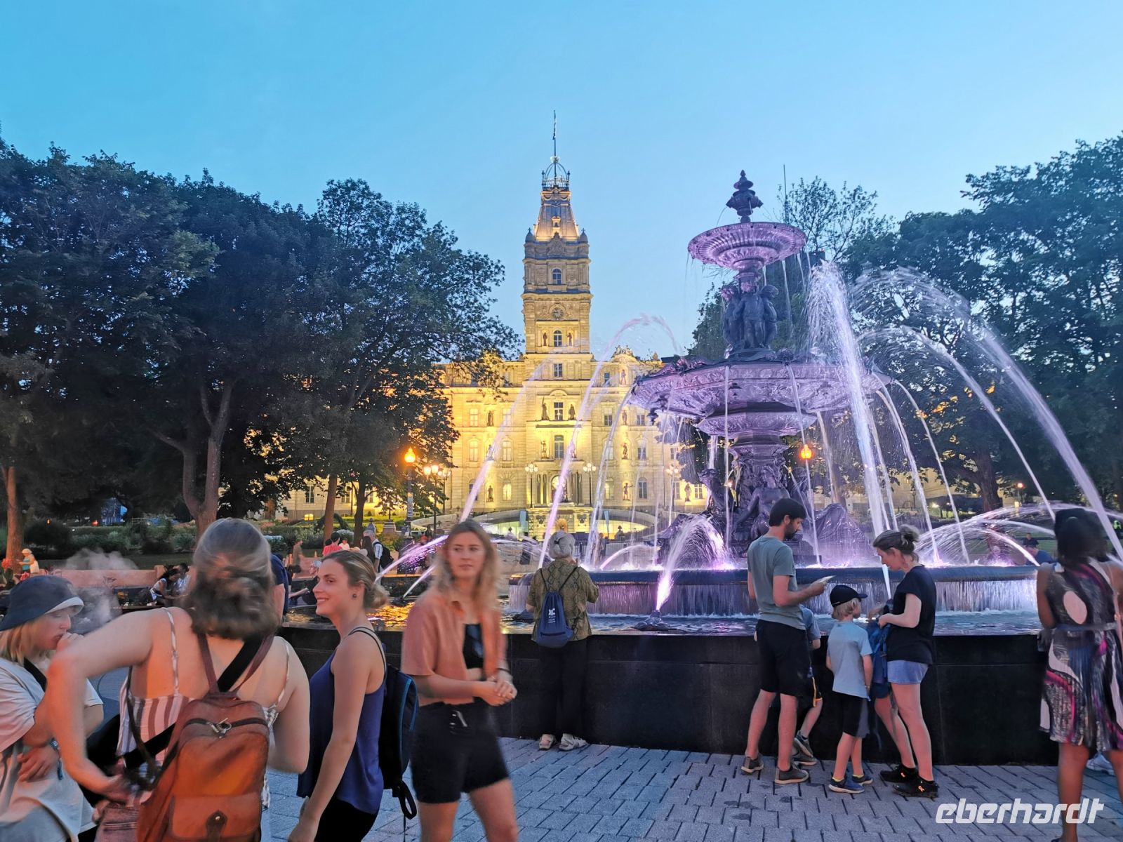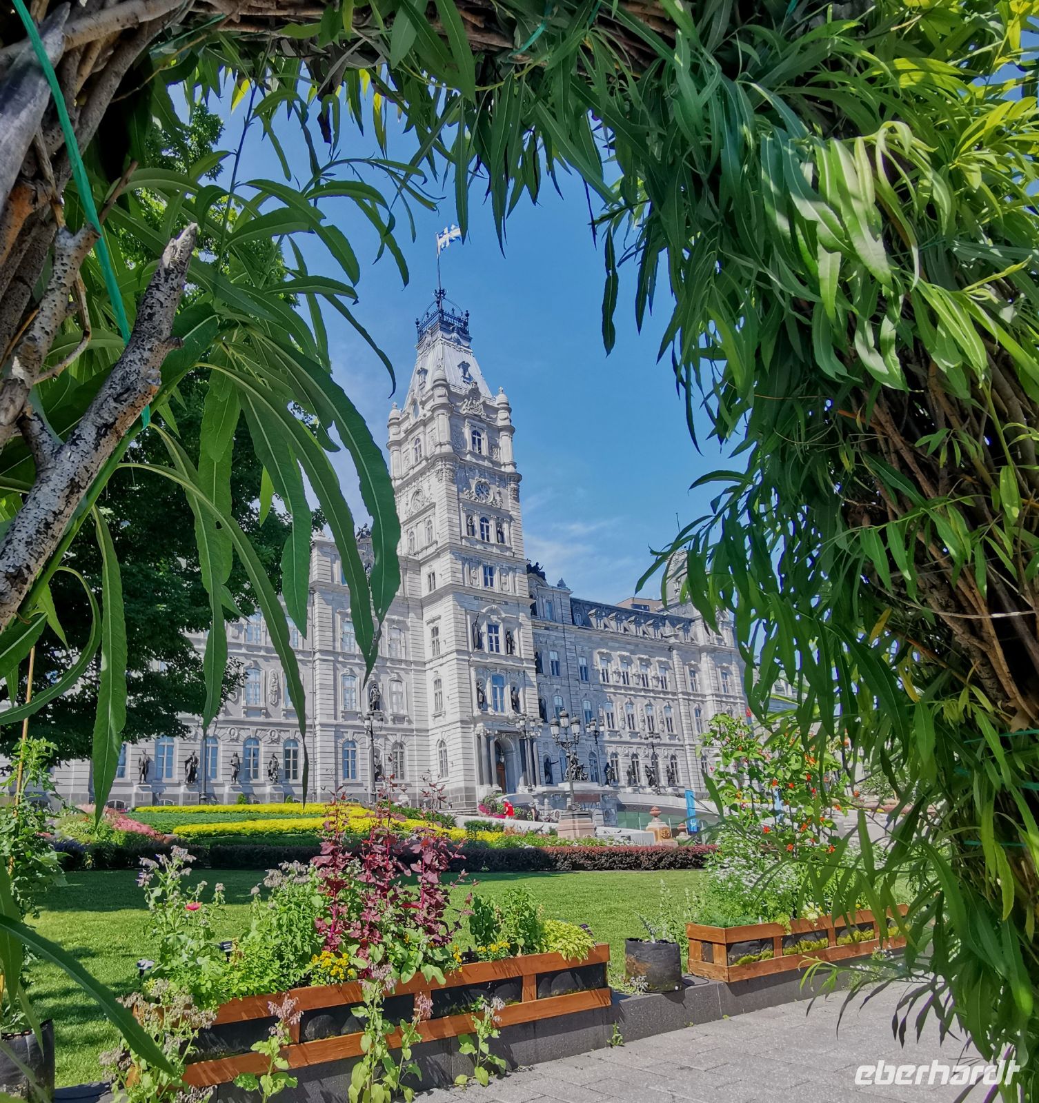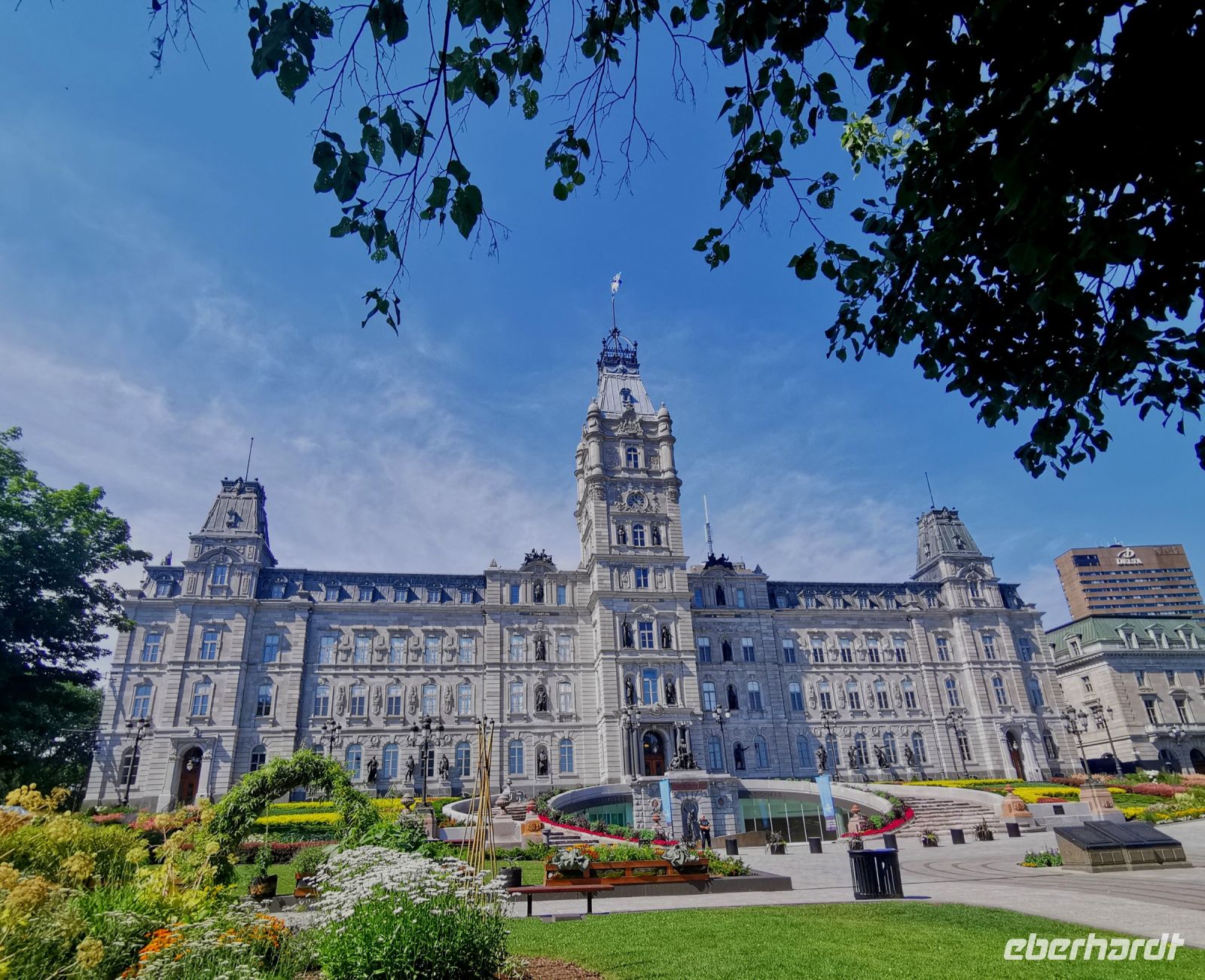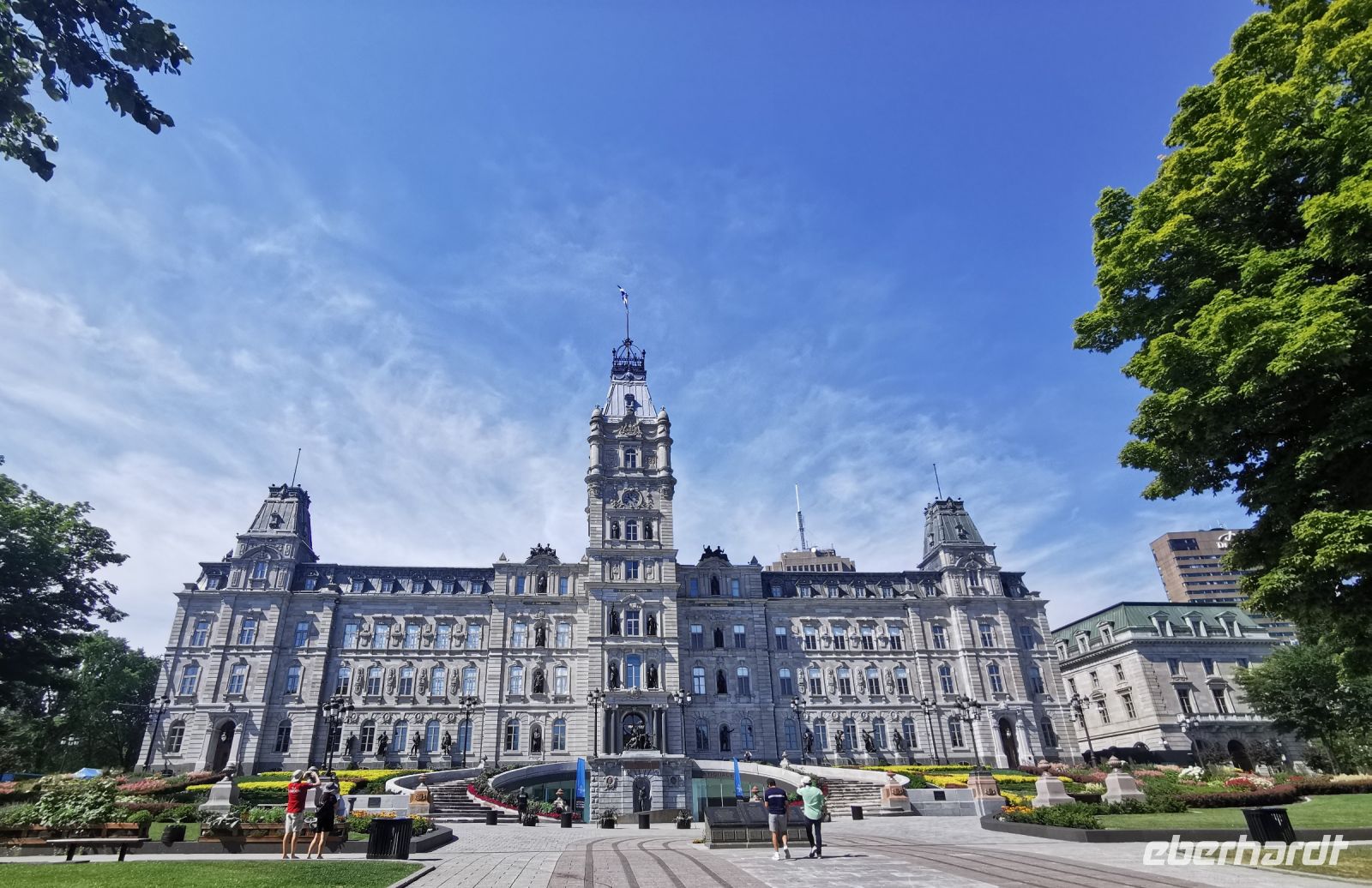 Am Parlament von Quebec legen wir einen Fotostop ein. Dieses imposante Gebäude wurde nach den Plänen von Eugene-Etienne Taché errichtet und vereint sowohl französische als auch englische Architekturstile. Vor der Eingangstür steht eine große Skulptur einer Indianerfamilie, die daran erinnern soll, daß die Ureinwohner Kanadas die ersten Siedler waren und nicht etwa Franzosen oder Engländer. Gleich neben dem Gebäude liegt ein kleiner Gemüsegarten, der das im Parlament befindliche Restaurant mit frischem Salat und verschiedenen Gemüse versorgt.