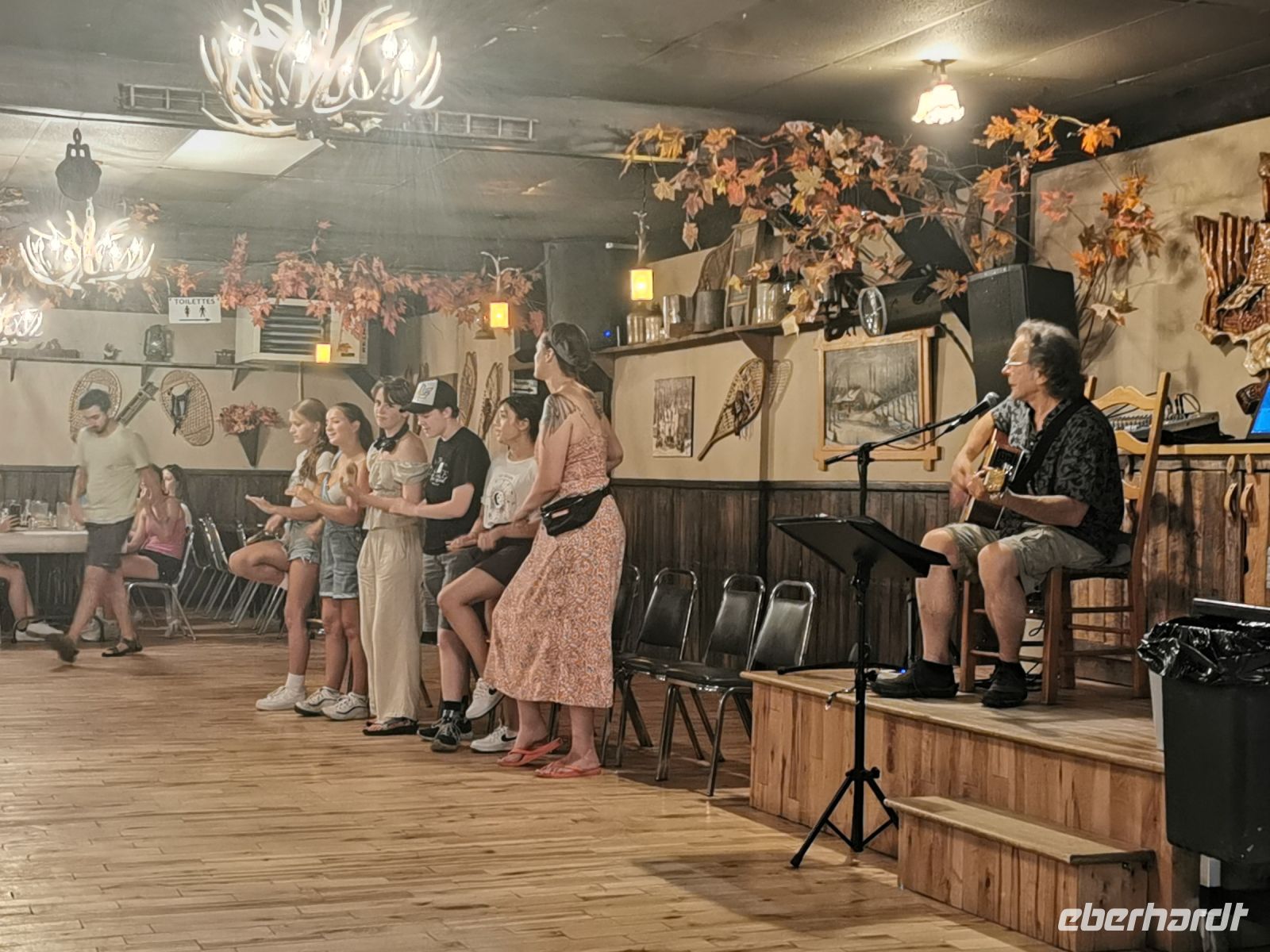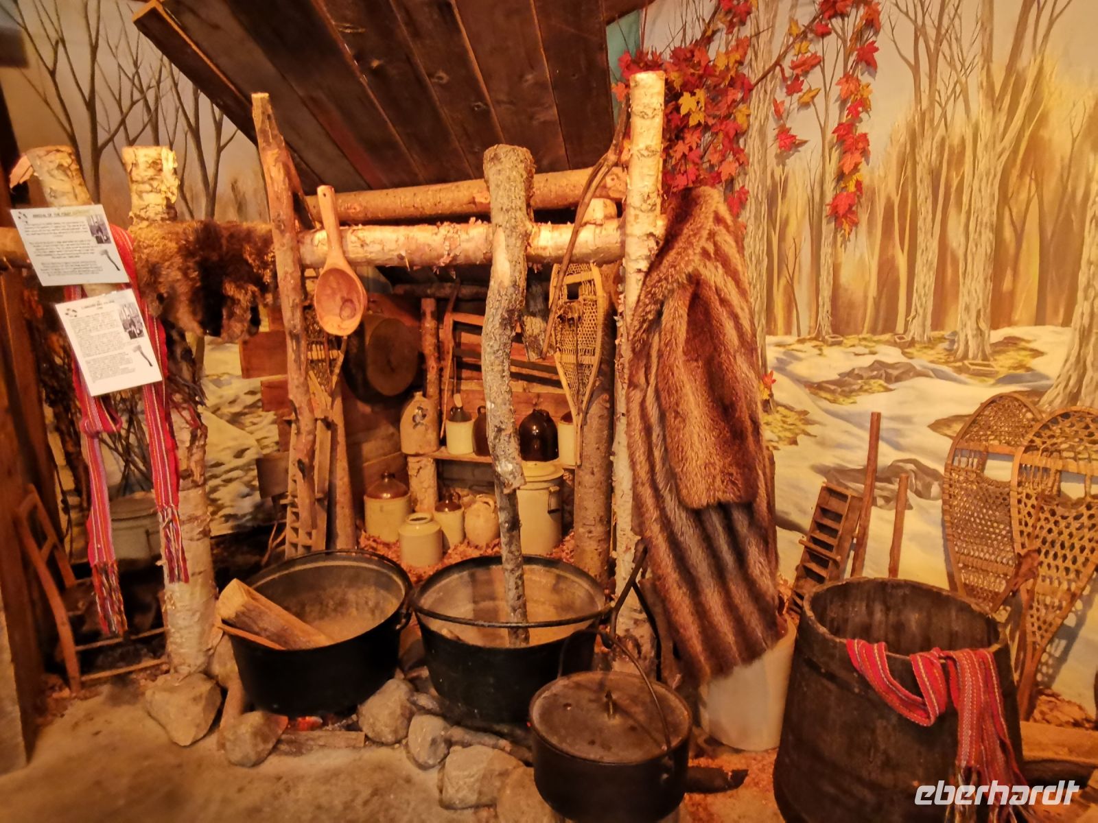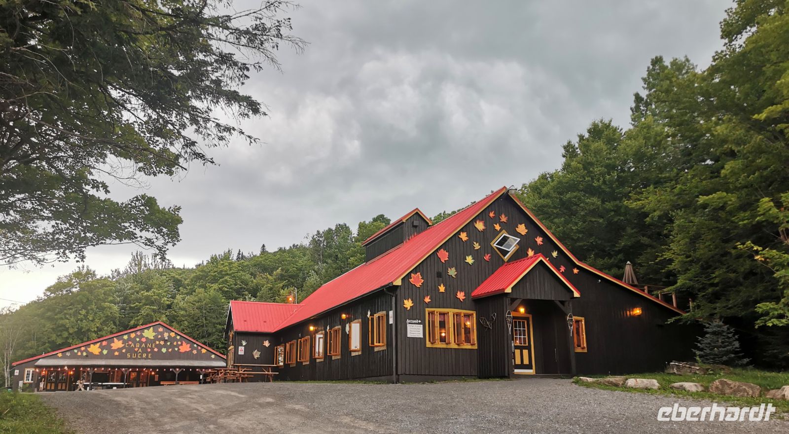 Wenig später erwartet uns unser Sugar Shack Abendessen. Dieses traditionell indianische Essen haben die Kanadier übernommen und zelebrieren es vor allem im Frühjahr, wenn der Ahornsirup frisch geerntet wird. Dazu bohrt man ein Loch in die Bäume und zapft den wertvollen Sirup ab, dieser wird erhitzt und zu einer leckeren Vitamin-C-haltigen klebrigen Soße eingekocht. Wir schütten diese leicht goldbraune Soße über Schinken, Kartoffeln, Bohnen und Ei ganz wie die Einheimischen und stellen fest, daß es hervorragend schmeckt. Zum Dessert passt er auch zu Eierkuchen und sättigt ungemein.