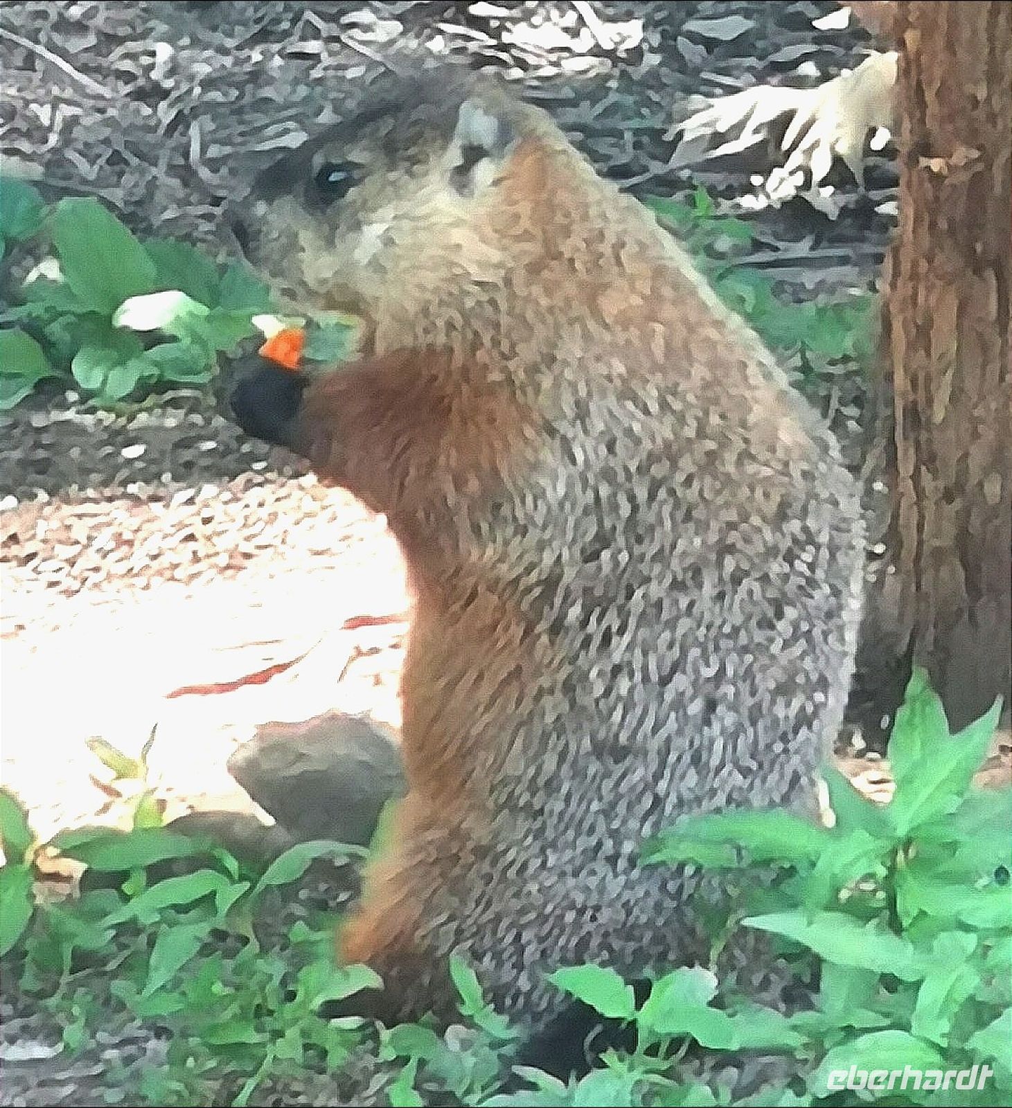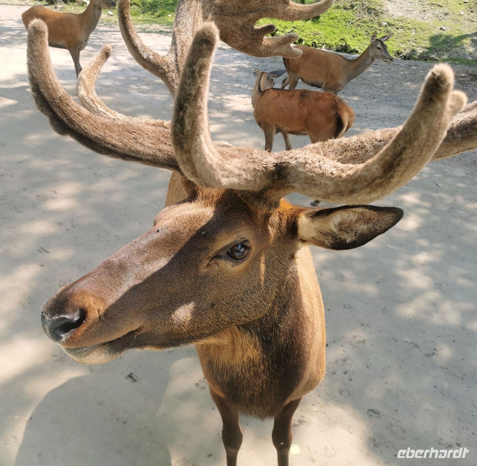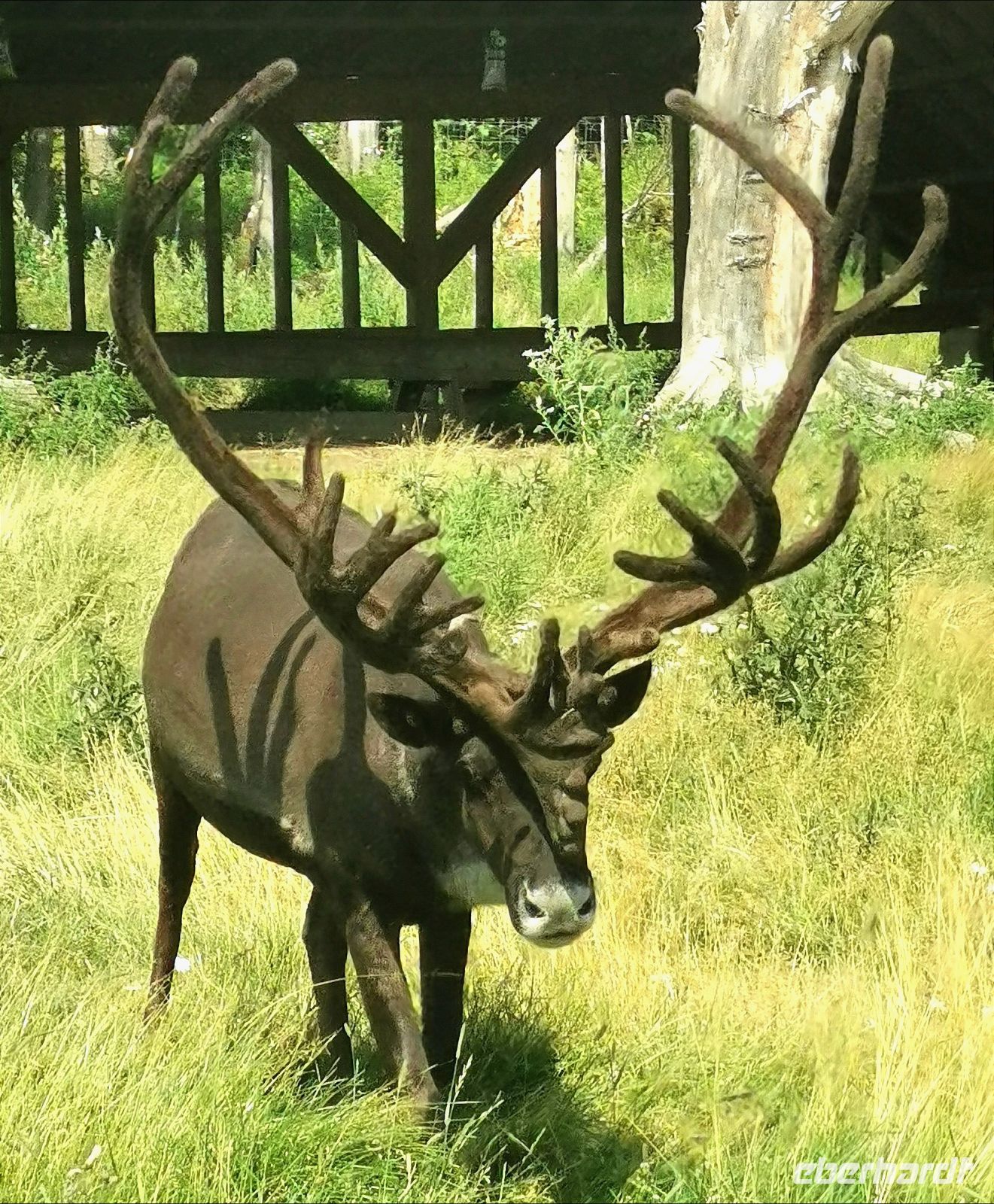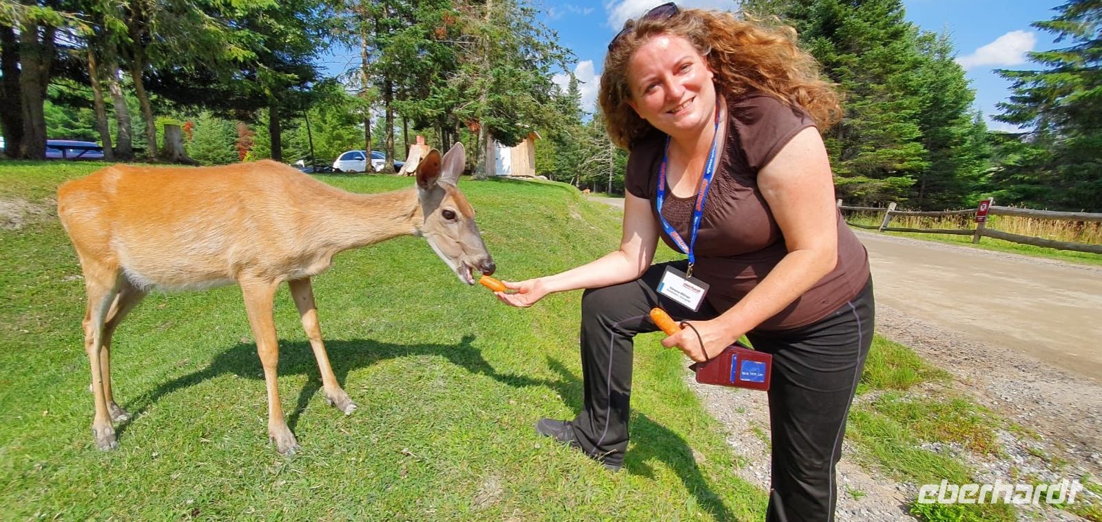 Es dauert nicht lang, da stehen die ersten Rothirsche und Rehe vor dem Bus und wollen diese Leckereien natürlich nicht verpassen. Die Wildschweine betteln von unten und ihre kleinen gestreiften Frischlinge verstecken sich hinter den Farnen und beobachten von dort das Geschehen. Etwas weiter sitzen auf einer Holzplattform die schwarzen kanadischen Eichhörnchen und ein Murmeltier labt sich darunter an einem dicken Stück Möhre. Unser Busfahrer kennt den Park und seine Tiere gut und er lockt für uns sogar die Karibus, Füchse und Wölfe aus den Verstecken hervor. Die Braun- und Schwarzbären kommen ebenfalls sehr nah, da sie glauben, es gäbe leckere Würstchen. Es ist ein wunderbares Spektakel für uns, die Tiere so nah erleben zu dürfen und wir hätten gern eine zweite Runde im Park gedreht.