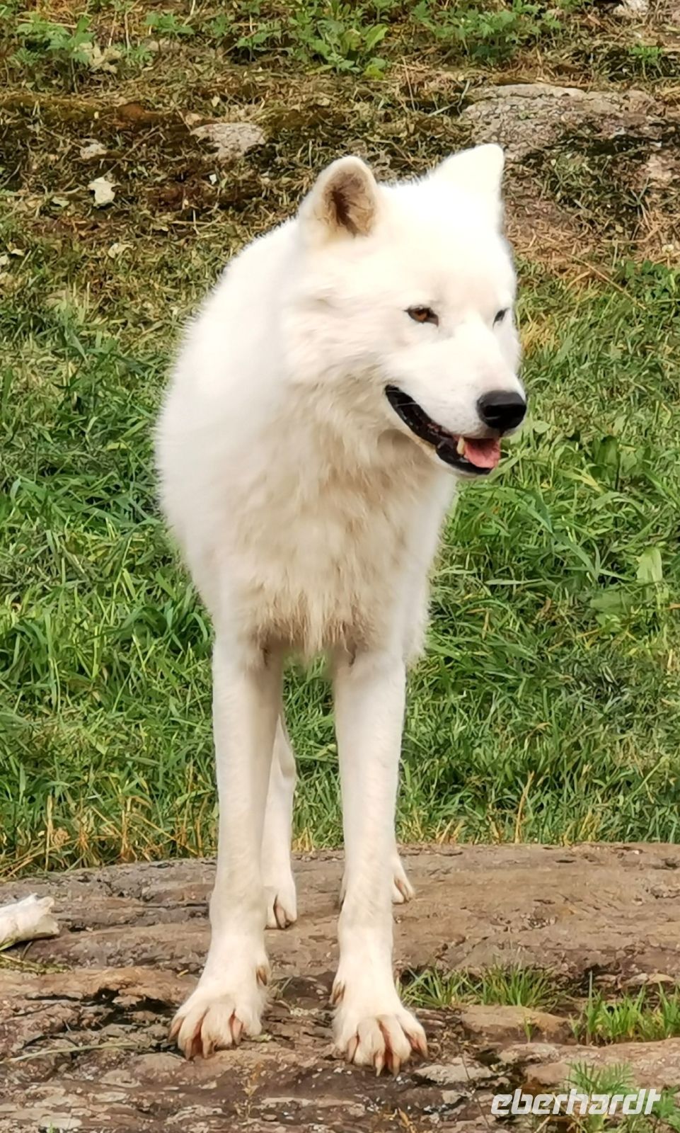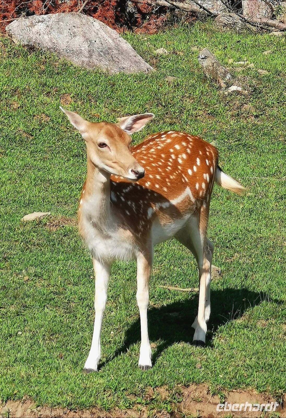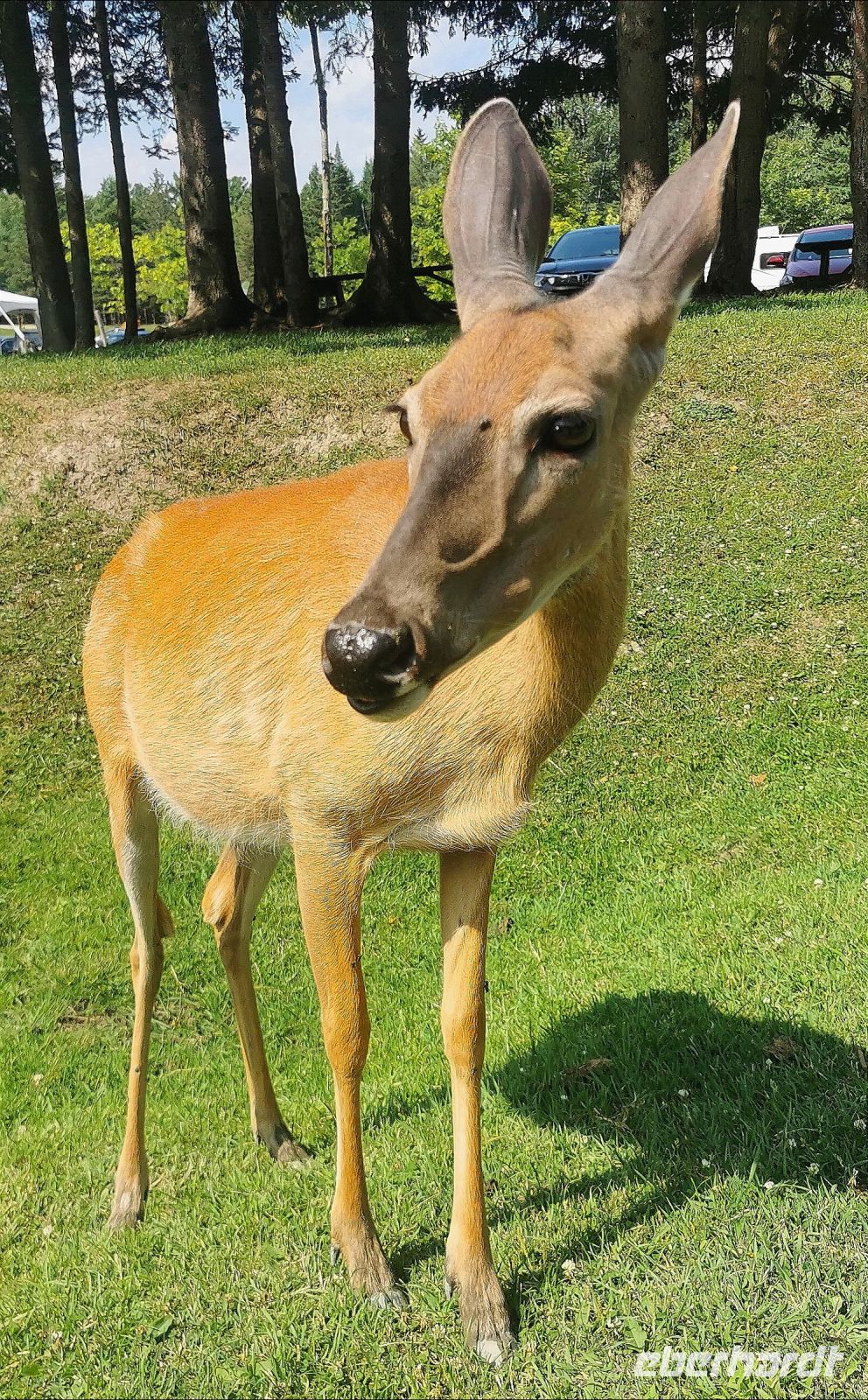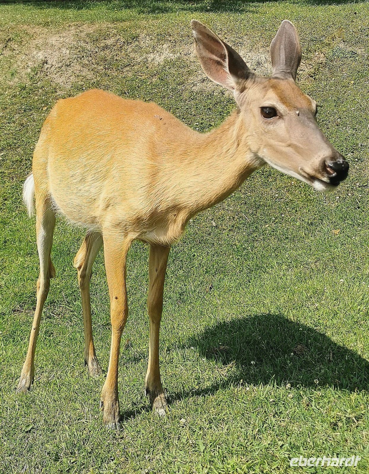Es dauert nicht lang, da stehen die ersten Rothirsche und Rehe vor dem Bus und wollen diese Leckereien natürlich nicht verpassen. Die Wildschweine betteln von unten und ihre kleinen gestreiften Frischlinge verstecken sich hinter den Farnen und beobachten von dort das Geschehen. Etwas weiter sitzen auf einer Holzplattform die schwarzen kanadischen Eichhörnchen und ein Murmeltier labt sich darunter an einem dicken Stück Möhre. Unser Busfahrer kennt den Park und seine Tiere gut und er lockt für uns sogar die Karibus, Füchse und Wölfe aus den Verstecken hervor. Die Braun- und Schwarzbären kommen ebenfalls sehr nah, da sie glauben, es gäbe leckere Würstchen. Es ist ein wunderbares Spektakel für uns, die Tiere so nah erleben zu dürfen und wir hätten gern eine zweite Runde im Park gedreht.