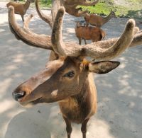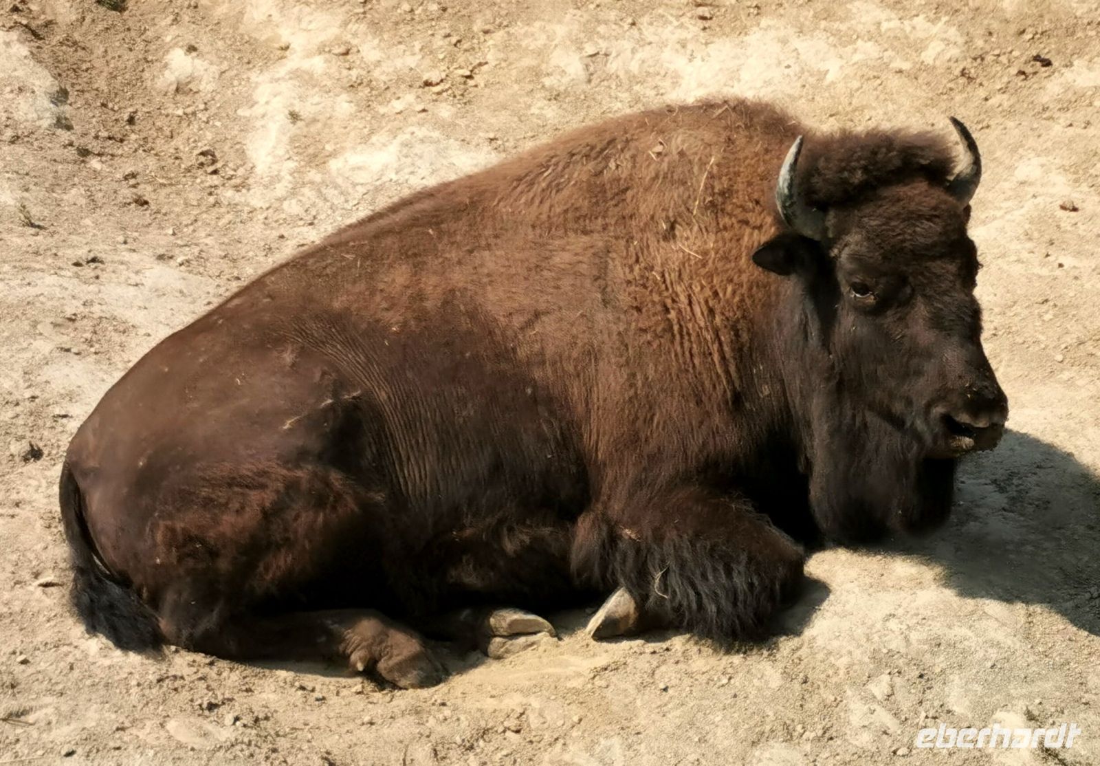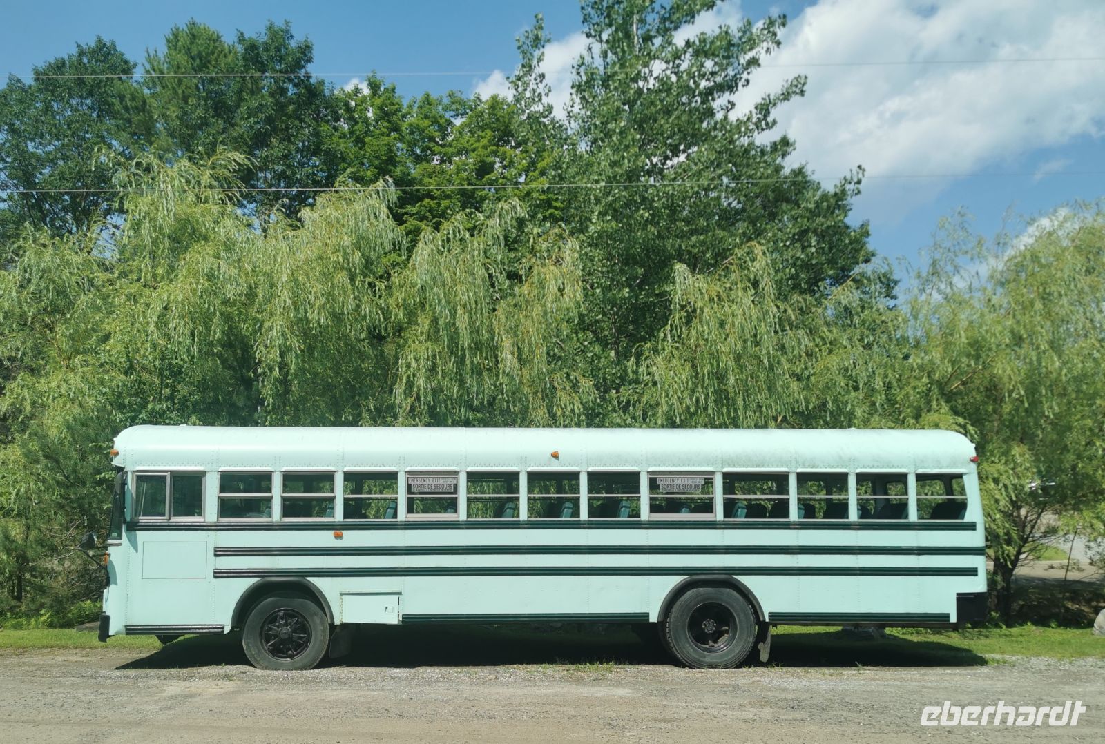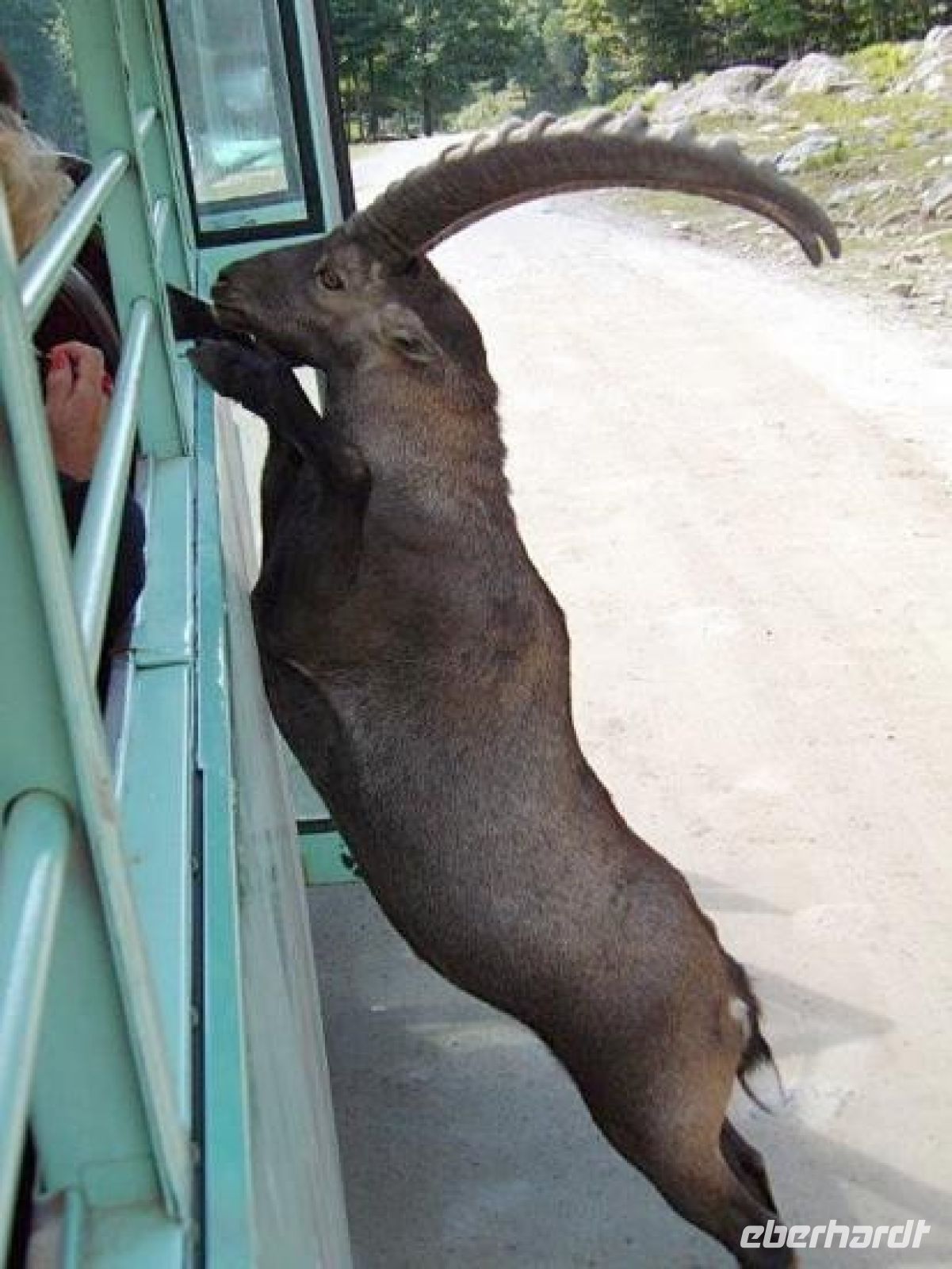 So gestärkt sind wir bereit für unsere kanadische Safari im Omega Park ganz in der Nähe der Hauptstadt. Dieser Park wurde 1985 gegründet. Man wollte es einem breiten Publikum ermöglichen, die nordamerikanische Tierwelt auf dem 2.200 Hektar großen Gelände in der natürlichen Landschaft zu präsentieren. Wir steigen in einen mintgrünen Schulbus um, der seitlich offen ist und bekommen 3 Packungen knackige Möhrchen in die Hände.