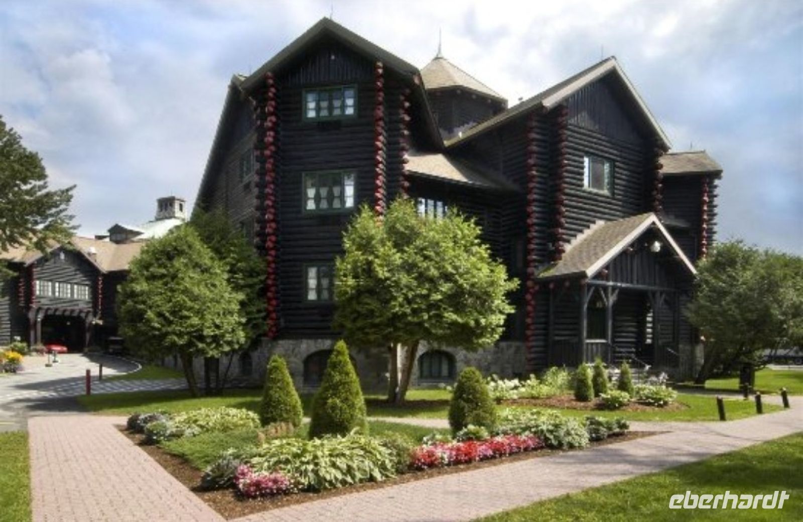 Zur Mittagszeit kommen wir am Chateau Montebello an. Es gehört, wie schon Chateau Frontenac, welches uns ins Quebec so verzaubert hatte, zur Fairmont Hotelgruppe. Dieses Hotel liegt am Nordufer des Ottawa River auf halber Strecke zwischen Montreal und Ottawa. Errichtet aus 10.000 Zedernstämmen, sieht es skandinavisch aus, ist im Gegensatz zu den norwegischen roten Holzbauten allerdings tiefschwarz und wirkt im sommerlichen Kanada ein wenig wie aus einer anderen Welt. Innen ist es sehr dunkel, kühl und riesig, der Kamin im Foyer reicht bis zur Decke und die Einrichtung erinnert an englische Herrenhäuser. Wir genießen unser Mittagessen im Restaurant und lassen uns leckeren Kabeljau mit schwarzen Oliven und Cremetorte mit Kokossauce schmecken.
