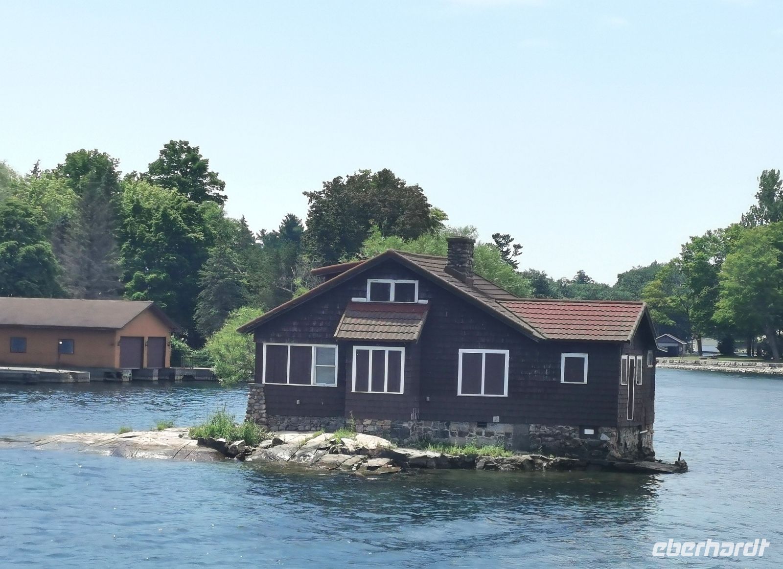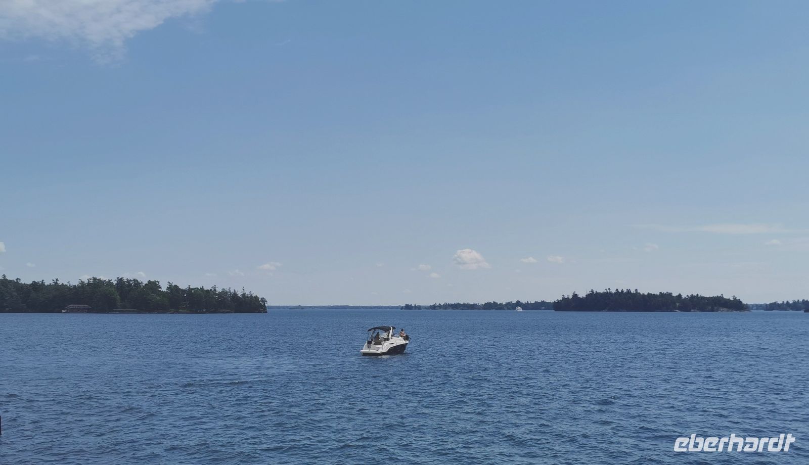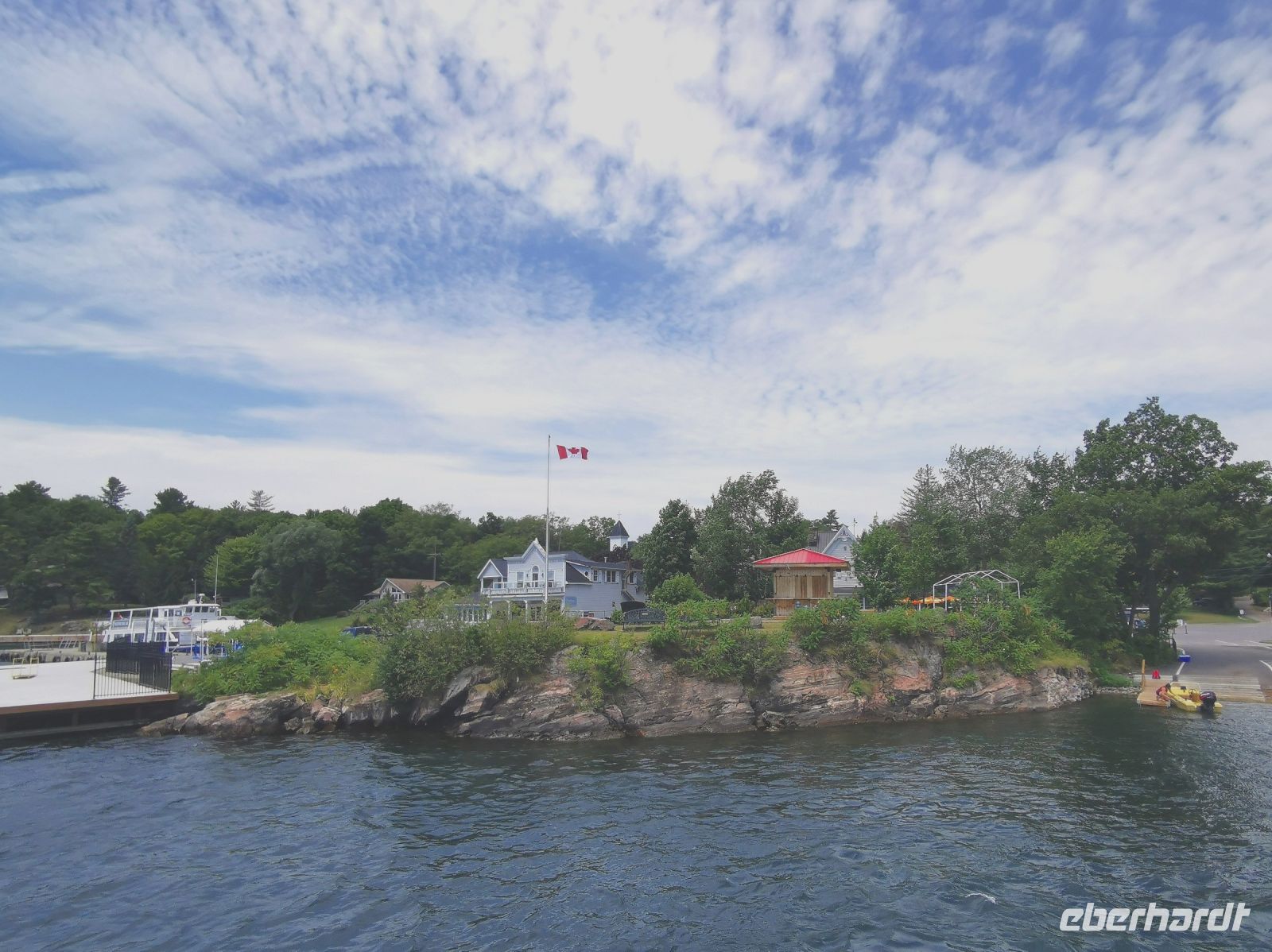 Wir fahren weiter, da wir noch Toronto erreichen wollen. Zur Mittagszeit kommen wir in das Gebiet der 1.000 Inseln. Sie liegen am Abfluß des Ontariosees in den Sankt Lorenz Strom genau, auf der Grenze zwischen den USA und Kanada. Unser Ausflugsboot nimmt uns mit in eine faszinierende Inselwelt, die aus insgesamt 1.864 Inseln besteht, manche dieser Minieilande haben nur Nummern, Wolfe Island ist die größte von ihnen. So schippern wir munter zwischen den USA und Kanada hin und her, sehen den Yachthafen des Boldt Castle, das Castle selbst auf einer anderen Insel, worin sich heute ein Hotel befindet. Zwischen zwei Eilanden gibt es eine kleine weiße Holzbrücke. Tatsächlich ist sie die kleinste Brücke der Welt zwischen zwei Staaten! Eine der Inseln gehört zu Kanada, die andere zu den USA.
