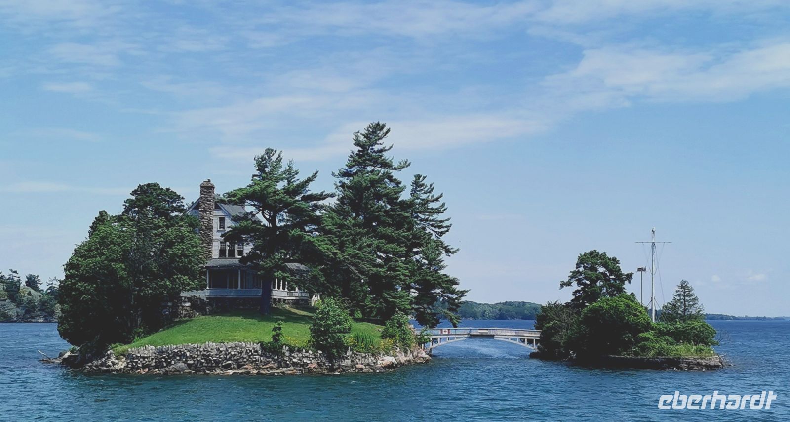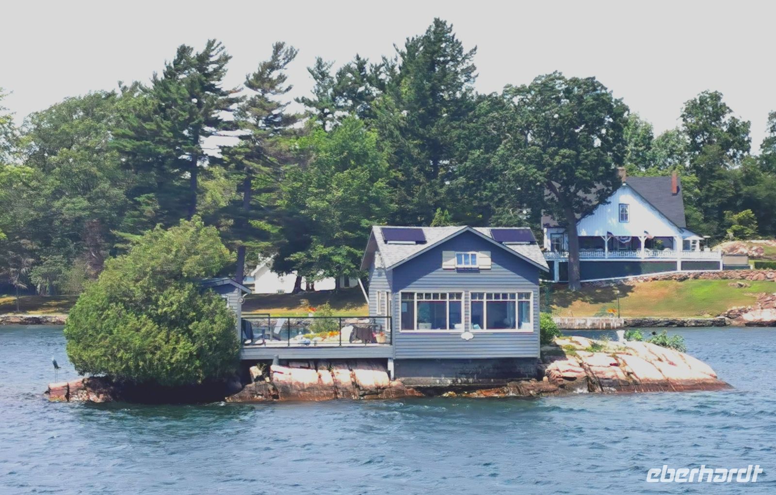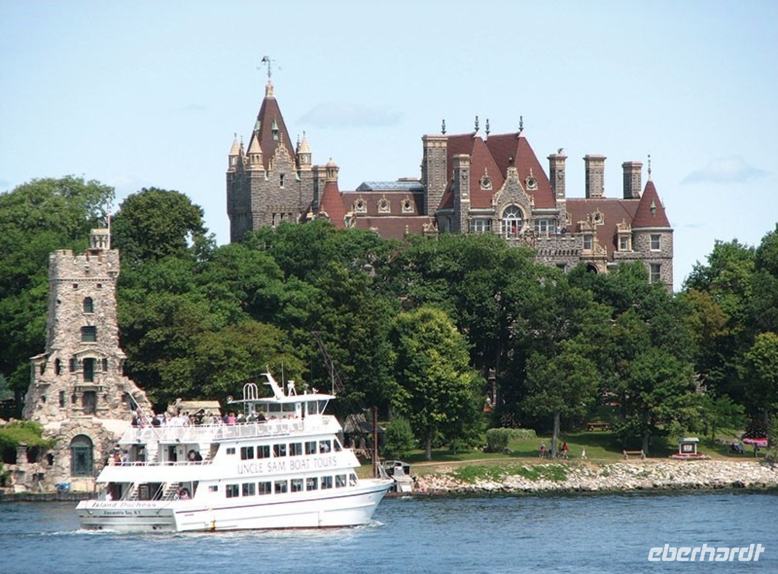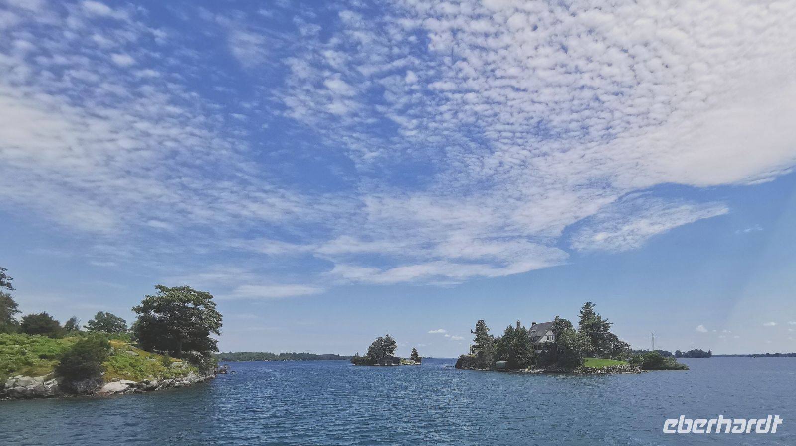 Wir fahren weiter, da wir noch Toronto erreichen wollen. Zur Mittagszeit kommen wir in das Gebiet der 1.000 Inseln. Sie liegen am Abfluß des Ontariosees in den Sankt Lorenz Strom genau, auf der Grenze zwischen den USA und Kanada. Unser Ausflugsboot nimmt uns mit in eine faszinierende Inselwelt, die aus insgesamt 1.864 Inseln besteht, manche dieser Minieilande haben nur Nummern, Wolfe Island ist die größte von ihnen. So schippern wir munter zwischen den USA und Kanada hin und her, sehen den Yachthafen des Boldt Castle, das Castle selbst auf einer anderen Insel, worin sich heute ein Hotel befindet. Zwischen zwei Eilanden gibt es eine kleine weiße Holzbrücke. Tatsächlich ist sie die kleinste Brücke der Welt zwischen zwei Staaten! Eine der Inseln gehört zu Kanada, die andere zu den USA.