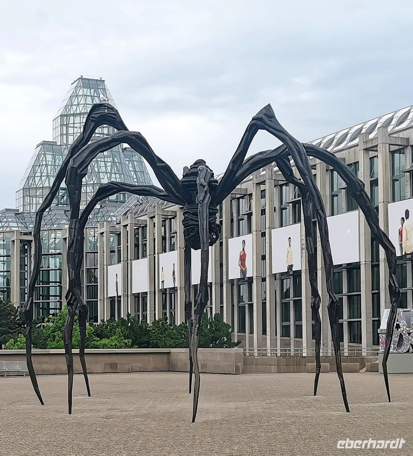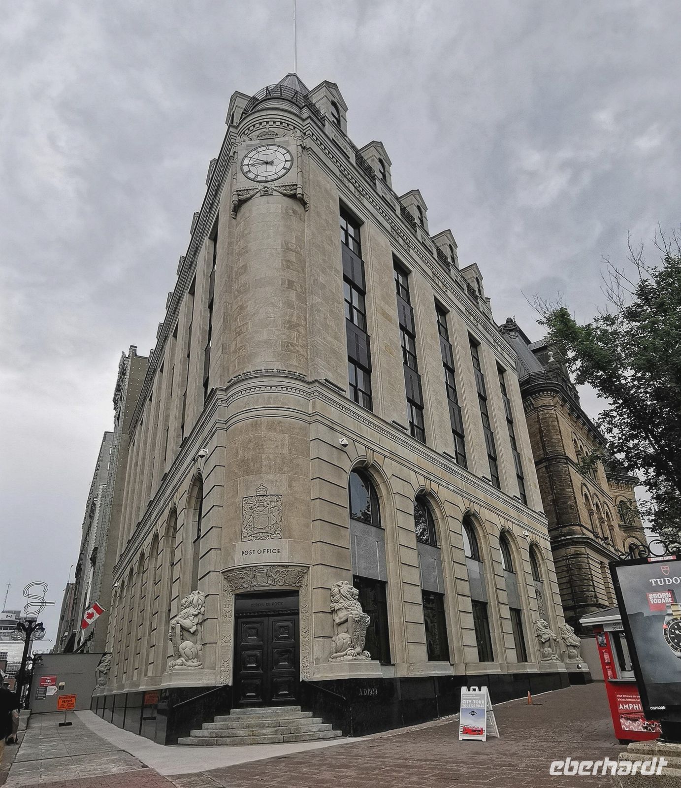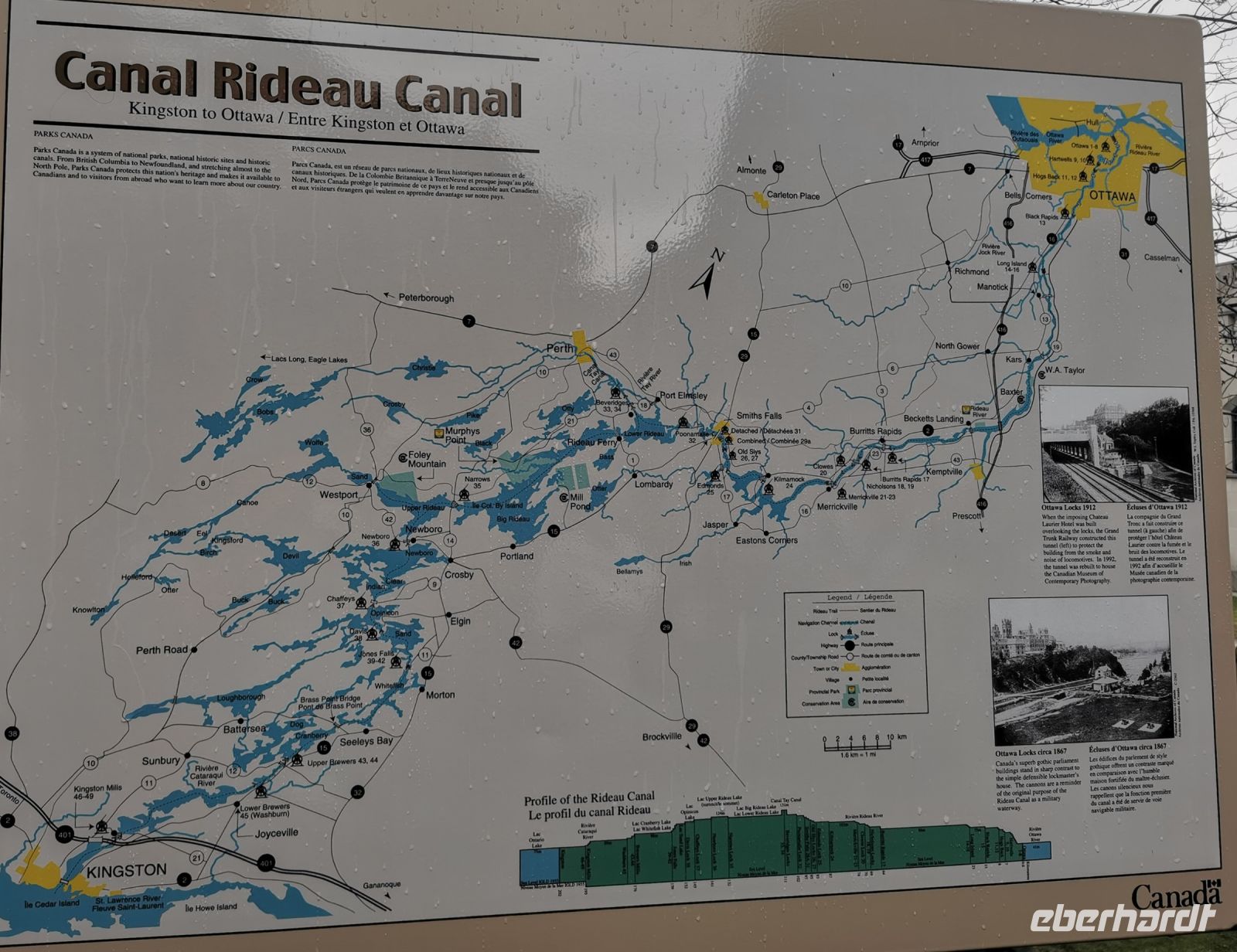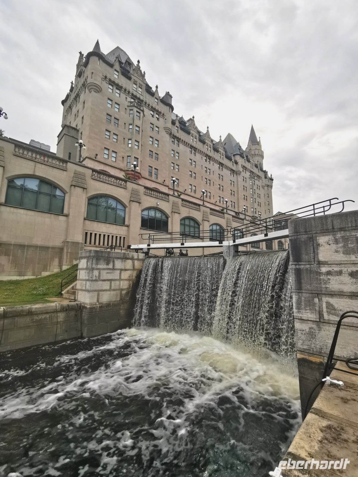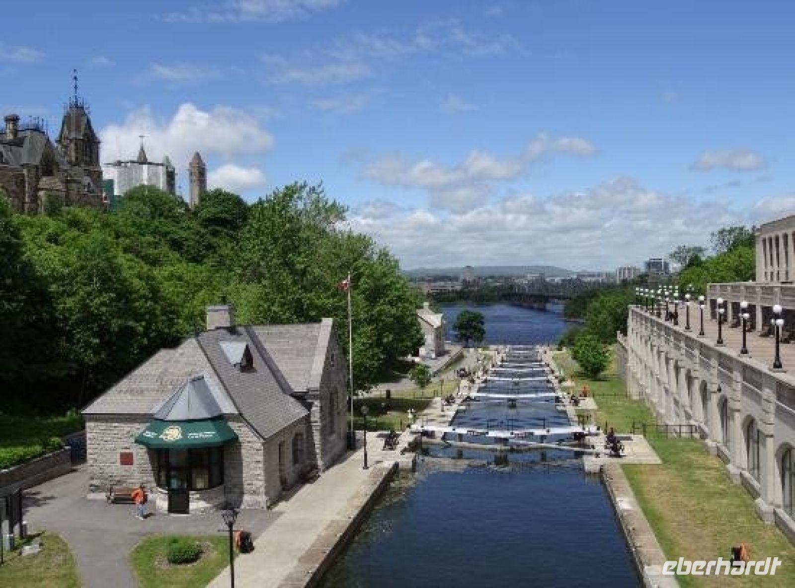 Wir spazieren weiter entlang an Skulpturen und der Post und erreichen den Canal Rideau. Er verbindet die Hauptstadt mit der Stadt Kingston am Ontariosee. Als wir oben stehen, können wir beobachten, wie ein Boot von ganz unten über die einzelnen Schleusen nach oben geholt wird - mit der Hand! Dieser Kanal ist 202 km lang und wurde bereits 1832 eröffnet. Seit 2007 zählt er zum UNESCO Weltkulturerbe und wir bestaunen die Technik mit den Ketten und Holzbalken, mit deren Hilfe die einzelnen Schleusentore geöffnet und geschlossen werden. Ursprünglich baute man diesen Kanal aus militärischen Gründen. Er sollte die Versorgung und die Kommunikation zwischen Montreal und Kingston ermöglichen. Mehr und mehr nutzte man ihn aber für die Binnenschifffahrt, um den Sankt Lorenz Strom zu umgehen, wo britische Versorgungsschiffe mit Angriffen oder Blockaden rechnen mußten. Heutzutage kann man sogar Rundfahrten auf dem Kanal unternehmen, muß aber dafür viel Zeit mitbringen.