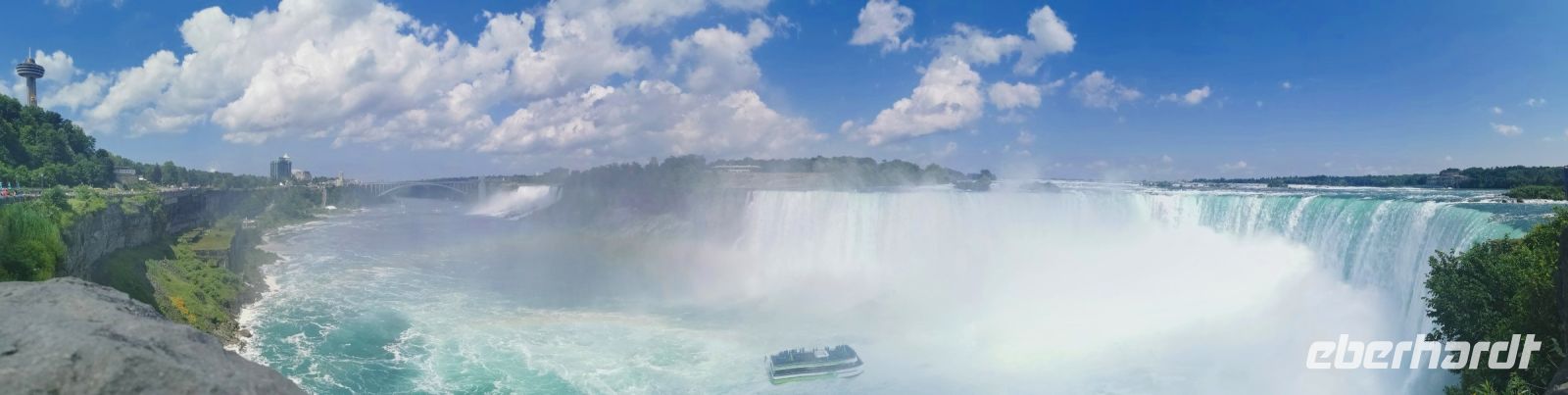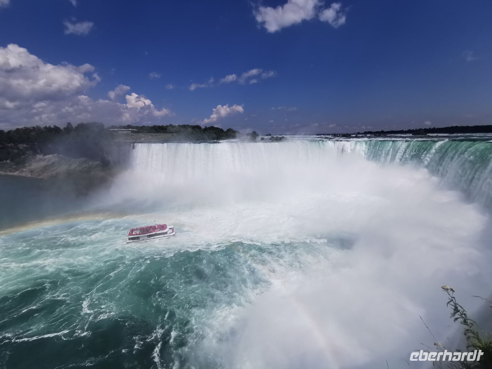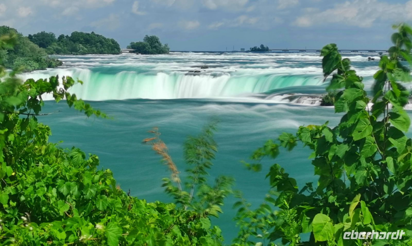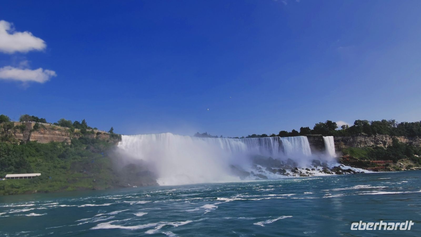 Nun brechen wir zu den spektakulären Niagarafällen auf, die genau an der Grenze zwischen dem US-amerikanischen Bundesstaat New York und der kanadischen Provinz Ontario liegen. Hier, wo die Fälle den Eriesee mit dem Ontariosee verbinden, stürzt das Wasser 57 Meter in die Tiefe.