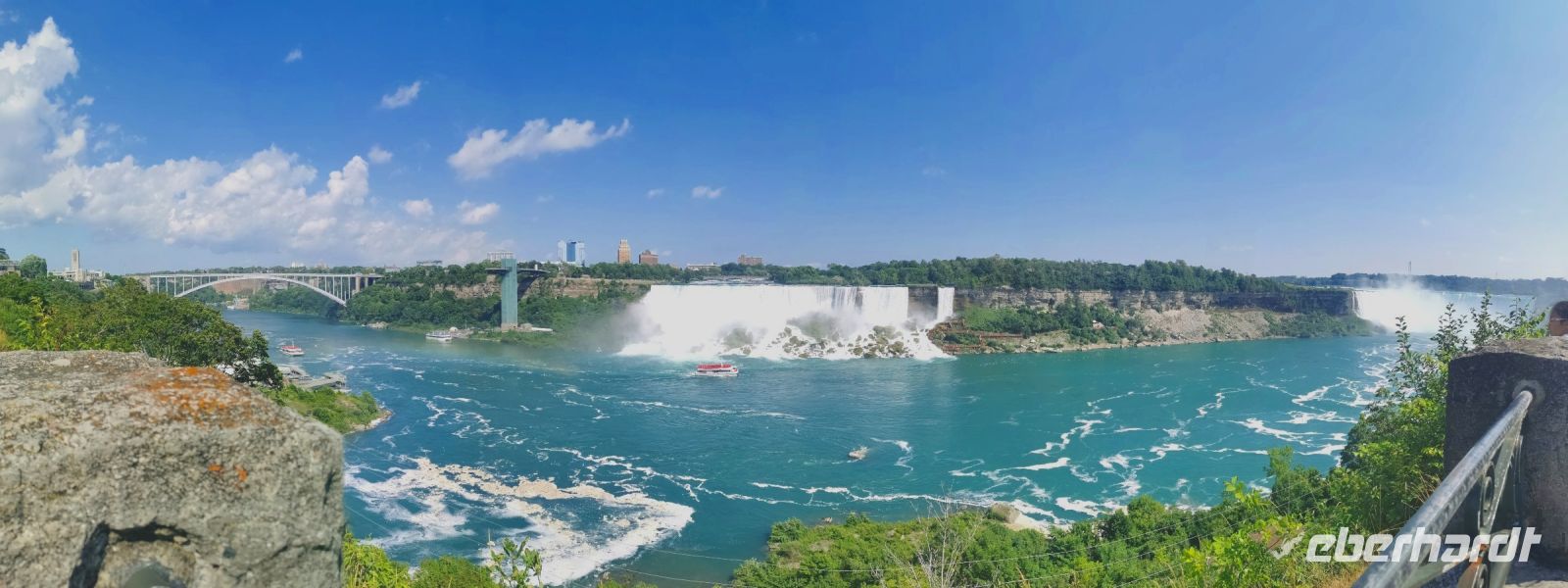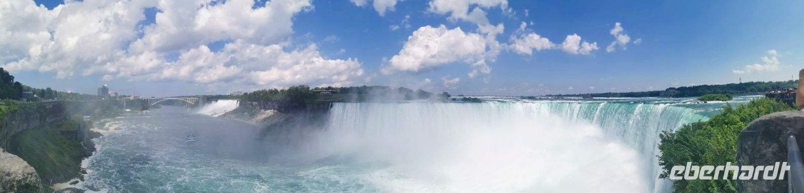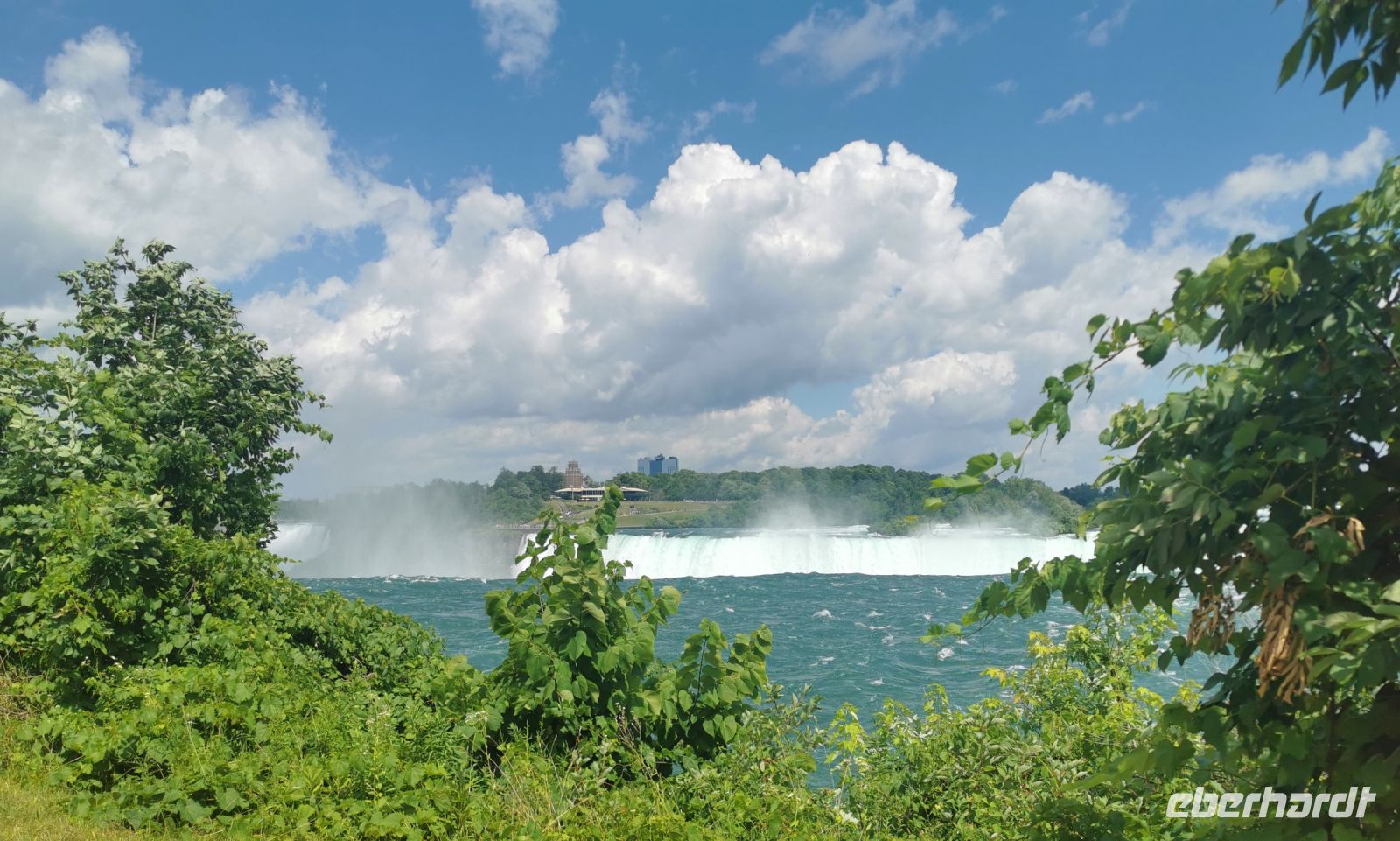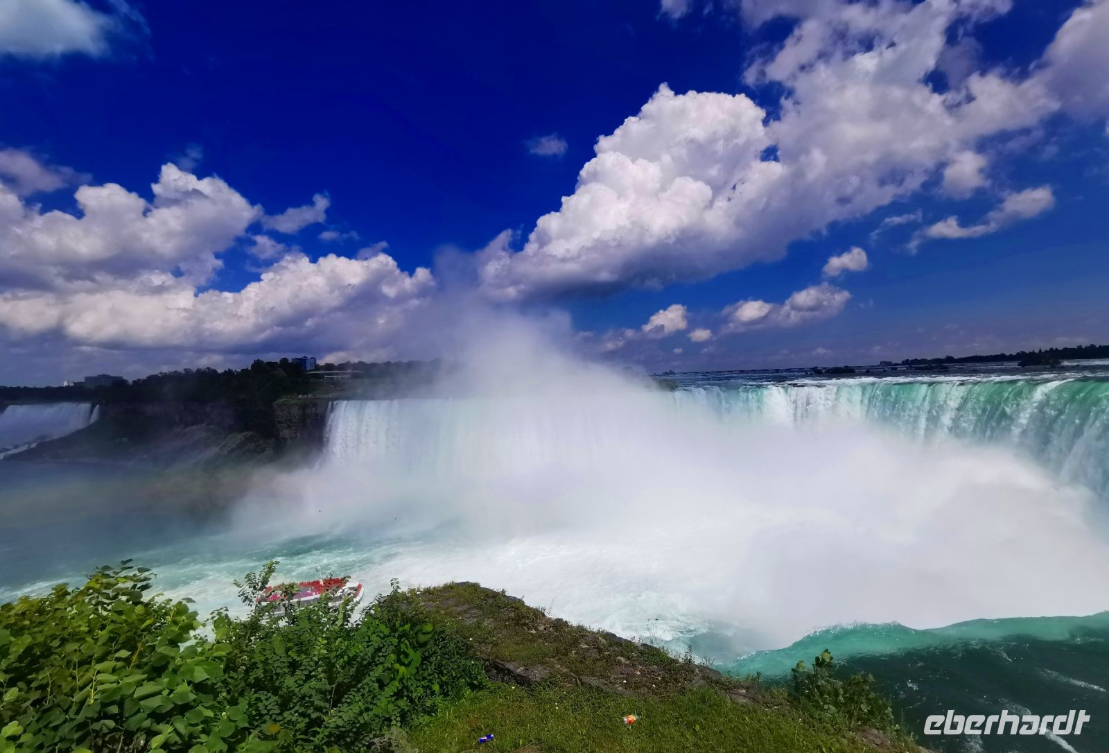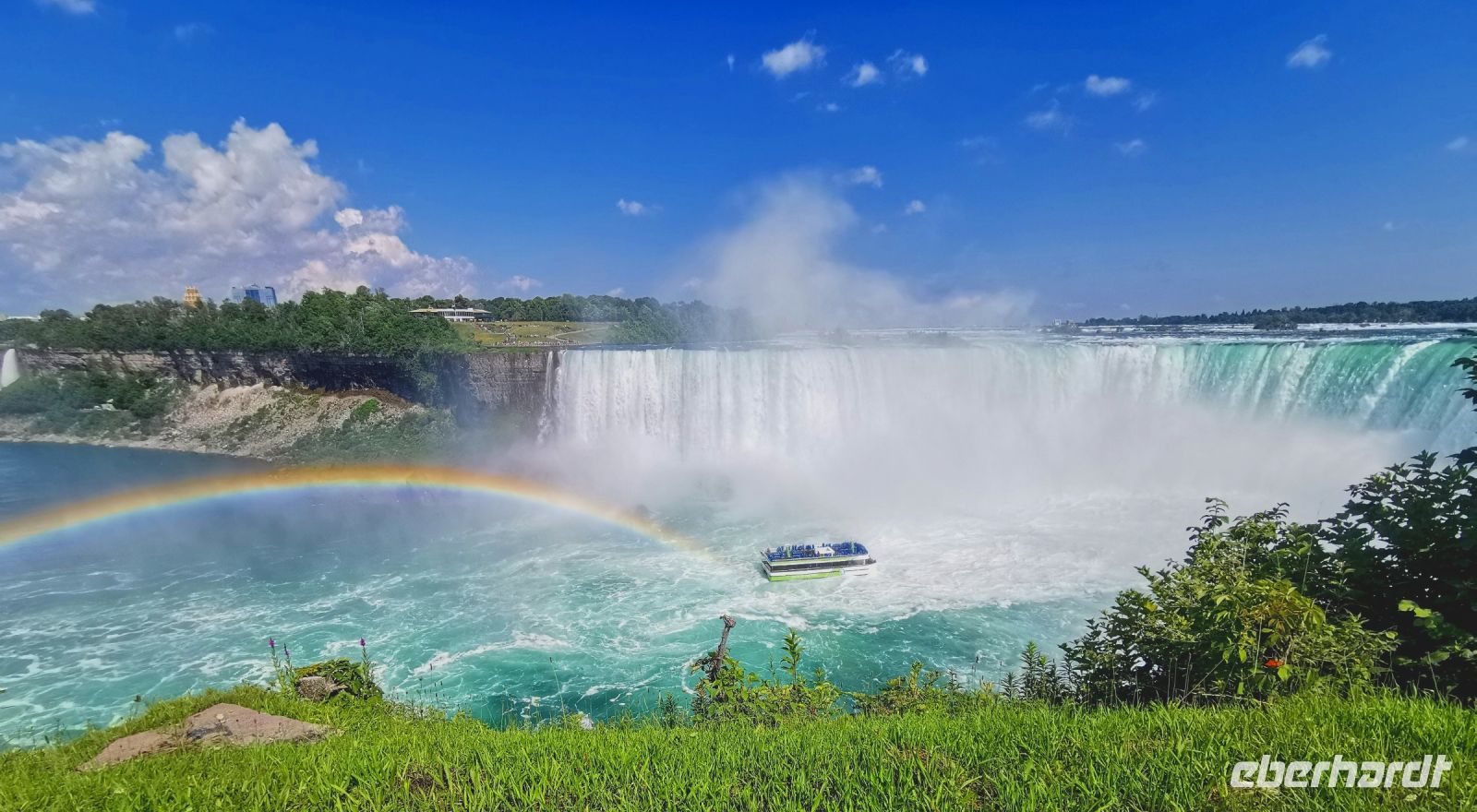 Nun brechen wir zu den spektakulären Niagarafällen auf, die genau an der Grenze zwischen dem US-amerikanischen Bundesstaat New York und der kanadischen Provinz Ontario liegen. Hier, wo die Fälle den Eriesee mit dem Ontariosee verbinden, stürzt das Wasser 57 Meter in die Tiefe.