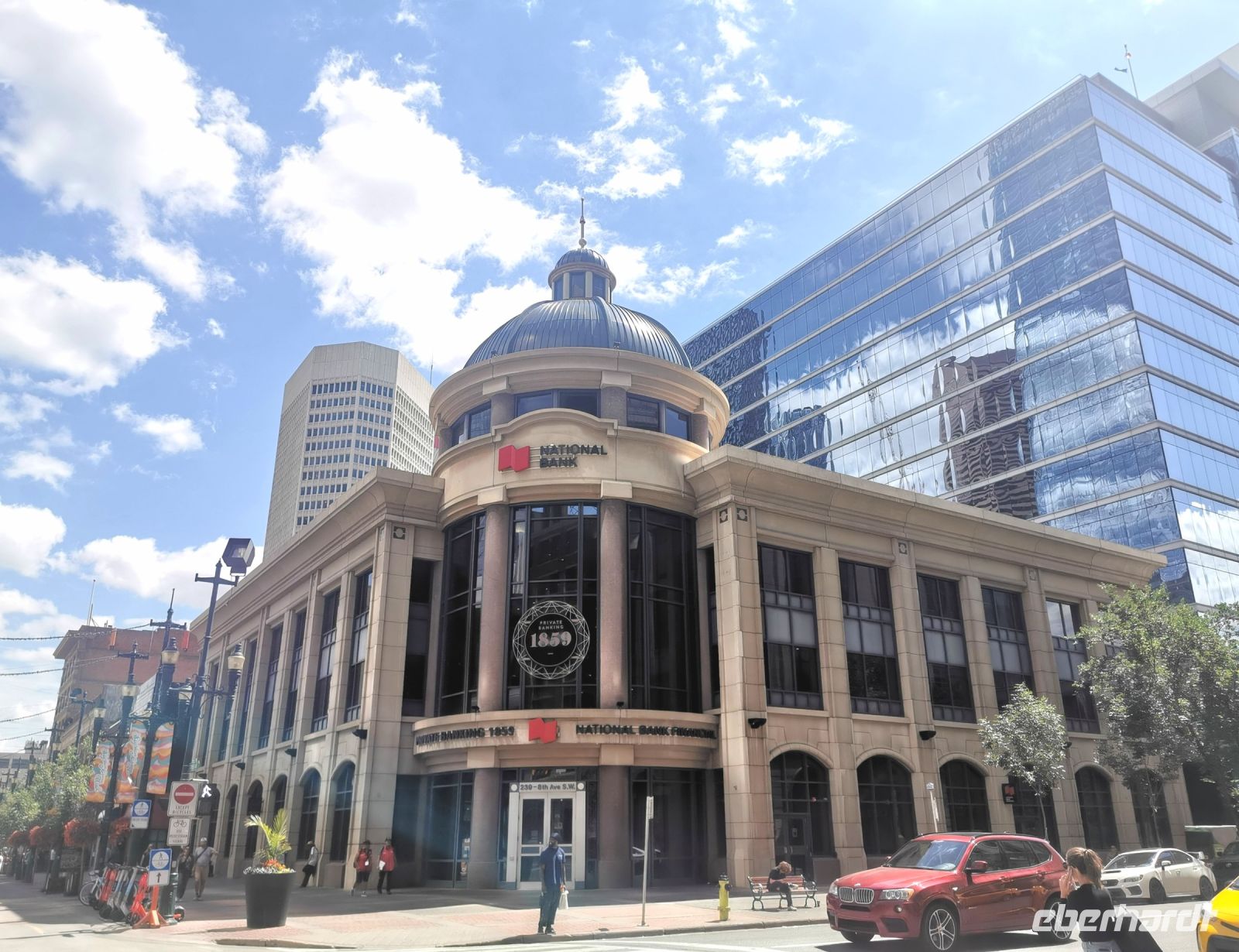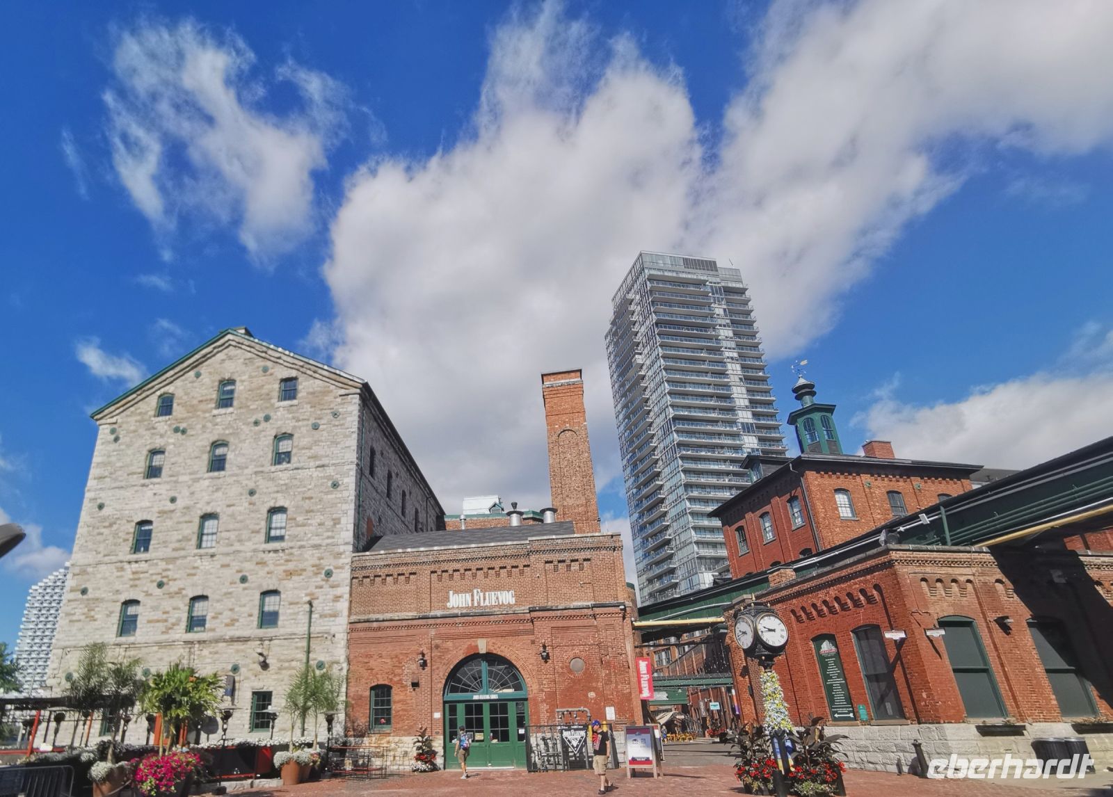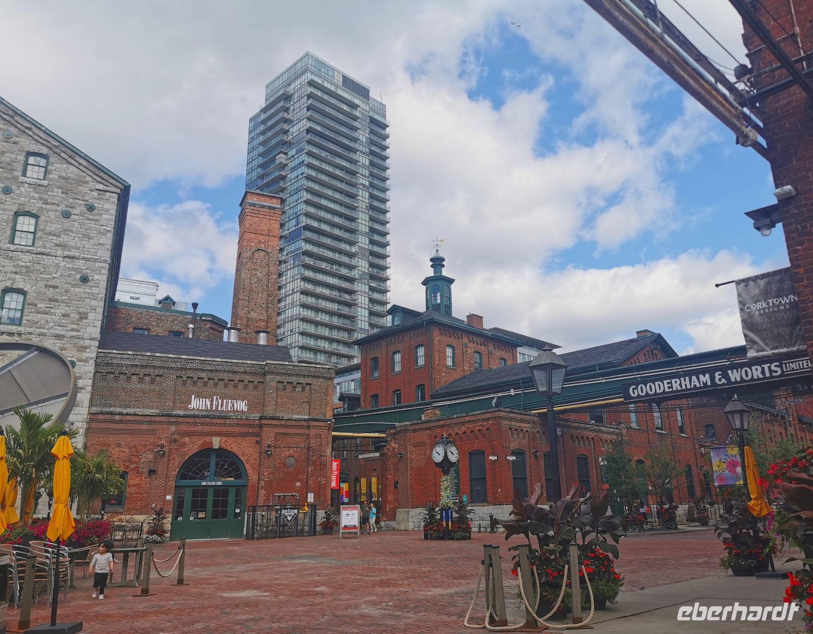 Im Distillery District machen wir eine kleine Pause, es gibt eine Fußgängerzone mit malerischen Gebäuden aus dem 19. Jahrhundert und man könnte meinen, man sei in Belfast gelandet. Einst befand sich hier einen große Whiskybrennerei, heute kann man den edlen Tropfen zumindest noch verkosten und rundherum haben sich kleine Kneipen und Cafés angesiedelt. Kunstliebhaber kommen gern hierher wegen der Galerien und Skulpturen, Tanz- und Musikveranstaltungen finden in den Sommermonaten fast täglich statt und die verschiedenen Theater bieten unzählige Vorstellungen an. Im Dezember kann man im Viertel sogar über einen Weihnachtsmarkt schlendern.