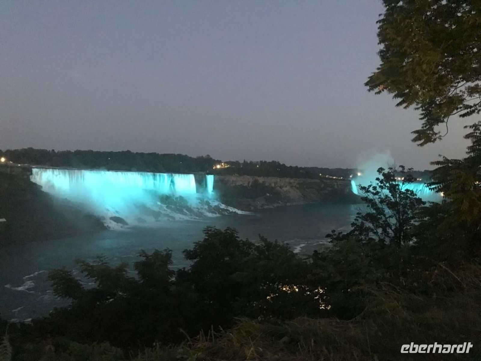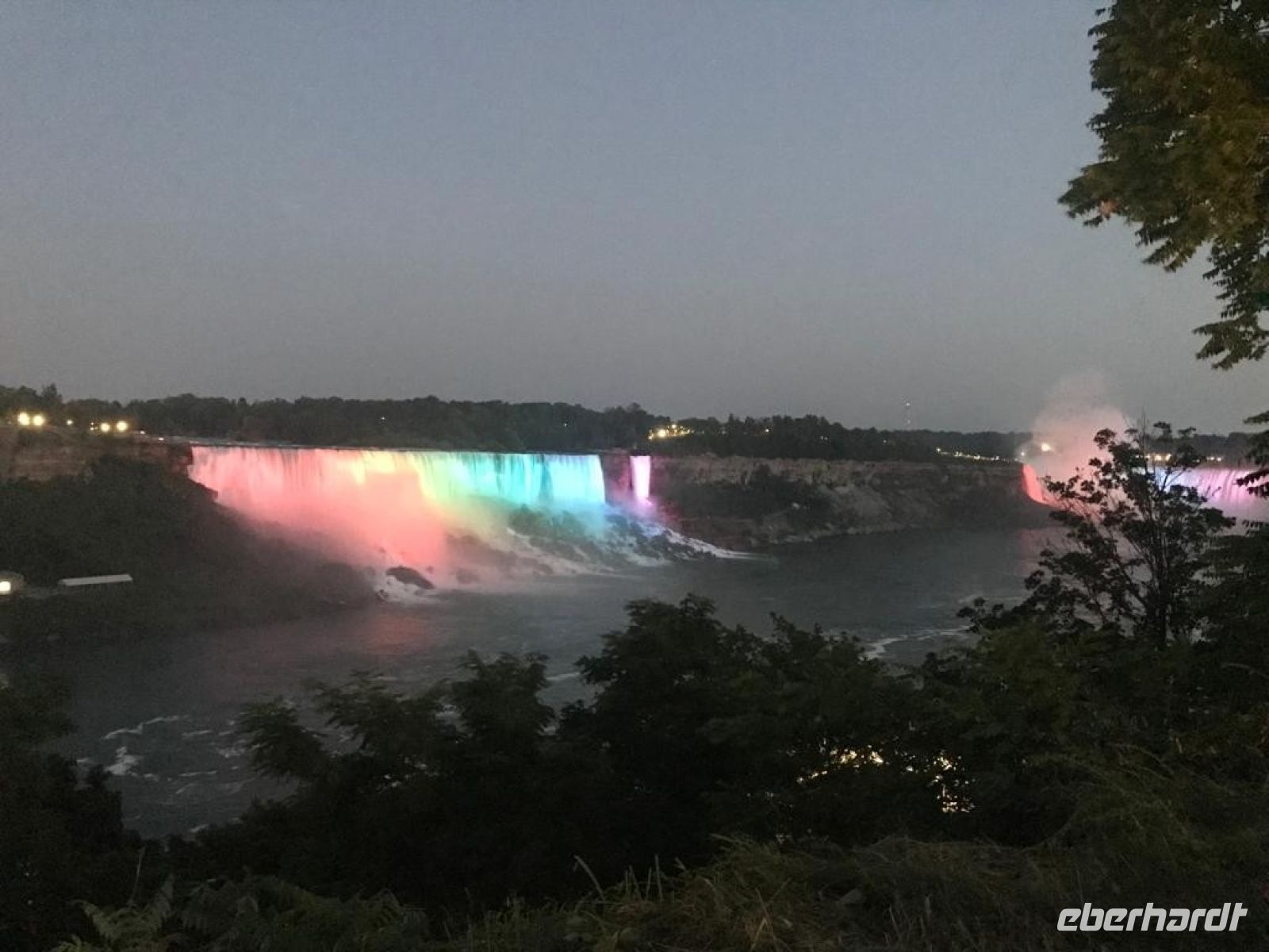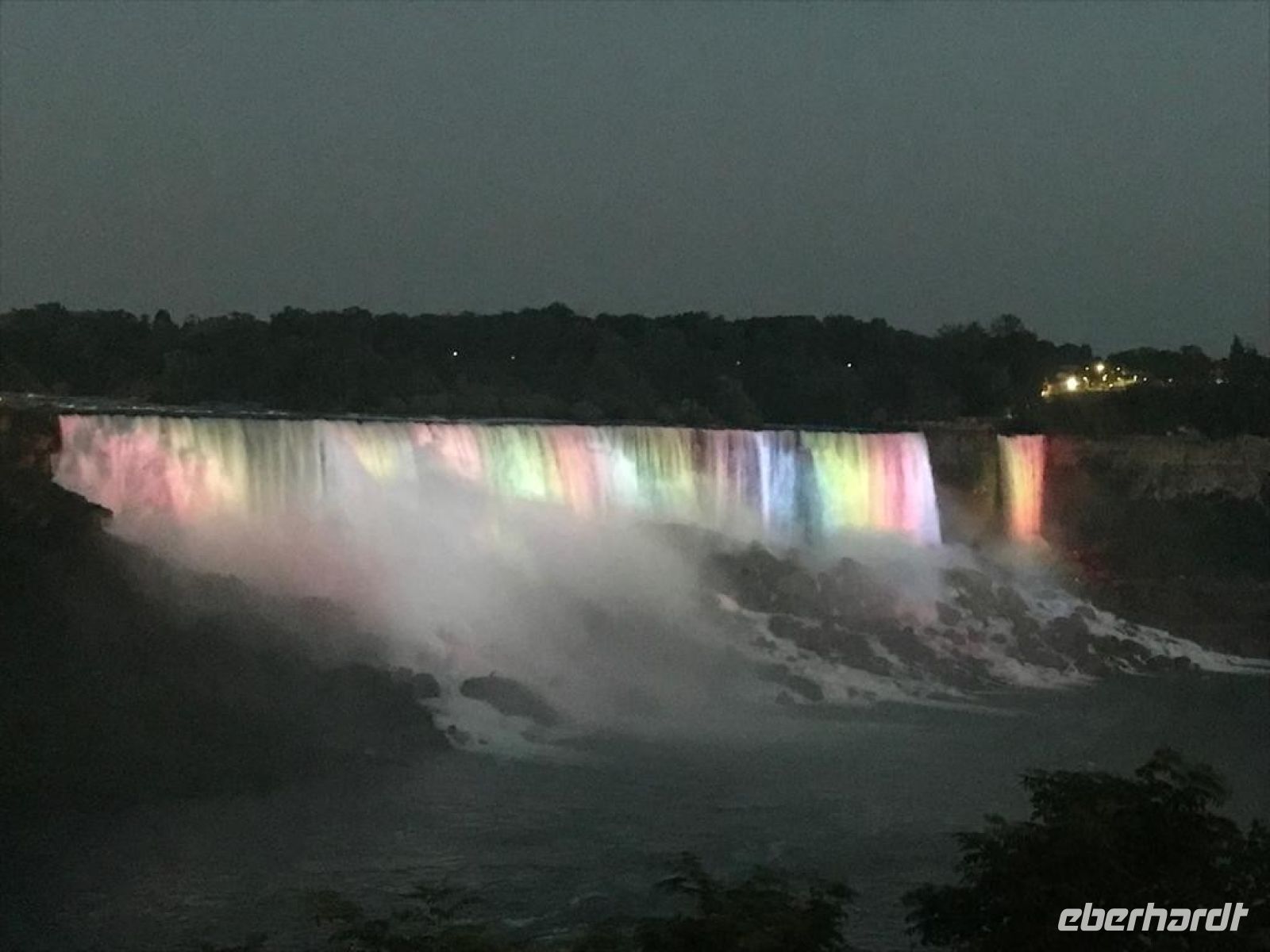 Sobald es dunkel wird, werden die Fälle in verschiedenem Farben angestrahlt und dieses Spektakel können wir uns nicht entgehen lassen. Manche Gäste halten sogar bis zum Feuerwerk um 22 Uhr durch. So geben die Fälle nochmal einen atemberaubenden Anblick ab. Tolle Fotos entstehen wieder und ein unvergeßlicher Tag findet einen krönenden Abschluß.