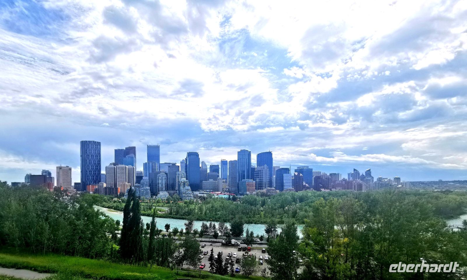 Die Fußgängerzone, durch die wir streifen, ist autofrei, von Restaurants und Cafés gesäumt und sehr modern. Die meisten Bewohner haben gerade Mittagspause und die Freisitze sind gut gefüllt, auch wir machen eine Mittagspause und treffen uns danach wieder, um zum Fort Calgary zu fahren. Dort steht heute noch ein altes Holzhaus, welches an die erste Siedlung erinnert. Obendrein ist man hier auf der anderen Seite des Bow River und hat einen bezaubernden Blick auf die Skyline der Stadt.