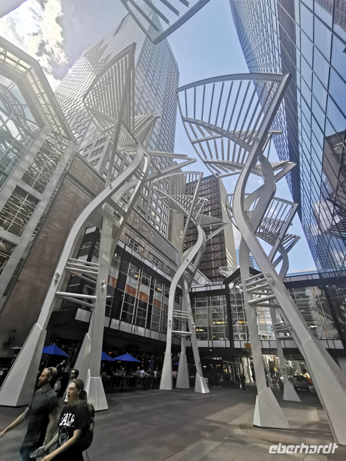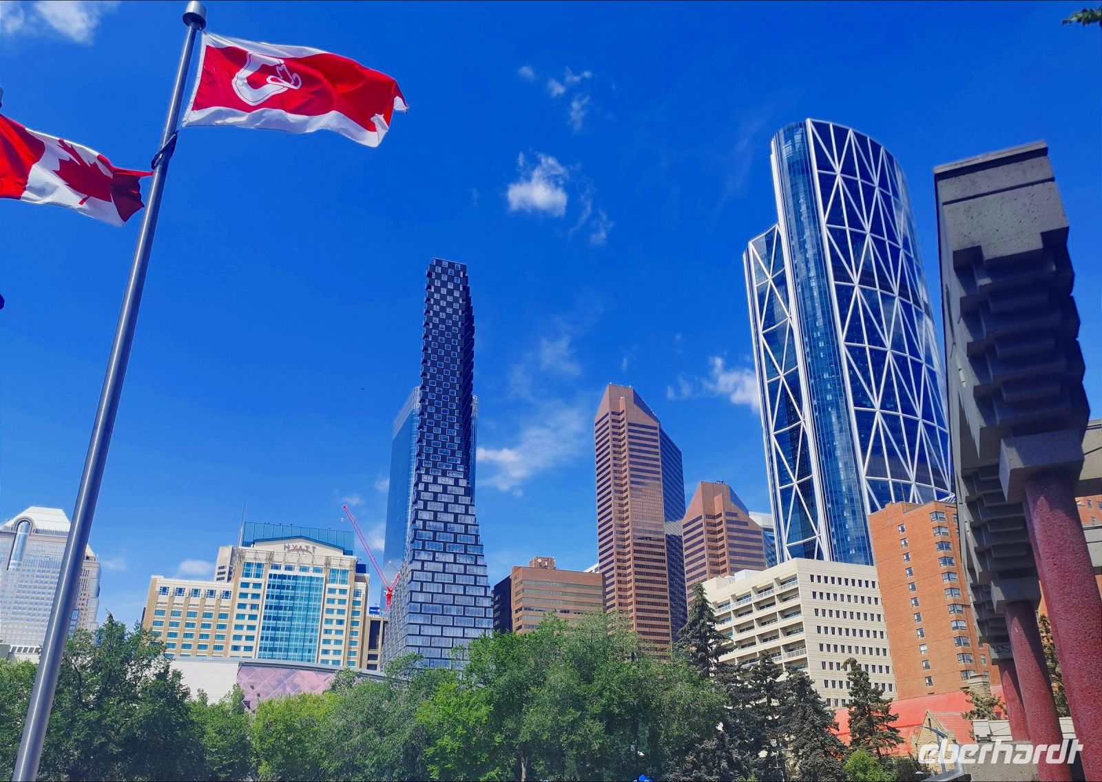 Sie fährt mit uns nach Calgary ins Stadtzentrum und wir laufen geneinsam ein wenig durch die Innenstadt dieser 1,4 Millionen Einwohner zählenden Metropole in der Provinz Alberta. Sie liegt an der Mündung des Elbow Flusses in den Bow Fluß. 1988 veranstaltete man hier die olympischen Winterspiele, und damit war Calgary der erste Austragungsort der Olympiade überhaupt in Kanada.