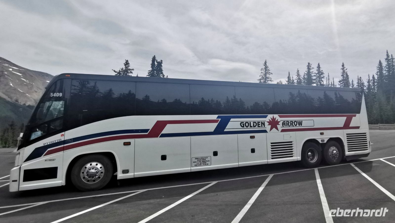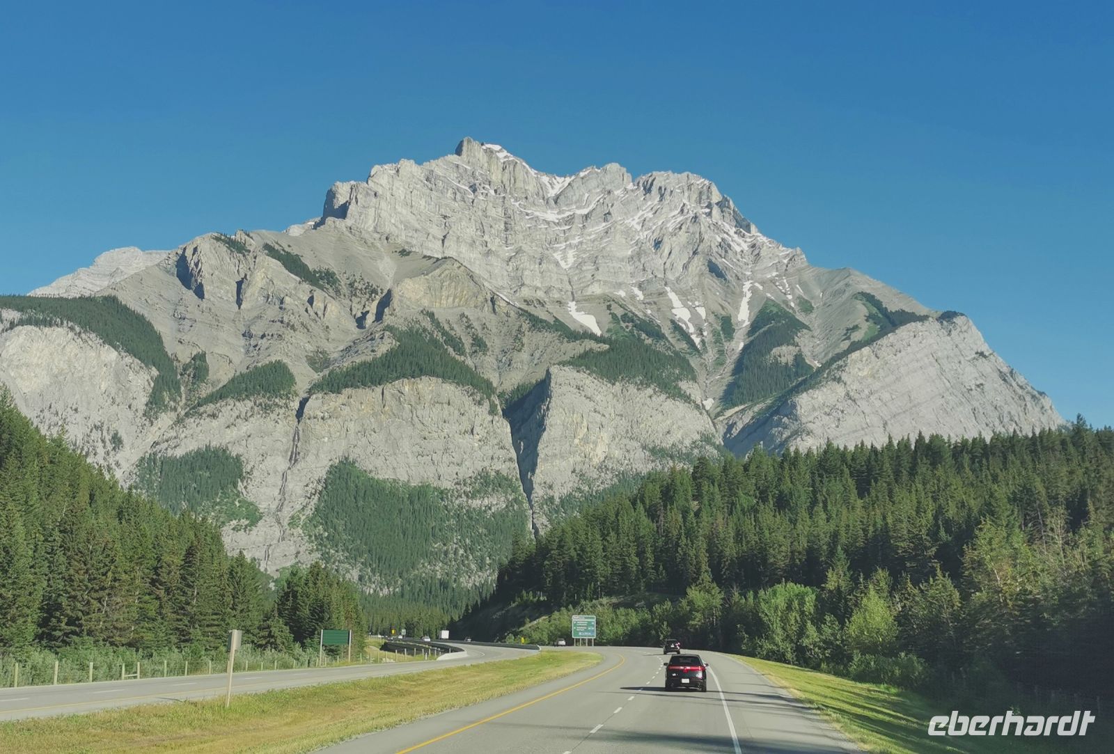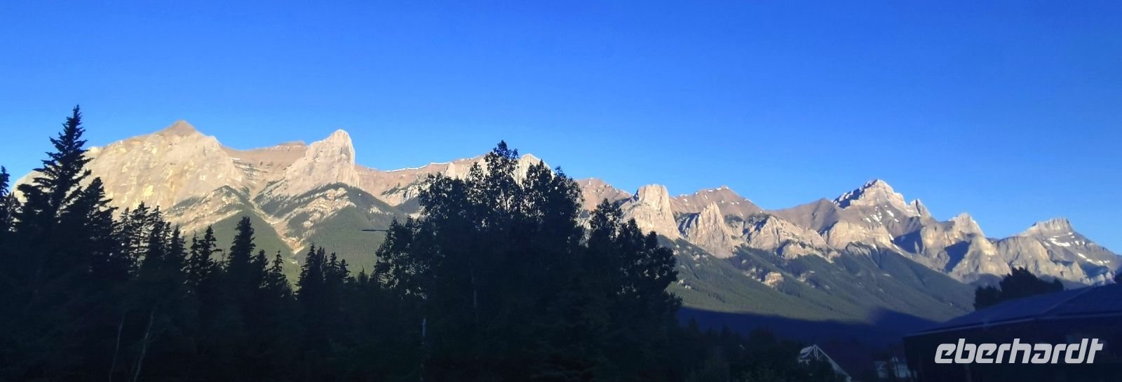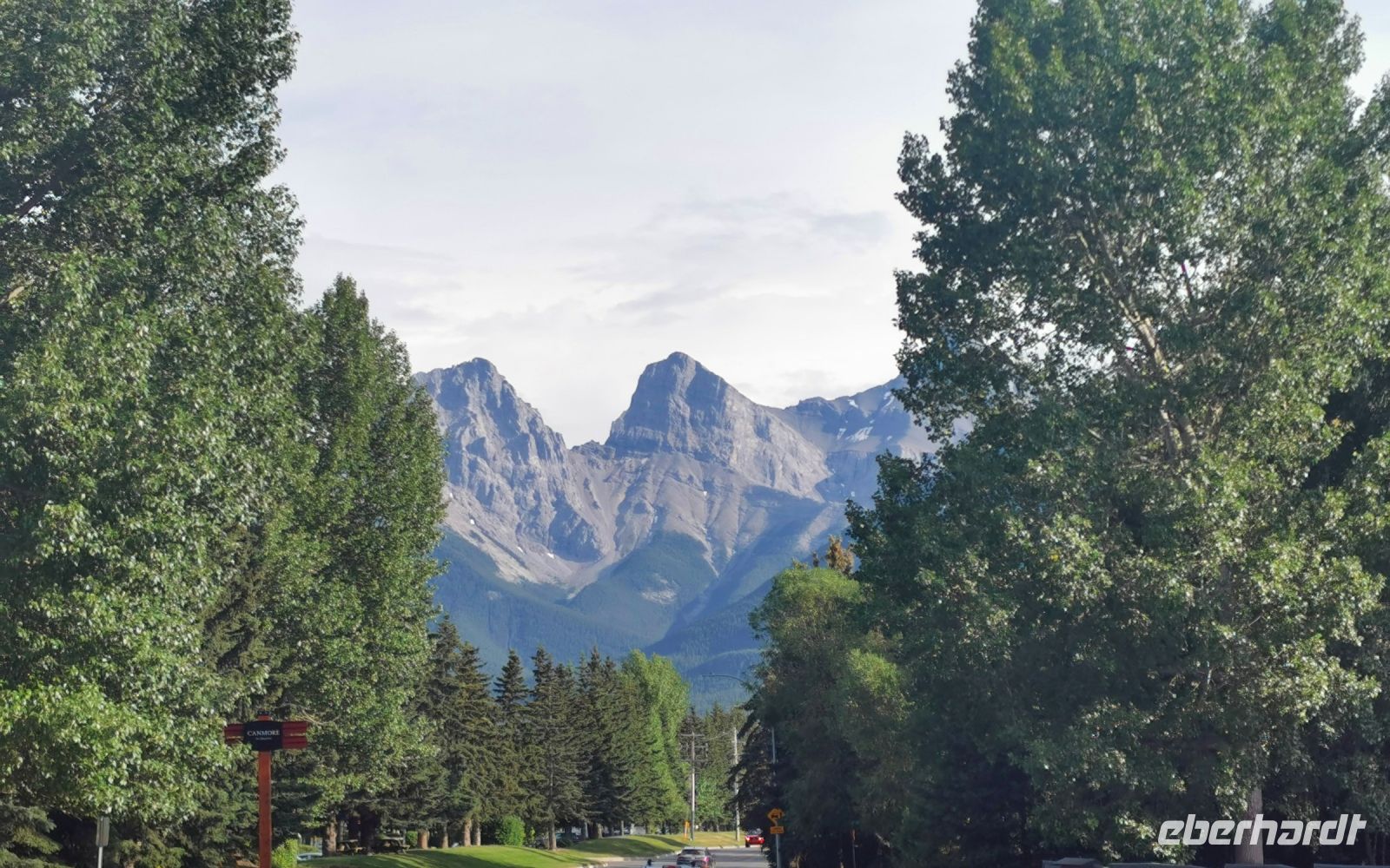 Heute genießen wir ein vorzügliches Frühstück in einem Bistro neben unserem Hotel in Canmore. Der Chef des Hauses ist Österreicher und wir bekommen warme Brötchen, leckeren Käse und dunkles Brot. Während dieser lang vermissten Genüsse blicken wir auf die Bergkette der Rocky-Mountain-Ausläufer und der Wettergott hat für uns den Himmel azurblau gefärbt. Es sind also die allerbesten Voraussetzungen für einen Bilderbuch-Urlaubstag.
