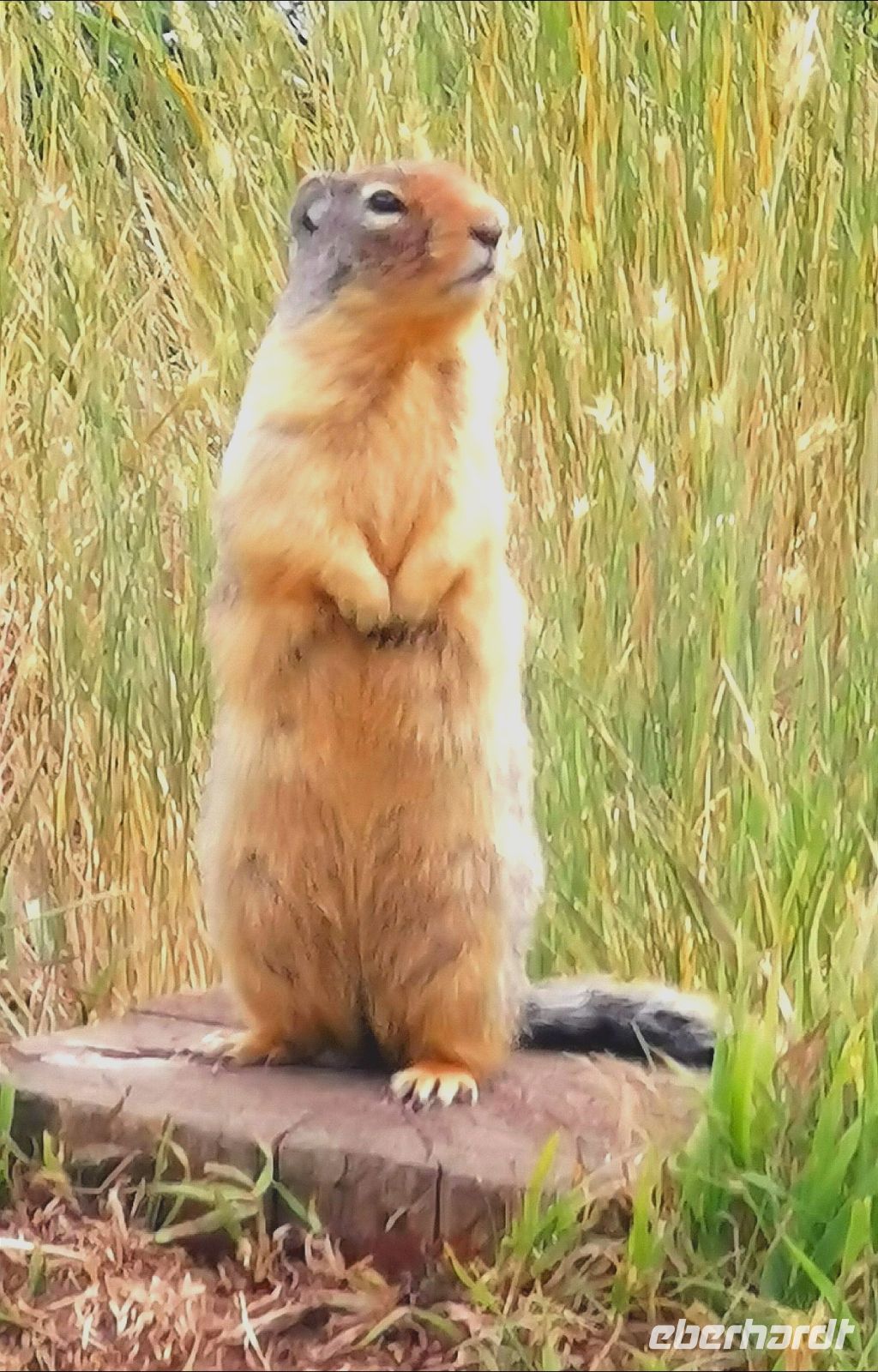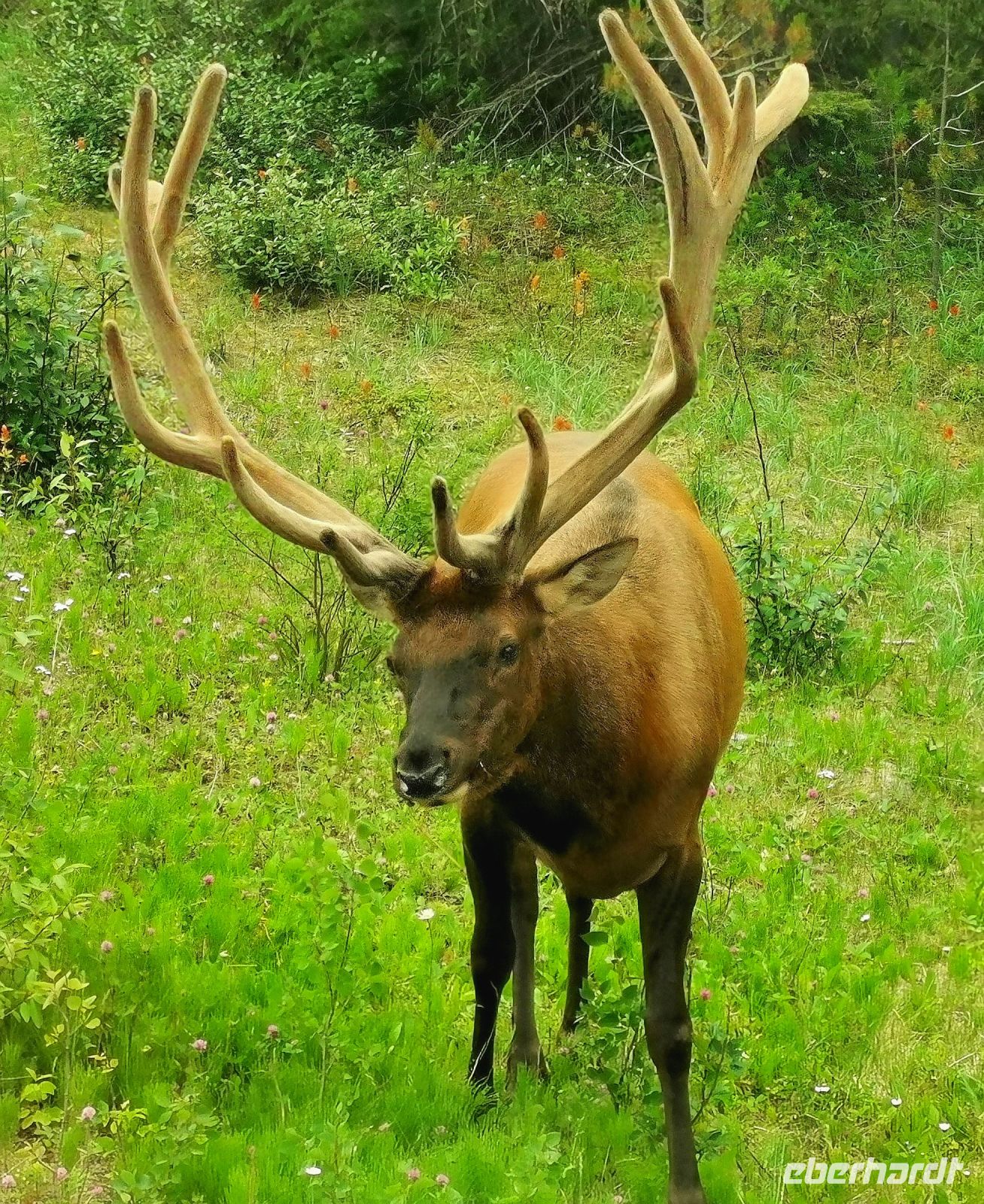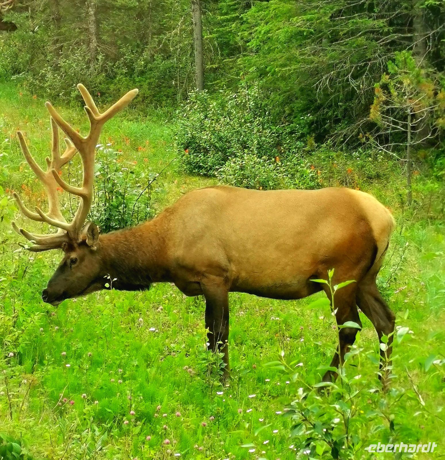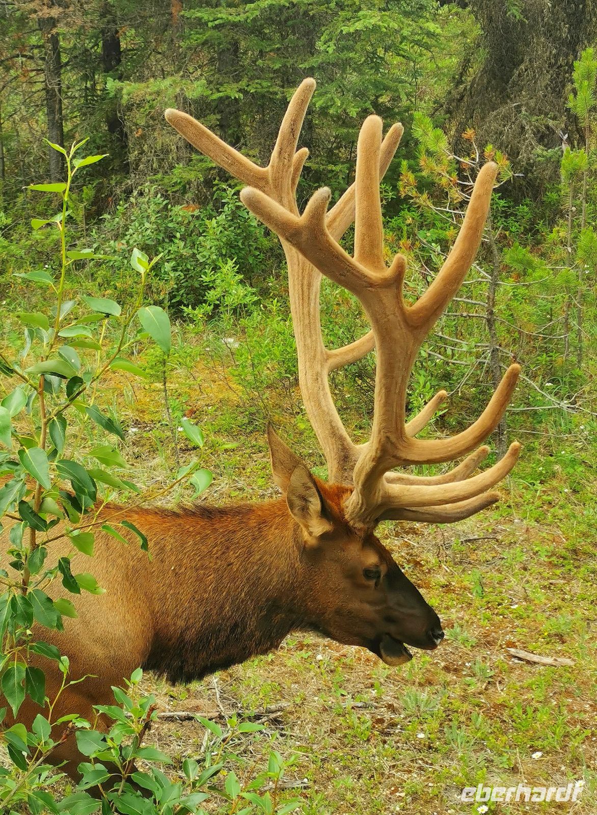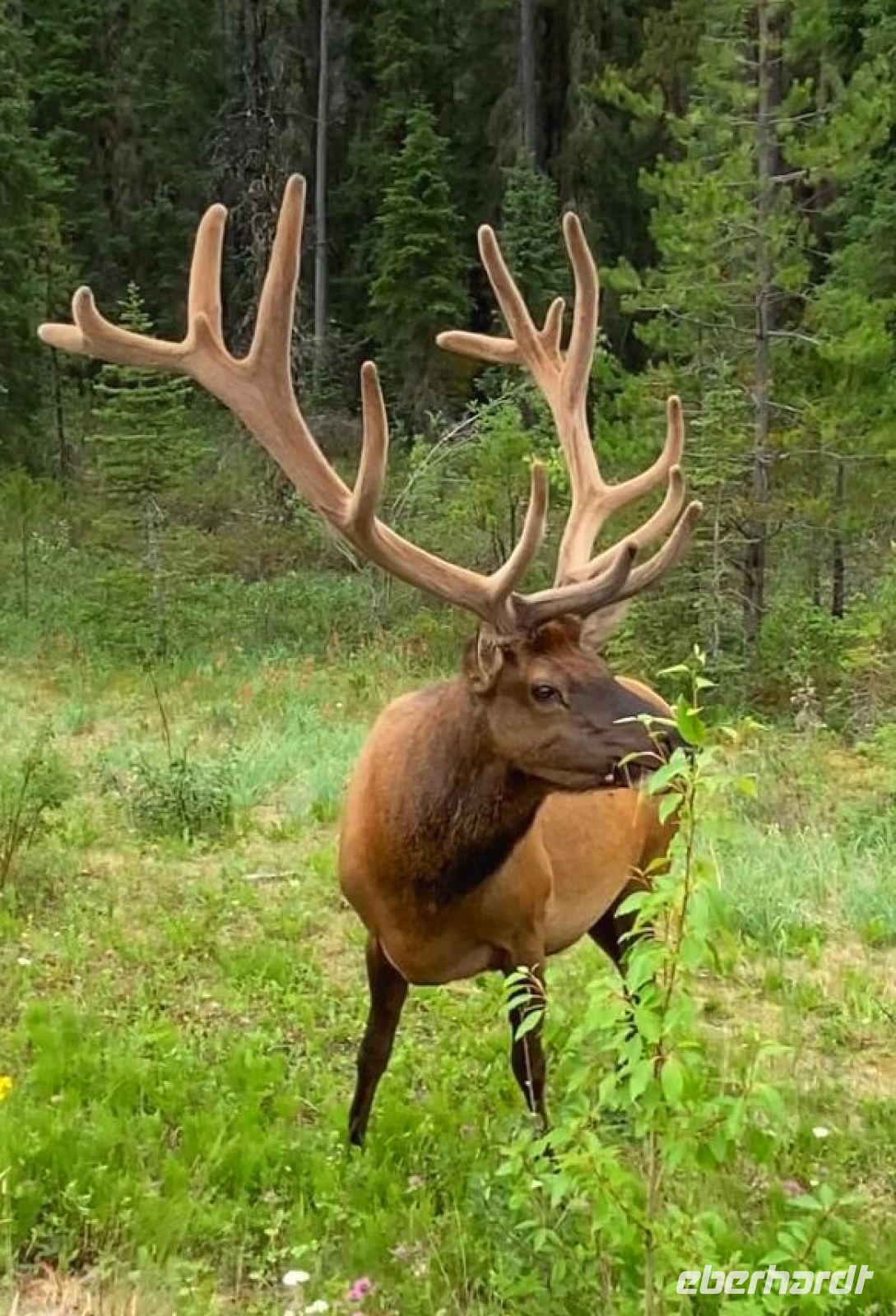Wenig später stehen wieder Autos vor uns, wir schmunzeln. Sie beobachten ein Murmeltier und das Murmeltier starrt wie zur Salzsäule erstarrt, die es umringenden Menschen an. Ein herrlicher Anblick. Viel weiter kommen wir nicht, an der nächsten Biegung stehen rechts vom Bus zwei riesige Wapiti Hirsche im Gras. Sie ziehen majestätisch an uns vorbei und ihre Geweihe sind unglaublich. Wie sie mit diesem riesigen Kopfschmuck im Wald nicht hängen bleiben, ist uns ein Rätsel.