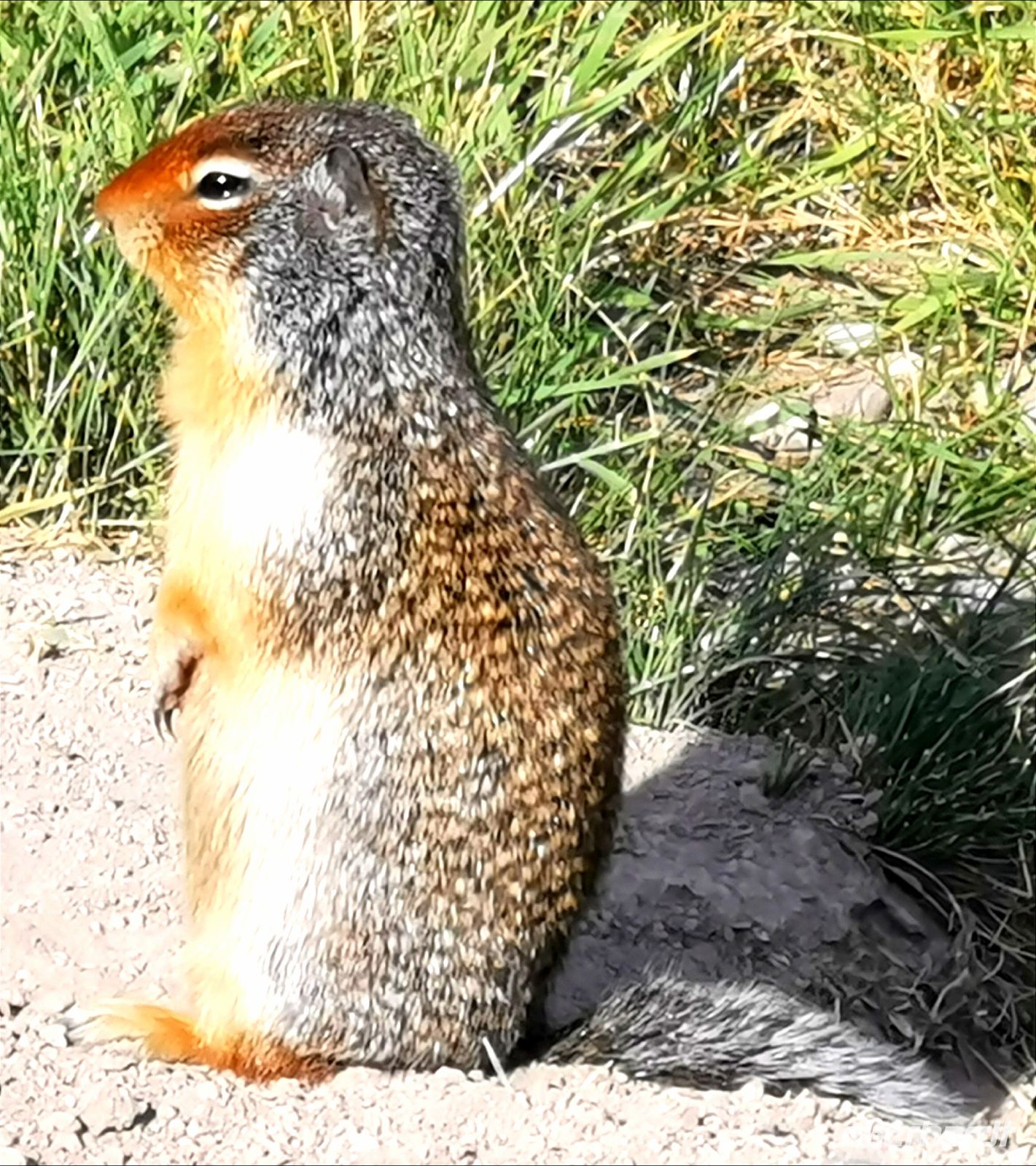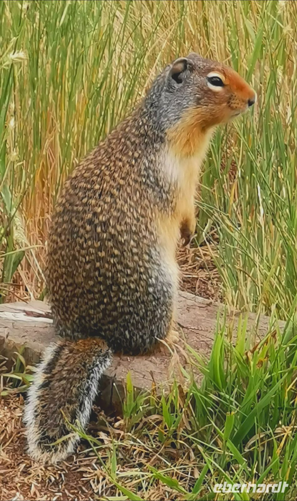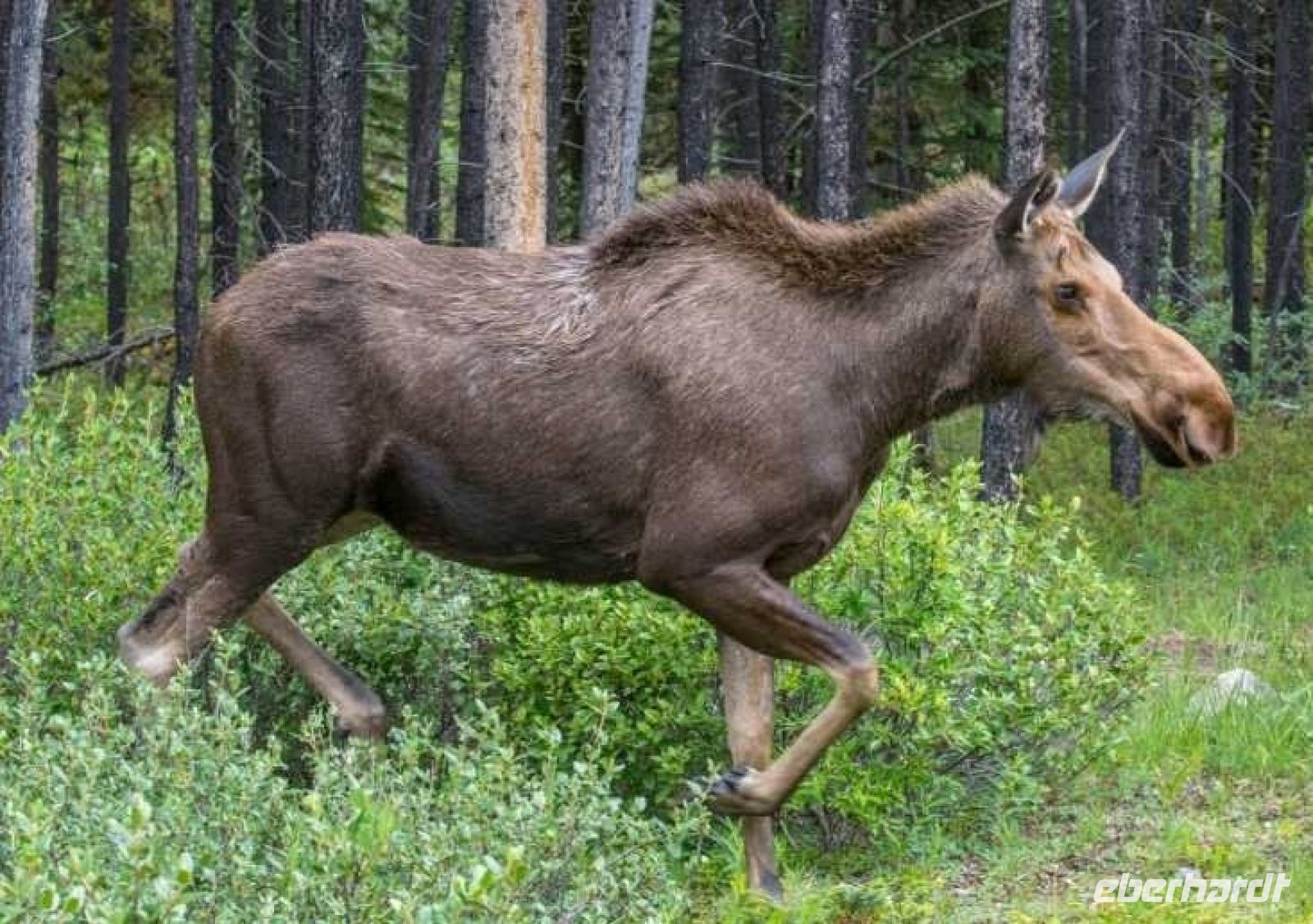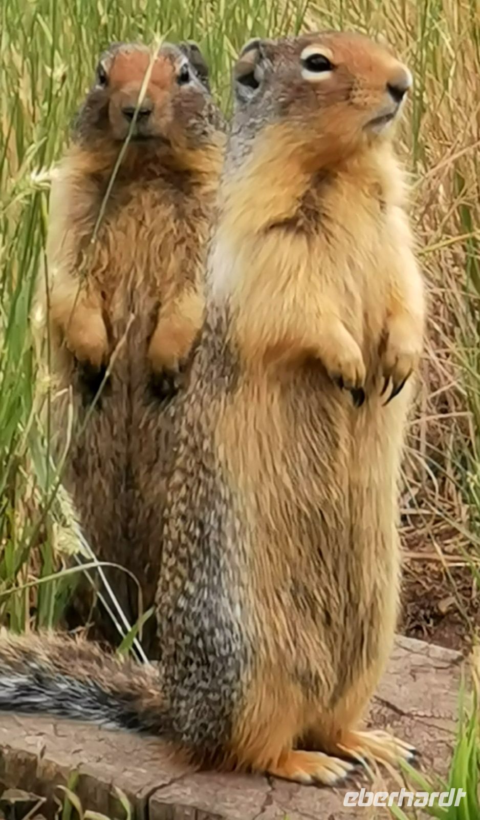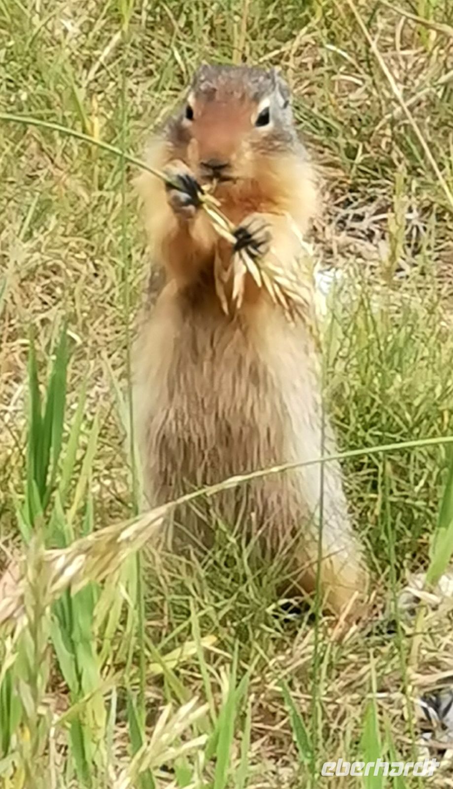 Wenig später stehen wieder Autos vor uns, wir schmunzeln. Sie beobachten ein Murmeltier und das Murmeltier starrt wie zur Salzsäule erstarrt, die es umringenden Menschen an. Ein herrlicher Anblick. Viel weiter kommen wir nicht, an der nächsten Biegung stehen rechts vom Bus zwei riesige Wapiti Hirsche im Gras. Sie ziehen majestätisch an uns vorbei und ihre Geweihe sind unglaublich. Wie sie mit diesem riesigen Kopfschmuck im Wald nicht hängen bleiben, ist uns ein Rätsel.