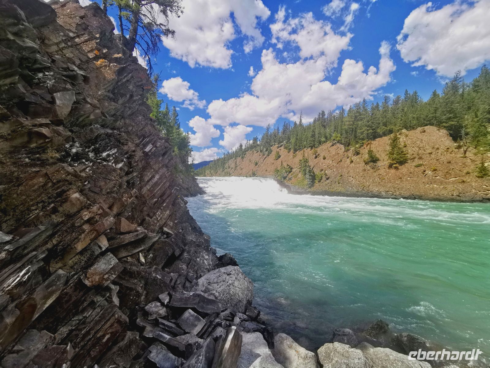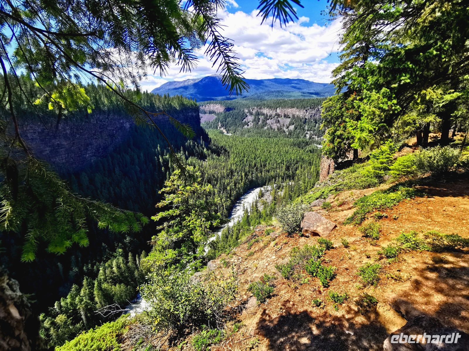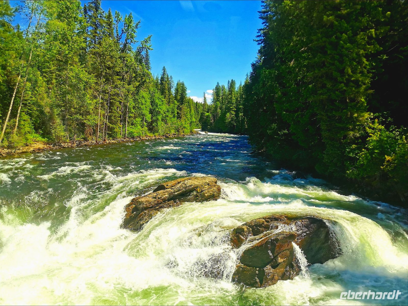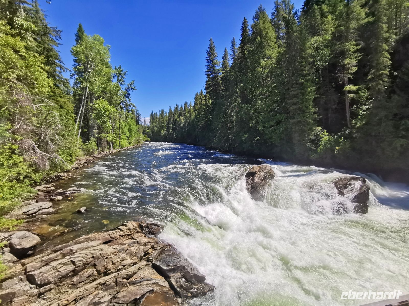 Nach diesem Naturerlebnis halten wir noch am unweit gelegenen Dawson Fall. Dieser wurde 1913 von Landvermesser Robert Henry Lee nach George Herbert Dawson, dem Generalvermesser für British Columbia benannt. Er ist nicht so hoch und wasserreich, wie der Helmcken Fall, trotz allem lohnt der Halt, zumal man beim Anblick leckere Blaubeeren, die im Wald wild wachsen, genießen kann. Als wir wieder die Hauptstraße nach Kamloops erreichen, essen wir noch ein Eis am Informationszentrum. Der Temperaturunterschied zu den viel höher gelegenen Rocky Mountains beträgt nämlich fast 20 Grad. Heute Morgen fuhren wir bei 16 Grad los, jetzt sind es 36.