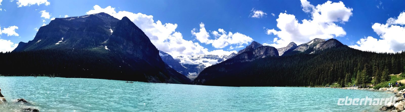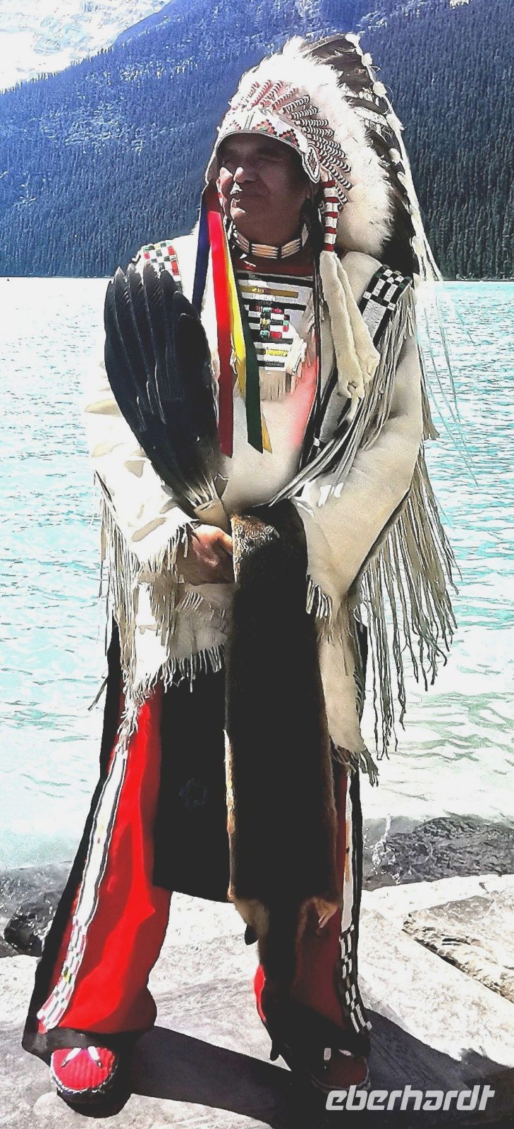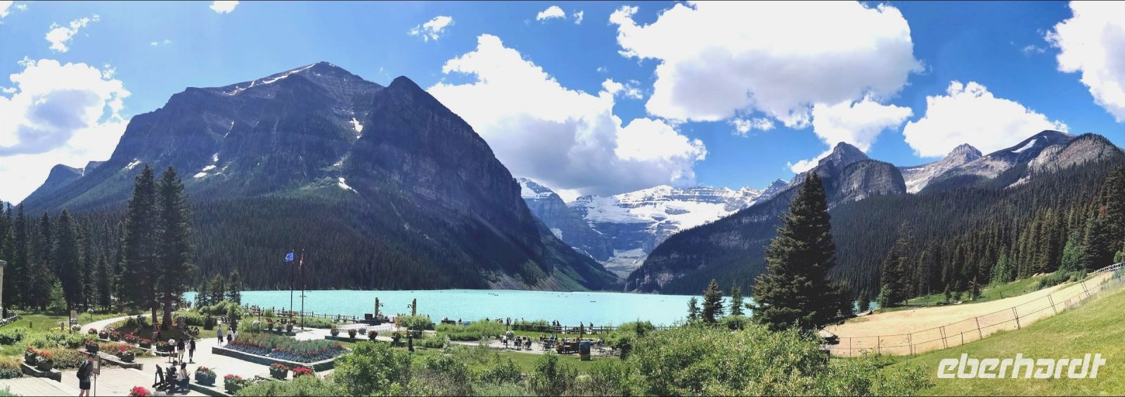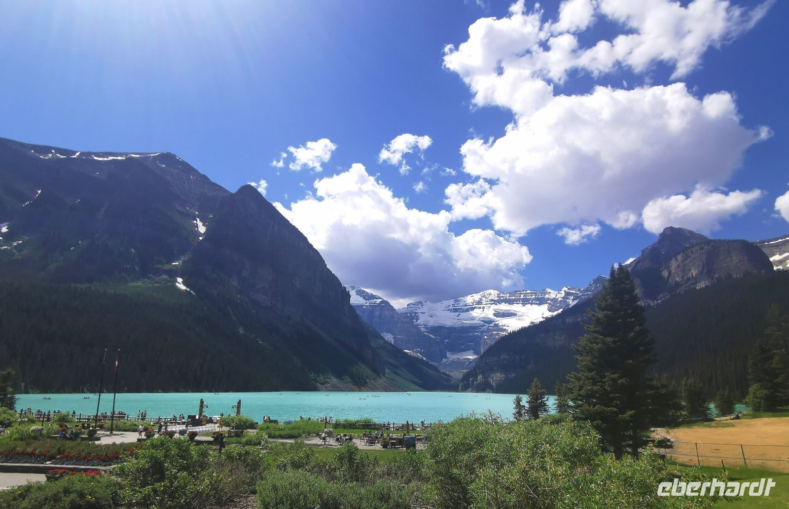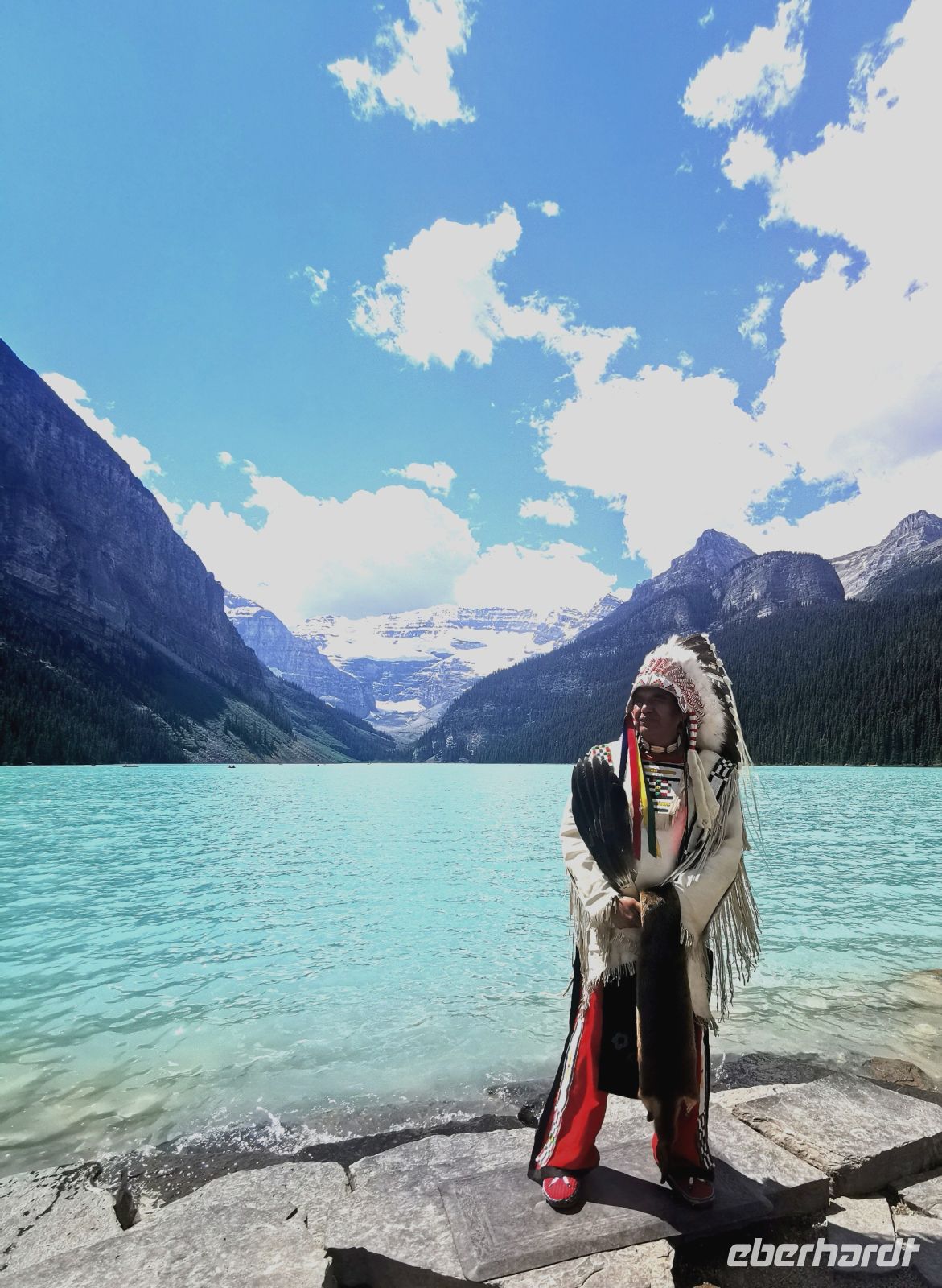 Am liebsten würden wir an jeder Kurve einen Fotostop einlegen, aber zur Mittagszeit sollen wir den berühmten Lake Louise erreichen. Hier steht wieder eines der wundervollen Fairmount Hotels: das Chateau Lake Louise und die prächtigen Leuchter im Foyer verzaubern uns. Vor dem Hotel liegt der türkisblaue See, der nach Prinzessin Louise Caroline Alberta, einer Tochter von Königin Victoria, benannt ist. Hinter dem See erheben sich der Mount Temple (3.543 Meter), Mount Whyte (2.983 Meter) und Mount Niblock (2.976 m). Oberhalb des Sees kann man im Winter auf dem Mount Whitehorn Ski fahren. Der Anblick dieses Sees mit den majestätisch dahinter gelegenen Bergen und dem Gletscher in der Mitte ist so hinreißend, daß wir gar nicht mehr zum Bus zurück wollen und auch die vielen Besucher stören uns da wenig. Obendrein treffen wir am See den ersten Indianer auf unserer Reise und als wir höflich fragen, sagt er uns sogar ein paar Worte in seiner Sprache, die ein wenig klingt, wie die Sprache der Aborigines.