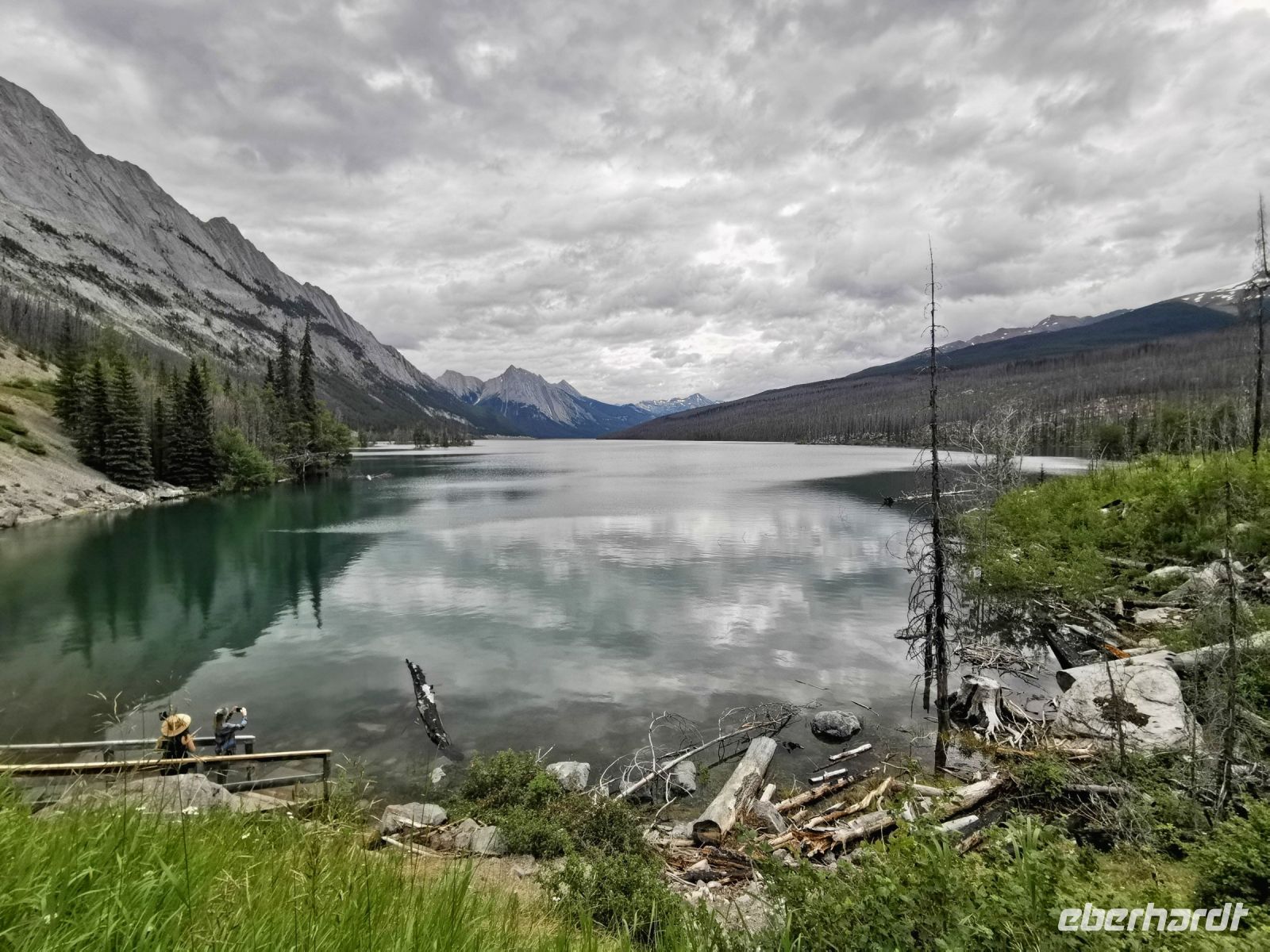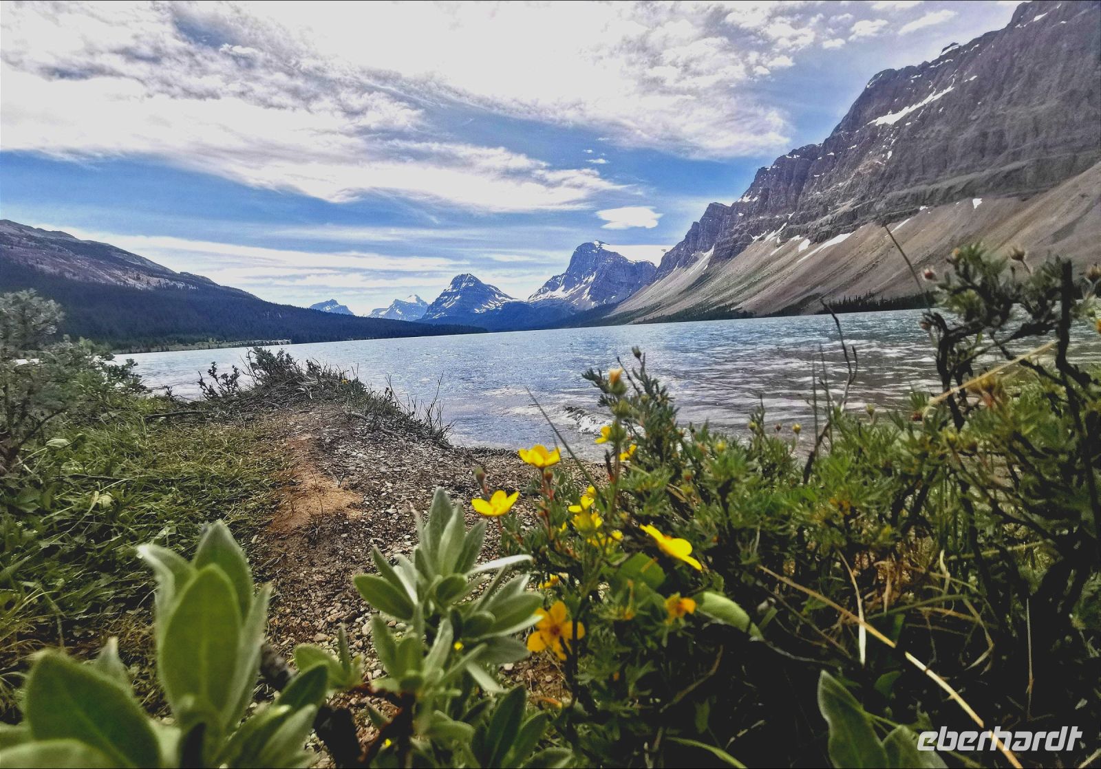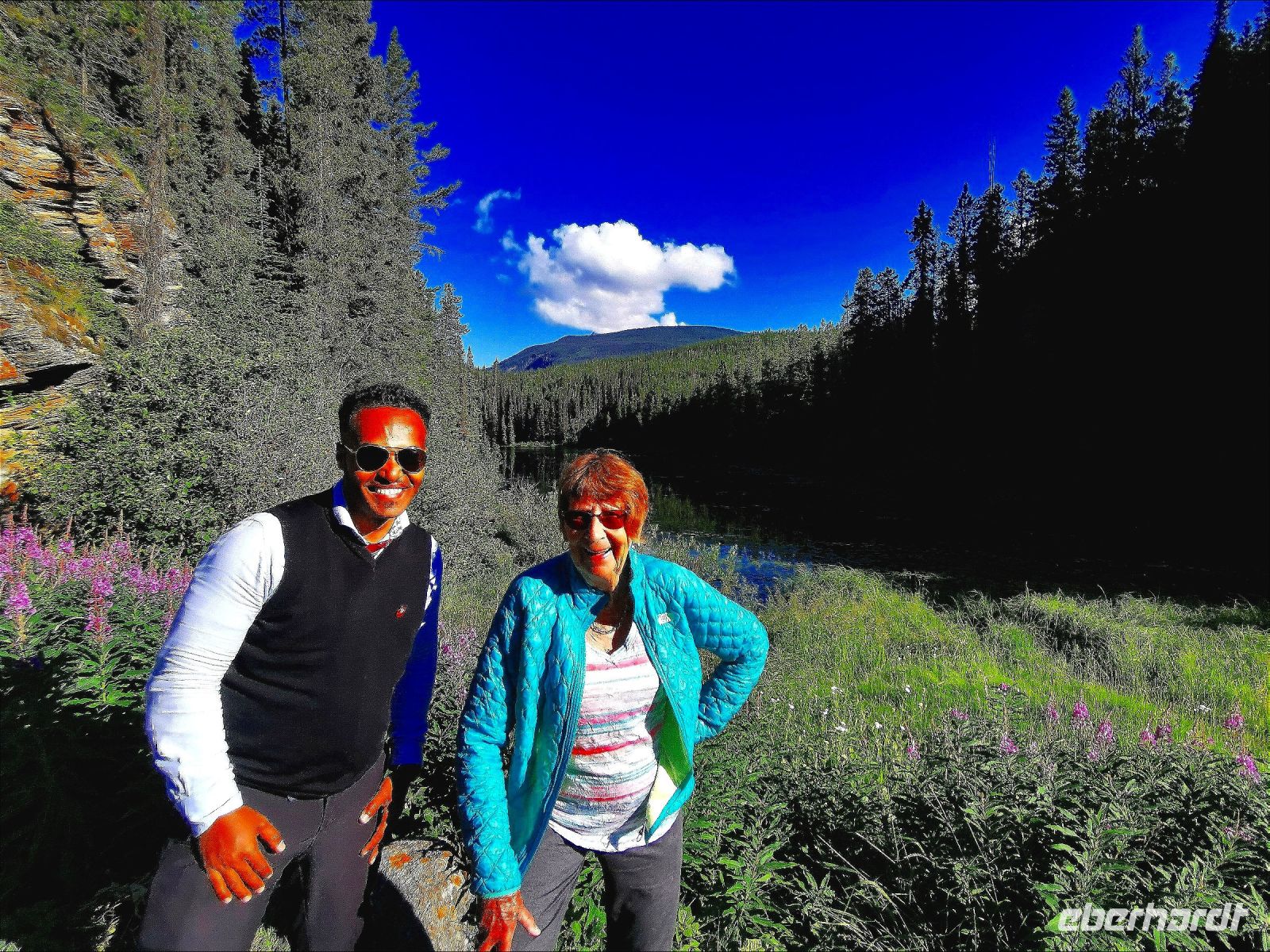 Vor lauter Tierbeobachtungen hängen wir dem Zeitplan mächtig hinterher und unsere Mittagspause ist eher eine Nachmittagspause. Wir verbringen sie am Maligne Lake. Er liegt auf 1.670 Metern Höhe und hat eine Oberfläche von 20 km². Er wird ebenfalls mit Gletscherwasser gespeist und seine Temperatur steigt nie über vier Grad. Die Entdeckung dieses Sees wird Mary Schäffer im Jahre 1908 zugeschrieben. Sie war eigentlich auf der Suche nach einem See am Oberlauf des Athabasca, den sie von Indianern beschrieben bekommen hatte. Die Skizze, die sie erhalten hatte, war allerdings nicht sehr gut und so entdeckte sie den Maligne Lake. Wir laufen zu dem Aussichtspunkt, der ihren Namen trägt und genießen die am Wegesrand bunt blühende Blumenpracht.