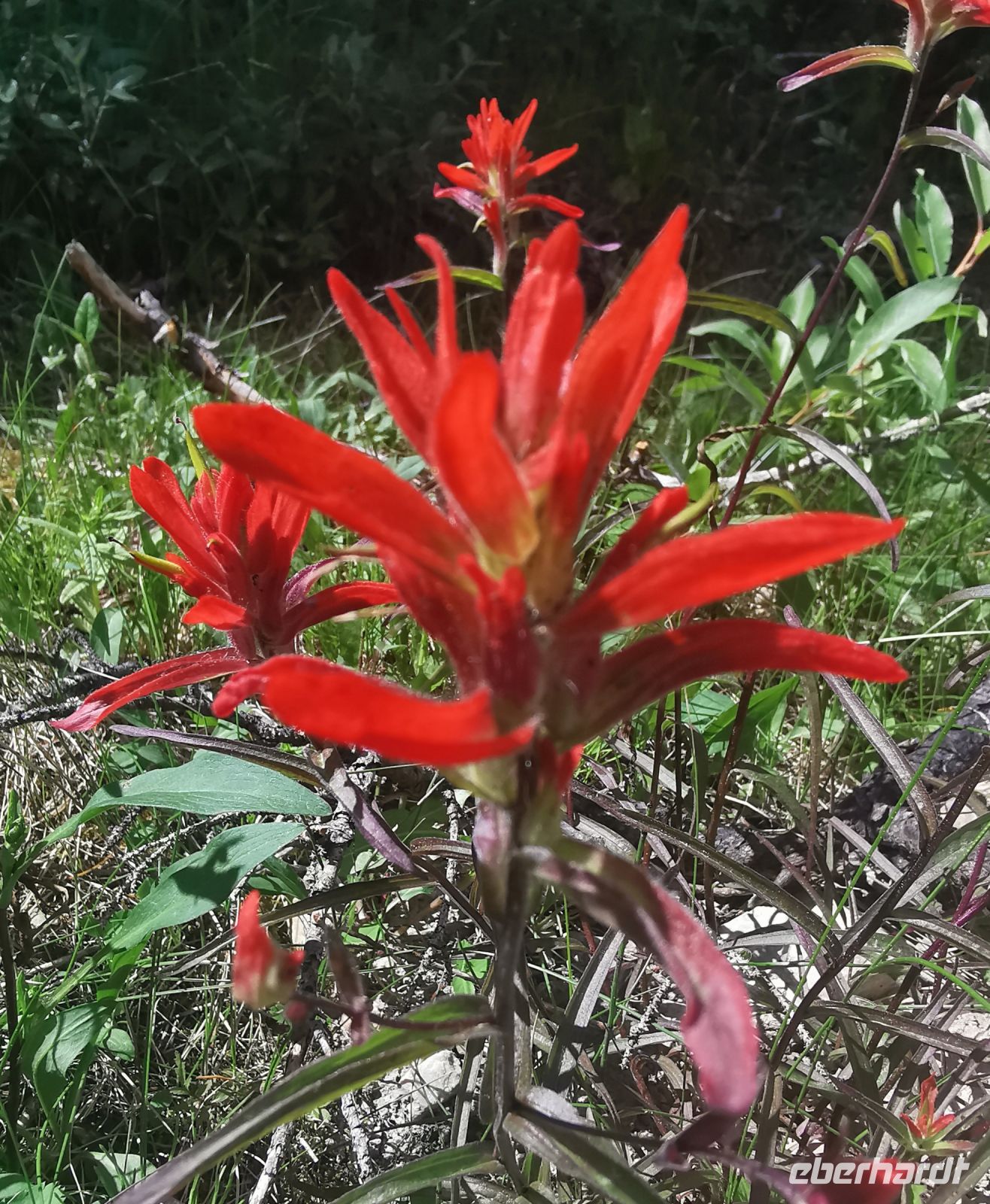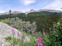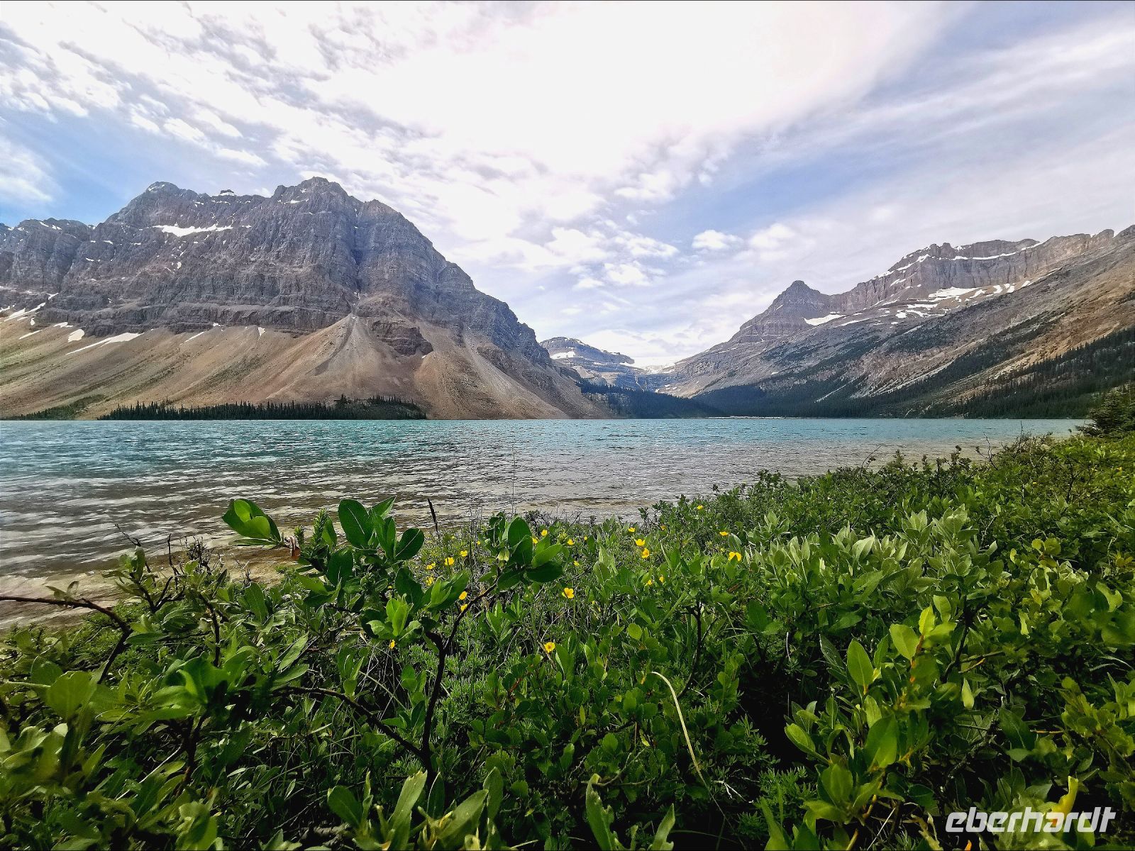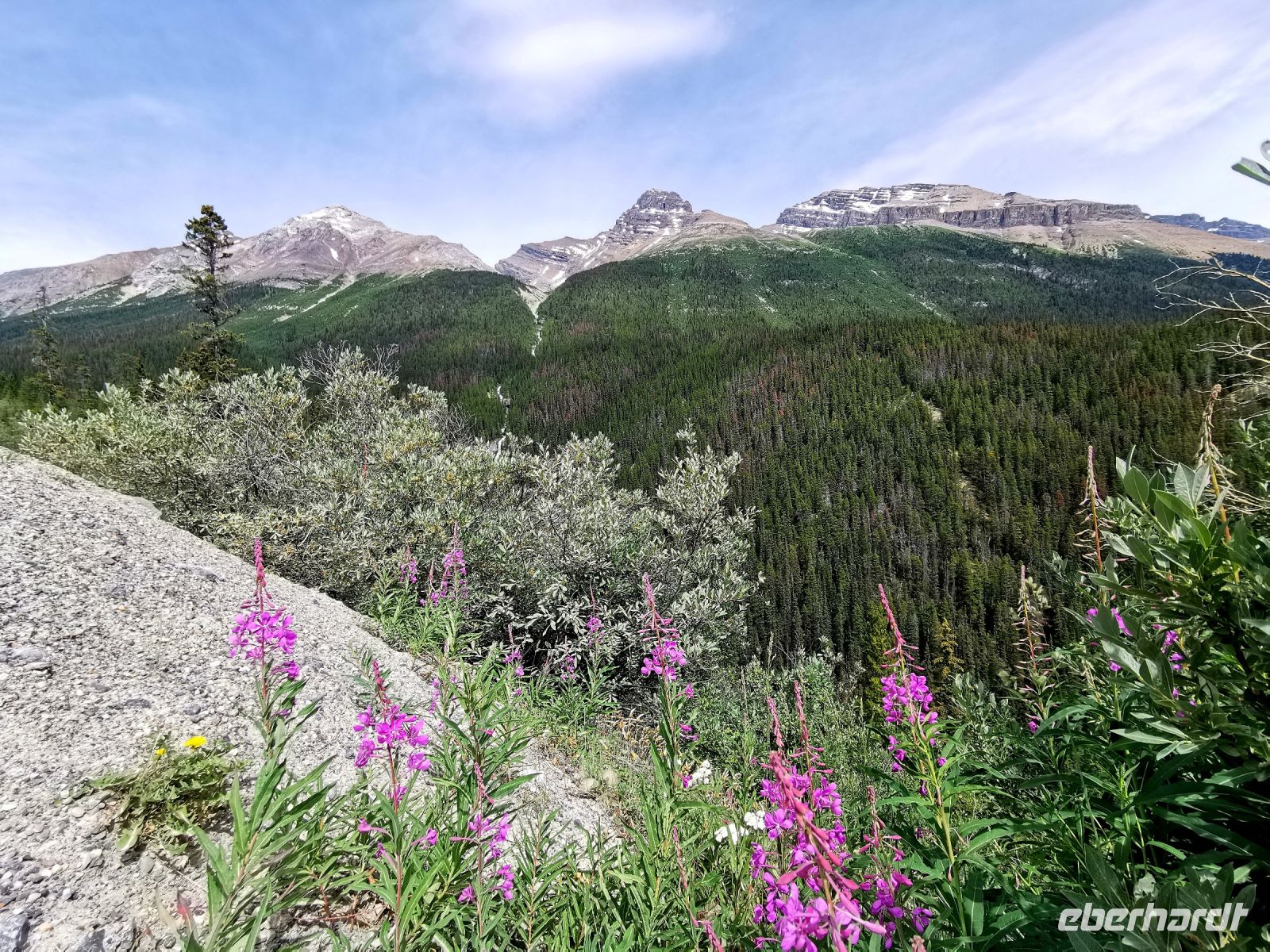 Vor lauter Tierbeobachtungen hängen wir dem Zeitplan mächtig hinterher und unsere Mittagspause ist eher eine Nachmittagspause. Wir verbringen sie am Maligne Lake. Er liegt auf 1.670 Metern Höhe und hat eine Oberfläche von 20 km². Er wird ebenfalls mit Gletscherwasser gespeist und seine Temperatur steigt nie über vier Grad. Die Entdeckung dieses Sees wird Mary Schäffer im Jahre 1908 zugeschrieben. Sie war eigentlich auf der Suche nach einem See am Oberlauf des Athabasca, den sie von Indianern beschrieben bekommen hatte. Die Skizze, die sie erhalten hatte, war allerdings nicht sehr gut und so entdeckte sie den Maligne Lake. Wir laufen zu dem Aussichtspunkt, der ihren Namen trägt und genießen die am Wegesrand bunt blühende Blumenpracht.
