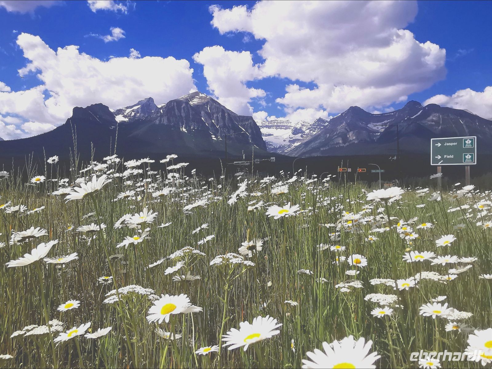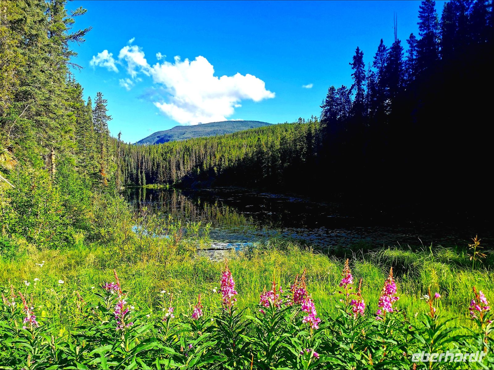 Unseren ersten Fotostop legen wir am Yellow Head Pass an einem kleinen See ein. Die lila Blumenpracht bildet einen tollen Kontrast zum strahlenden Blau des Himmels und des Sees.