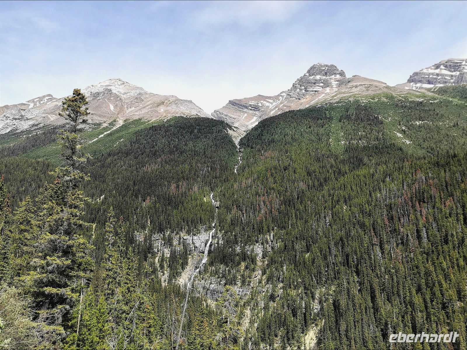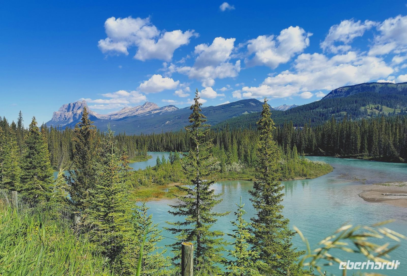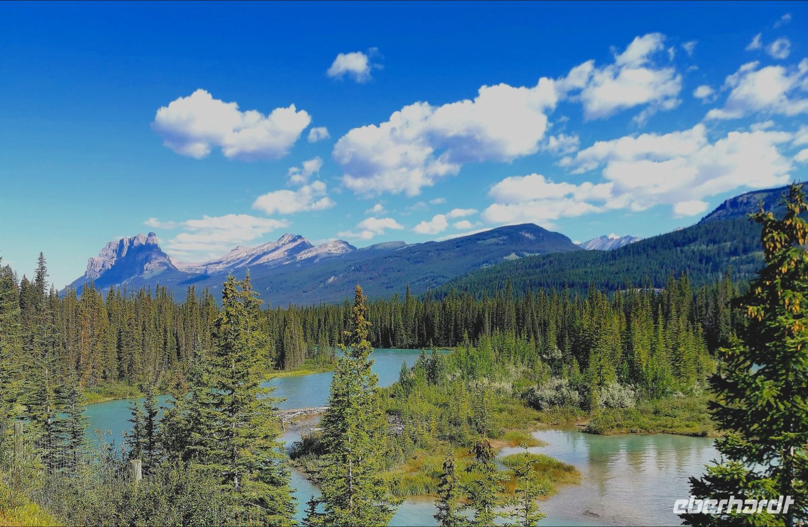 Während der Fahrt haben wir einen atemberaubenden Blick auf die schneebedeckten Berge der Rocky Mountains. Mehr und mehr ändert sich die Landschaft, die Täler werden weiter, die Flüsse breiter, die Berge sind weniger hoch, bis zur Spitze bewachsen und nicht so schroff wie im Nationalpark.