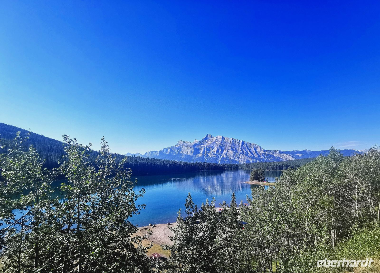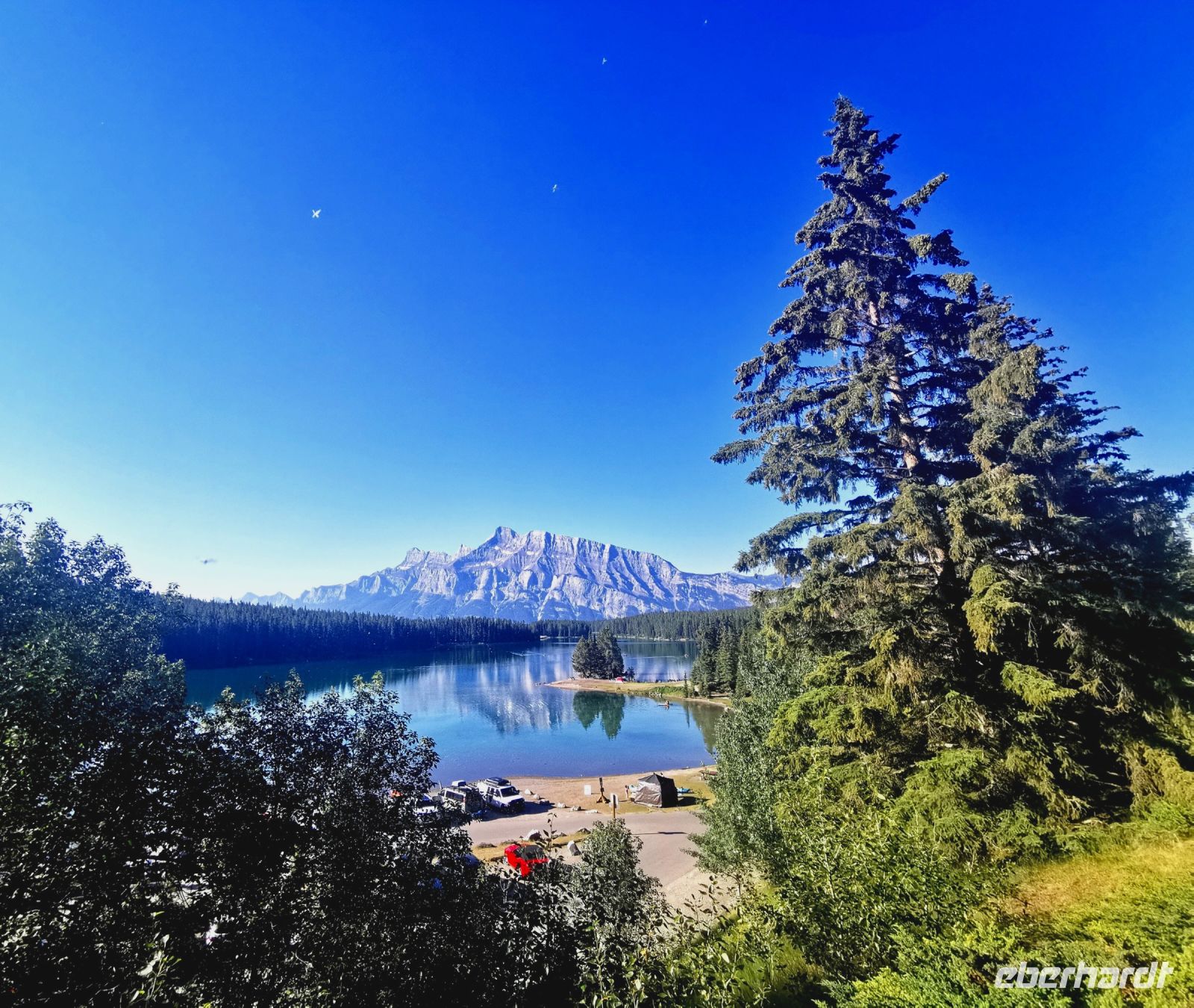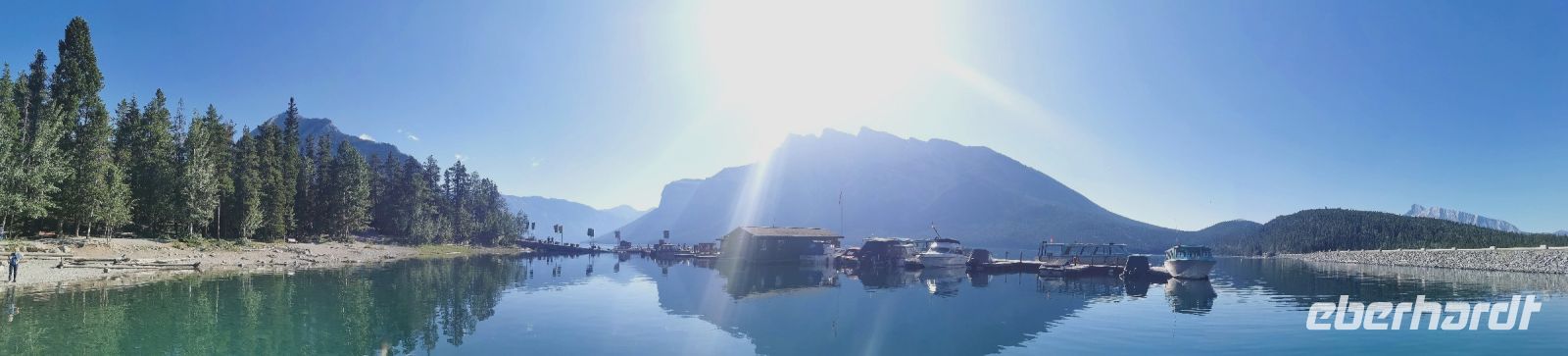 Unseren ersten Fotostop legen wir am Two Jack Lake ein. In diesem See spiegelt sich der Mount Rundle und schon dieser erste See bezaubert uns im Morgenlicht. Nach sieben Tagen in großen Städten, können wir uns gar nicht sattsehen an dieser atemberaubenden Naturkulisse. Der nächste See, an dem wir halten ist der Lake Minnewanka, ein Gletschersee, der 21 km lang und 142 Meter tief ist. Er ist der zweitlängste See in den kanadischen Rocky Mountains.