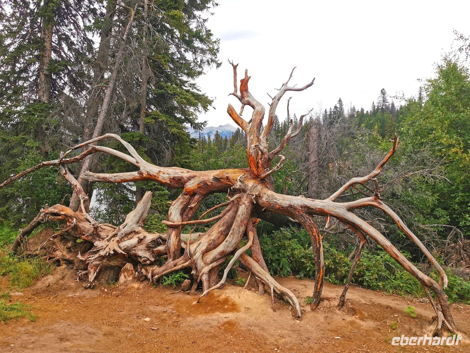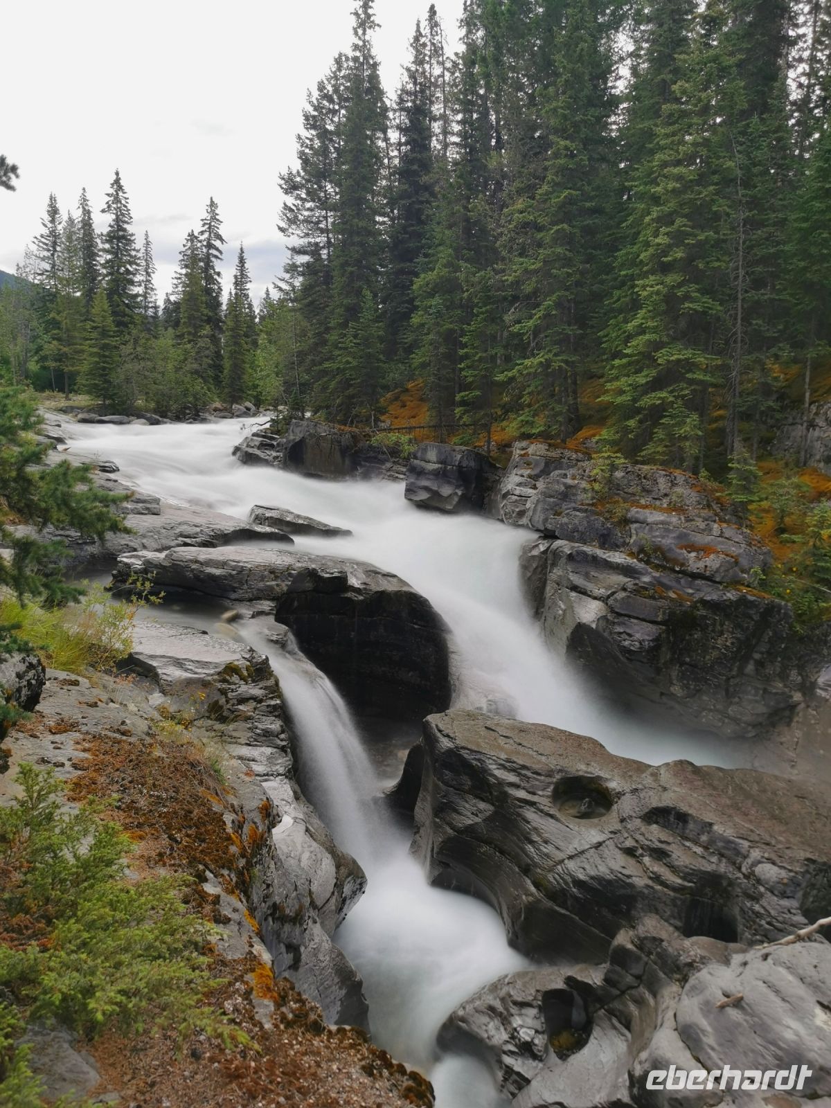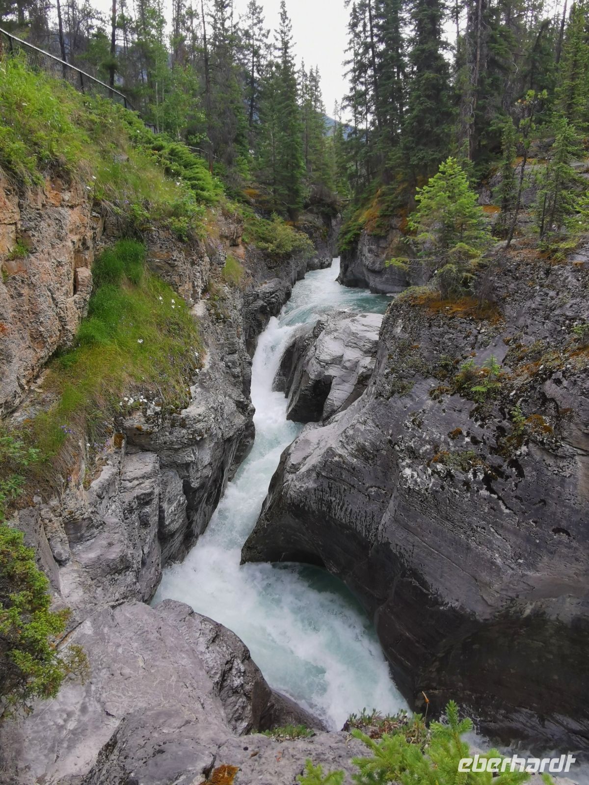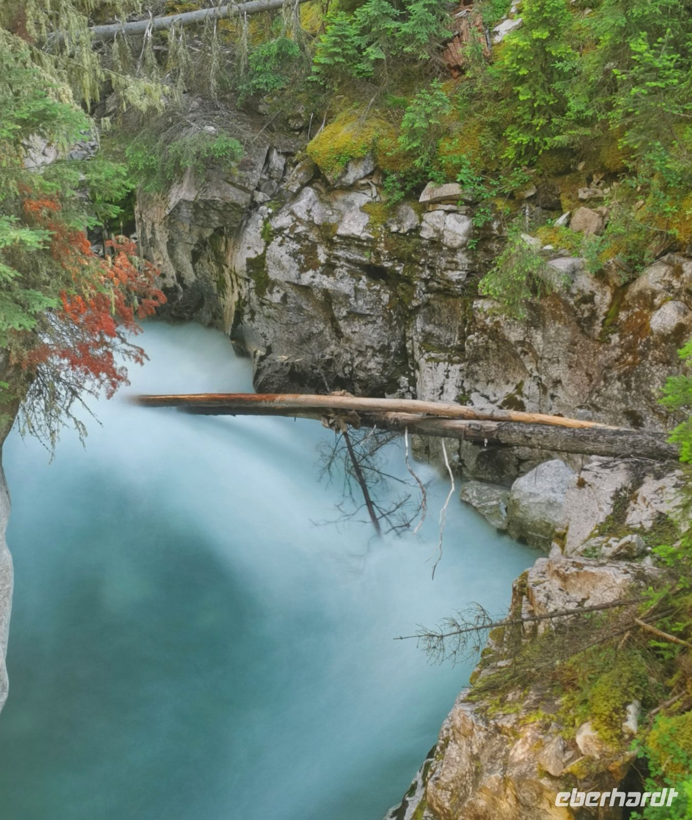 Mit etlicher Verspätung erreichen wir den Maligne Canyon, der sich mit einem Karstsystem verbindet. Er zählt zum UNESCO Weltkulturerbe und der wasserreiche Strom der durch die Schlucht fließt reißt etliche Baumstämme mit sich. Gleich neben dem Waldweg hüpfen munter die Eichhörnchen und fressen genüßlich Zapfen, so daß wir sie hervorragend beobachten können.